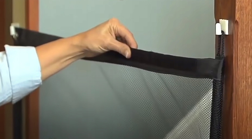 Przegrodę wystarczy naciągnąć na 4 dołączone haczyki, uprzednio umieszczone na drzwiach