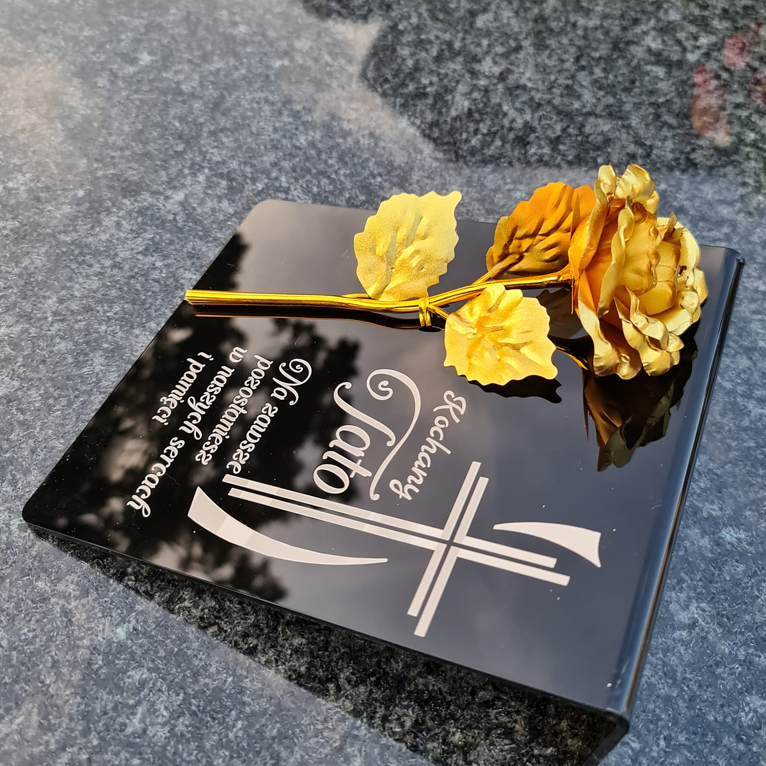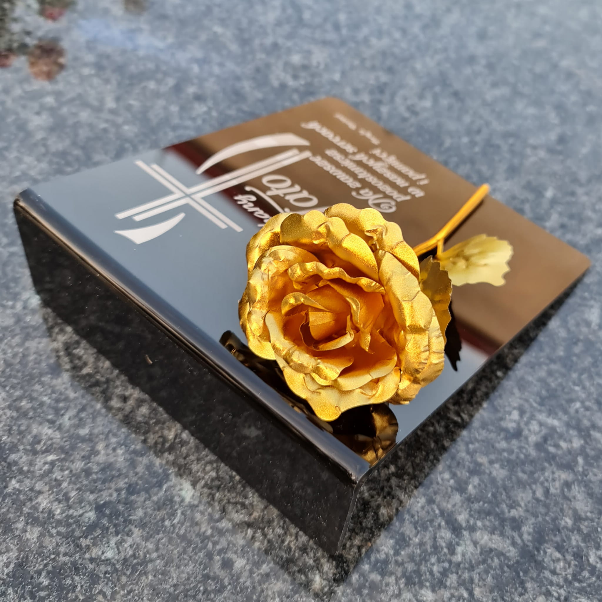 Postument został wykonany ze szkła akrylowego, ozdobiony metaliczną wieczną różą.