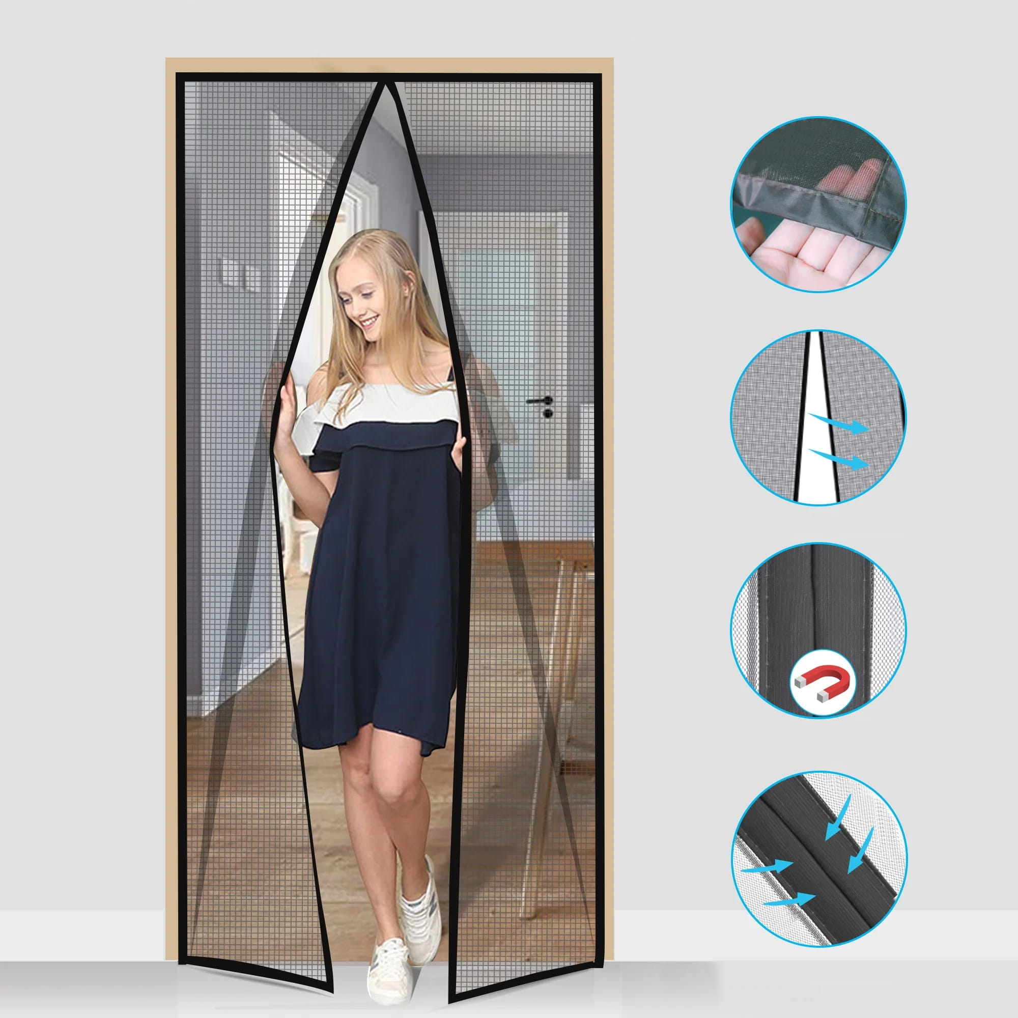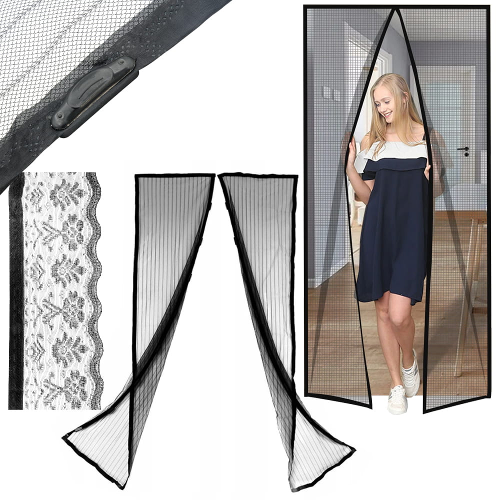 Moskitiera magnetyczna drzwiowa - dwa pasy. Zasłona składa się z dwóch pasów czarnej siatki z zamontowanymi w krawędziach pasami magnetycznymi (8sztuk kostek magnetycznych i 7 sztuk listew magnetycznych)- wychodząc przez zasłonę rozsuwamy pasy, które następnie po naszym przejściu "automatycznie" zasuwają się za nami zabezpieczając pomieszczenie. Pasuje do drzwi maksymalnie 140cm x 280cm.