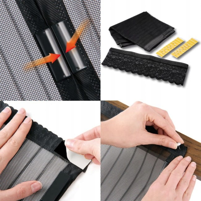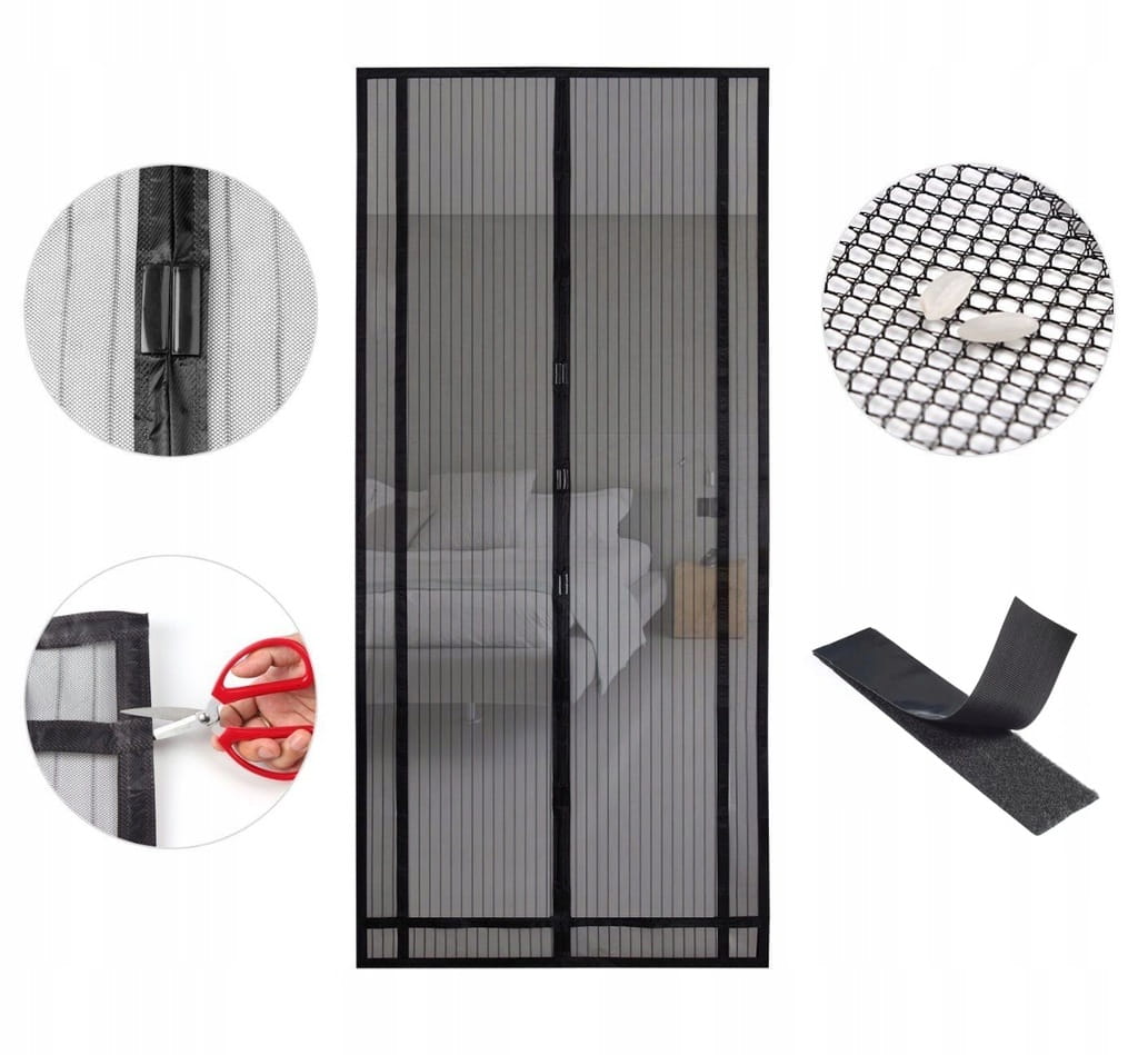 Moskitiera magnetyczna drzwiowa - dwa pasy. Zasłona składa się z dwóch pasów białej siatki z zamontowanymi w krawędziach pasami magnetycznymi - wychodząc przez zasłonę rozsuwamy pasy, które następnie po naszym przejściu "automatycznie" zasuwają się za nami zabezpieczając pomieszczenie. Pasuje do drzwi maksymalnie 160cm x 240cm