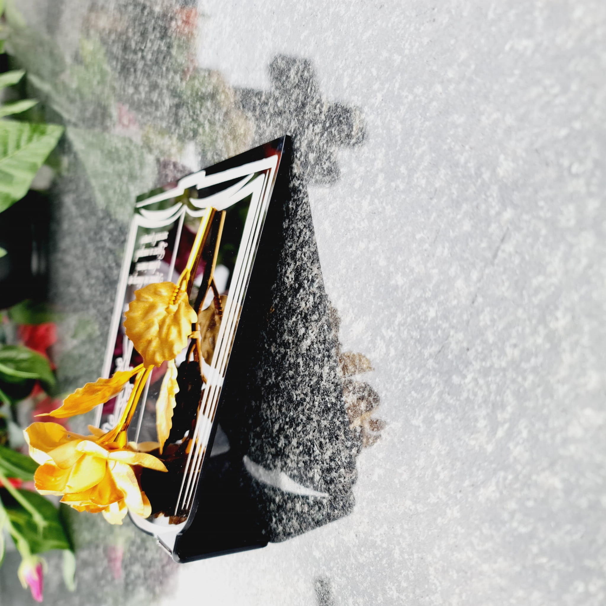 Postument został wykonany ze szkła akrylowego, ozdobiony metaliczną wieczną różą.