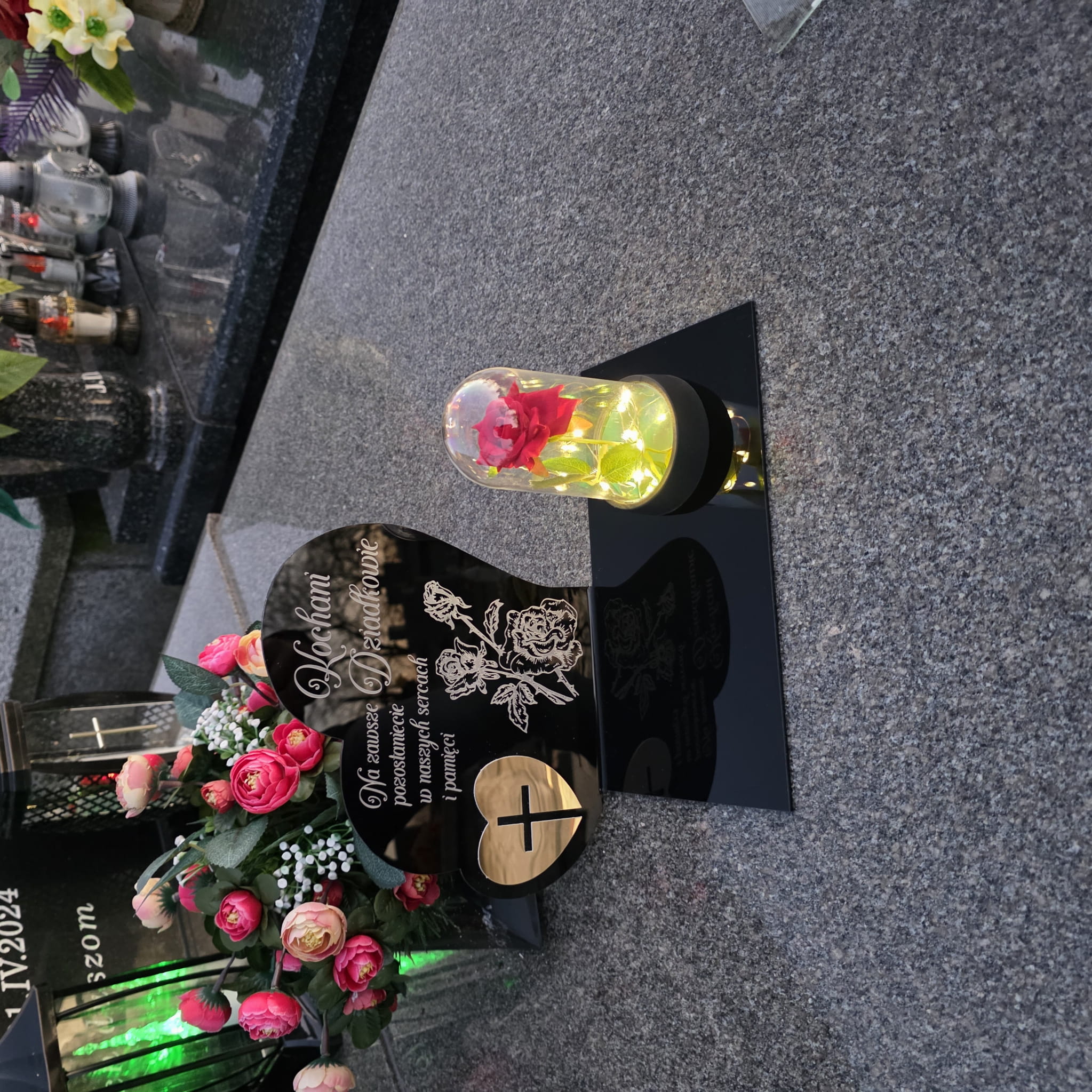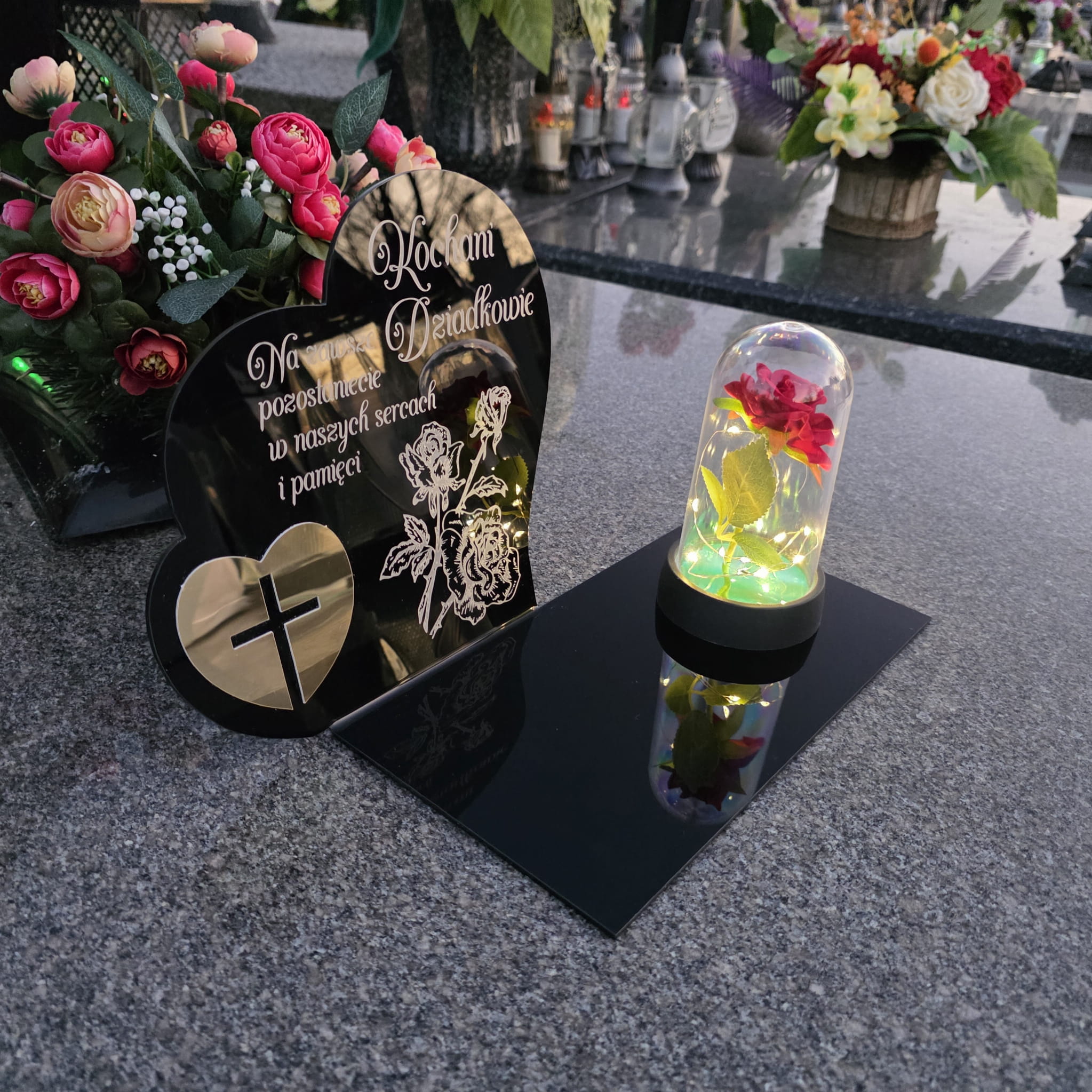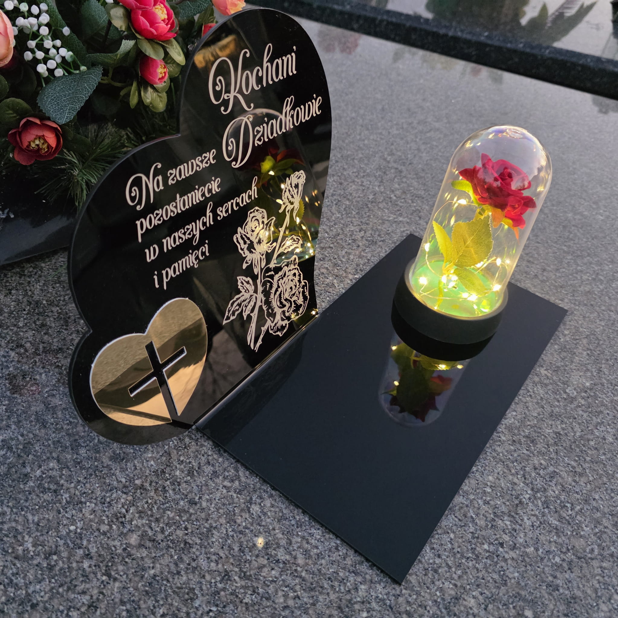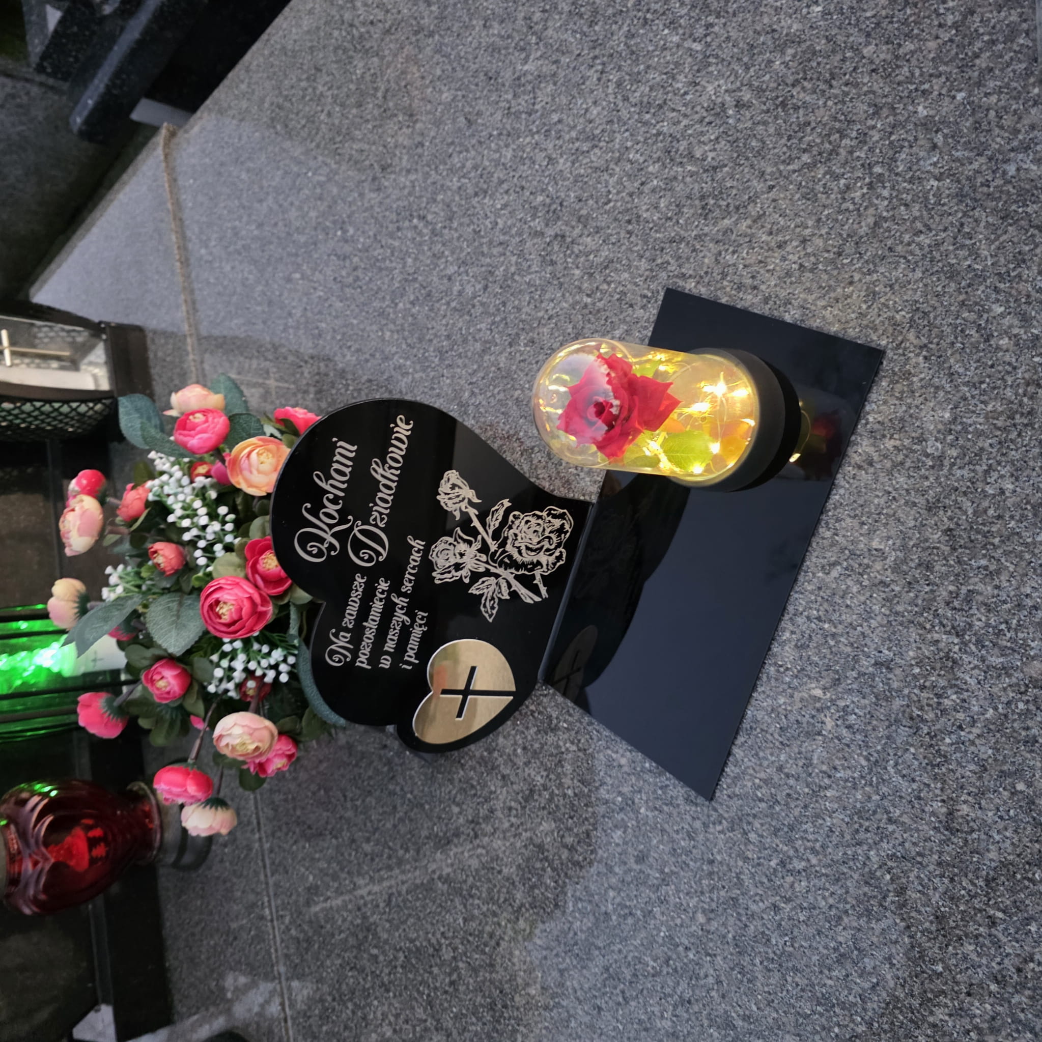 DEKORACJA na grób GRAWEROWANY ZNICZ podstawka na cmentarz RÓŻA DLA DZIADKÓW