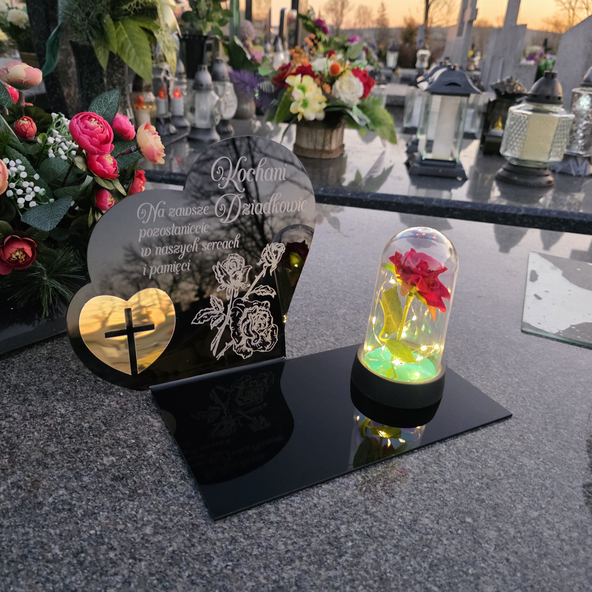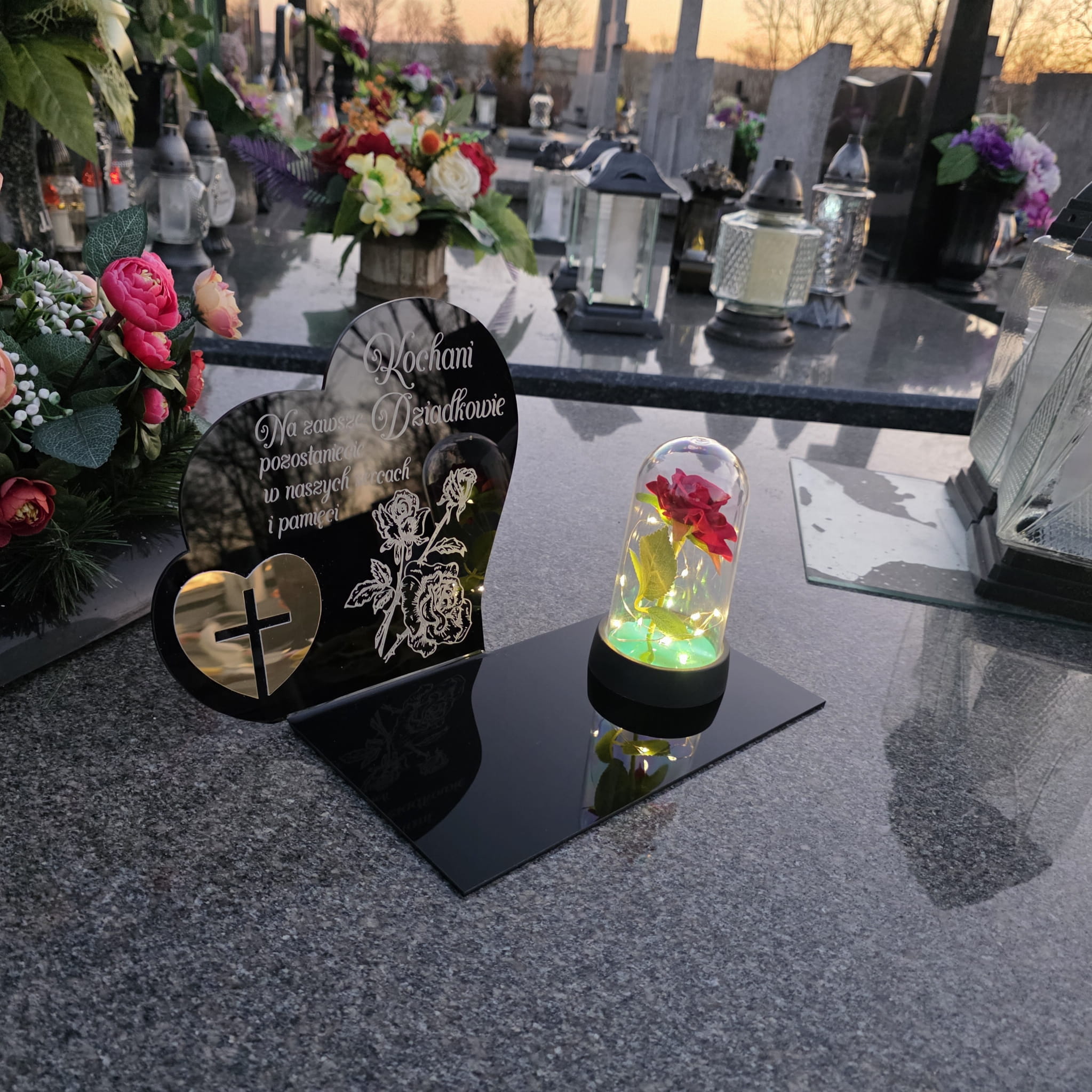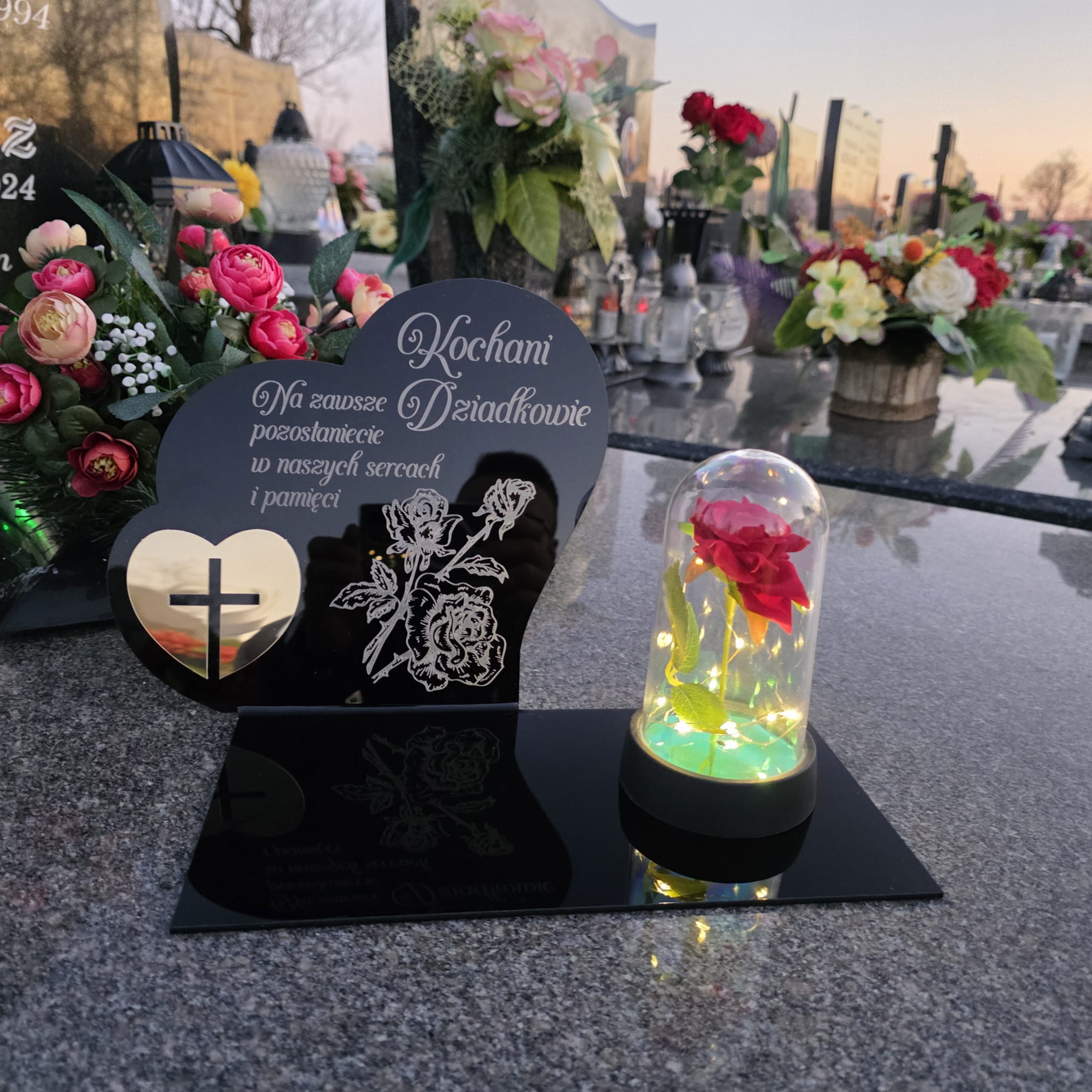 DEKORACJA na grób GRAWEROWANY ZNICZ podstawka na cmentarz RÓŻA DLA DZIADKÓW
