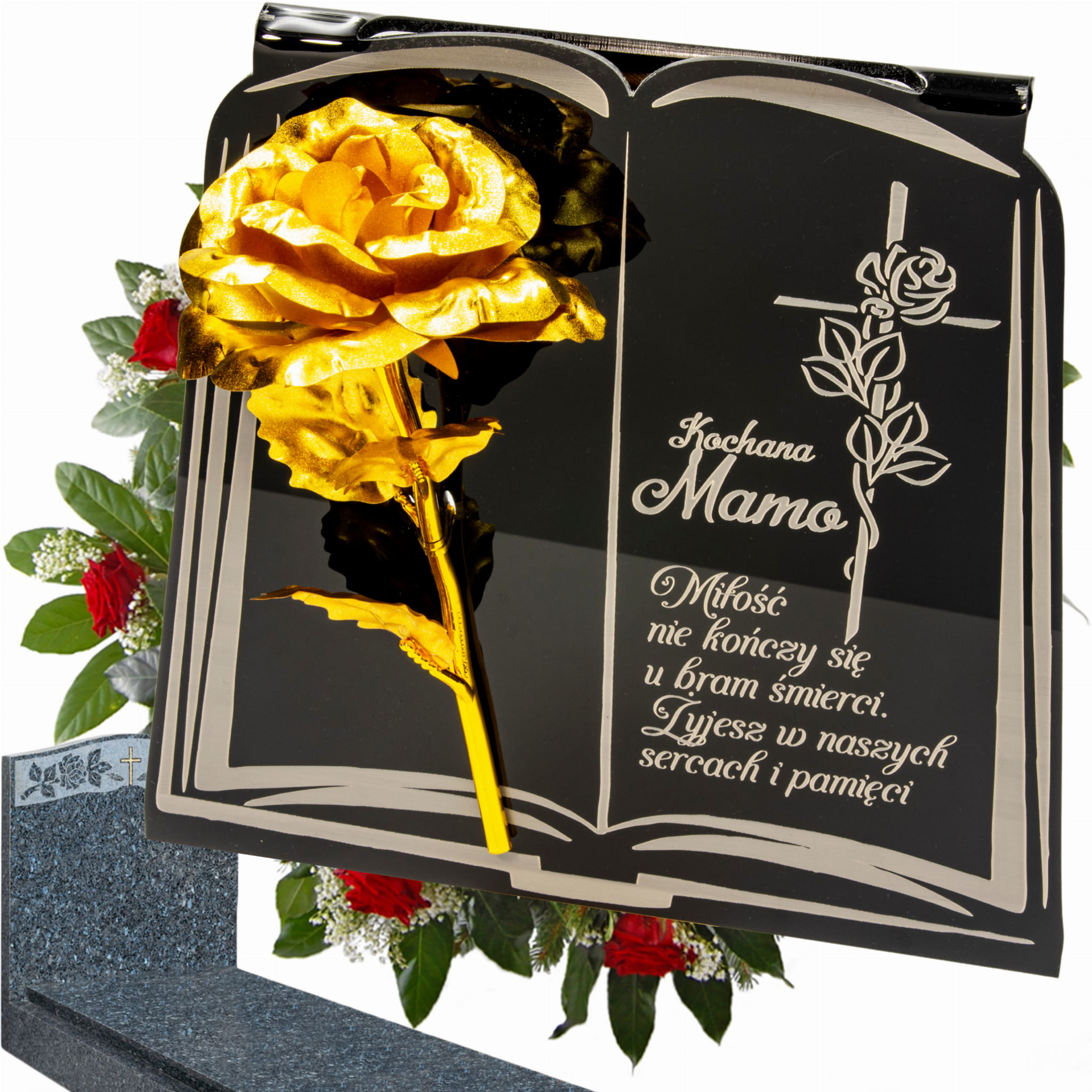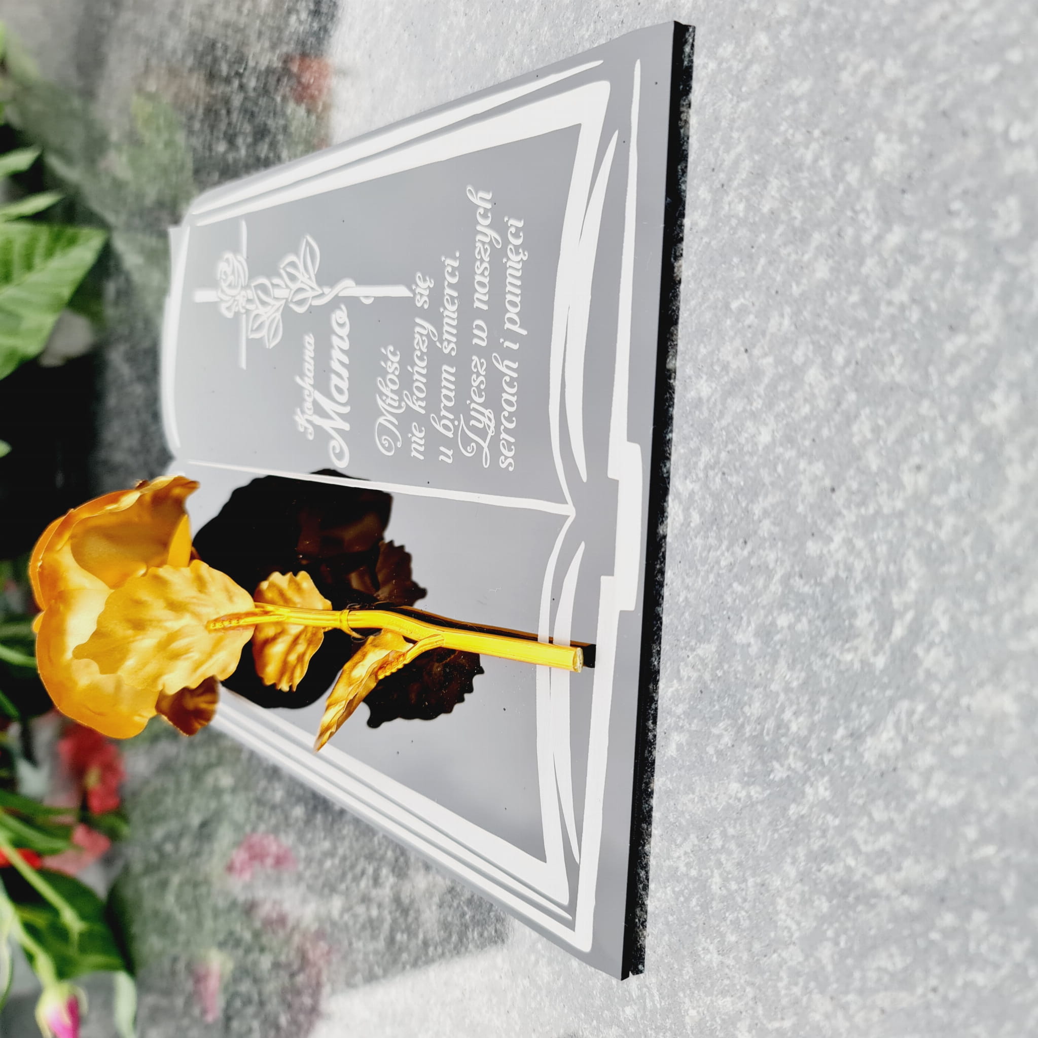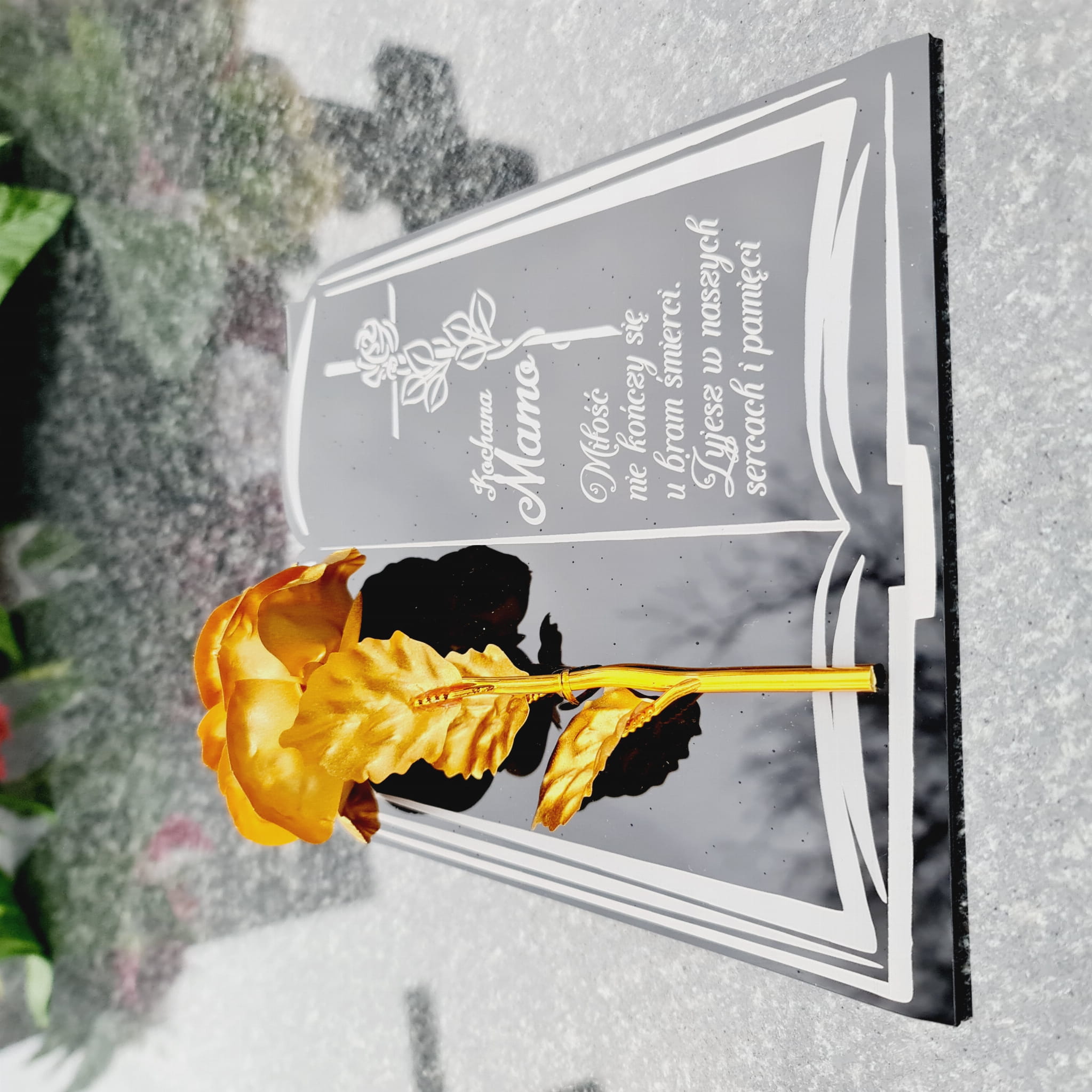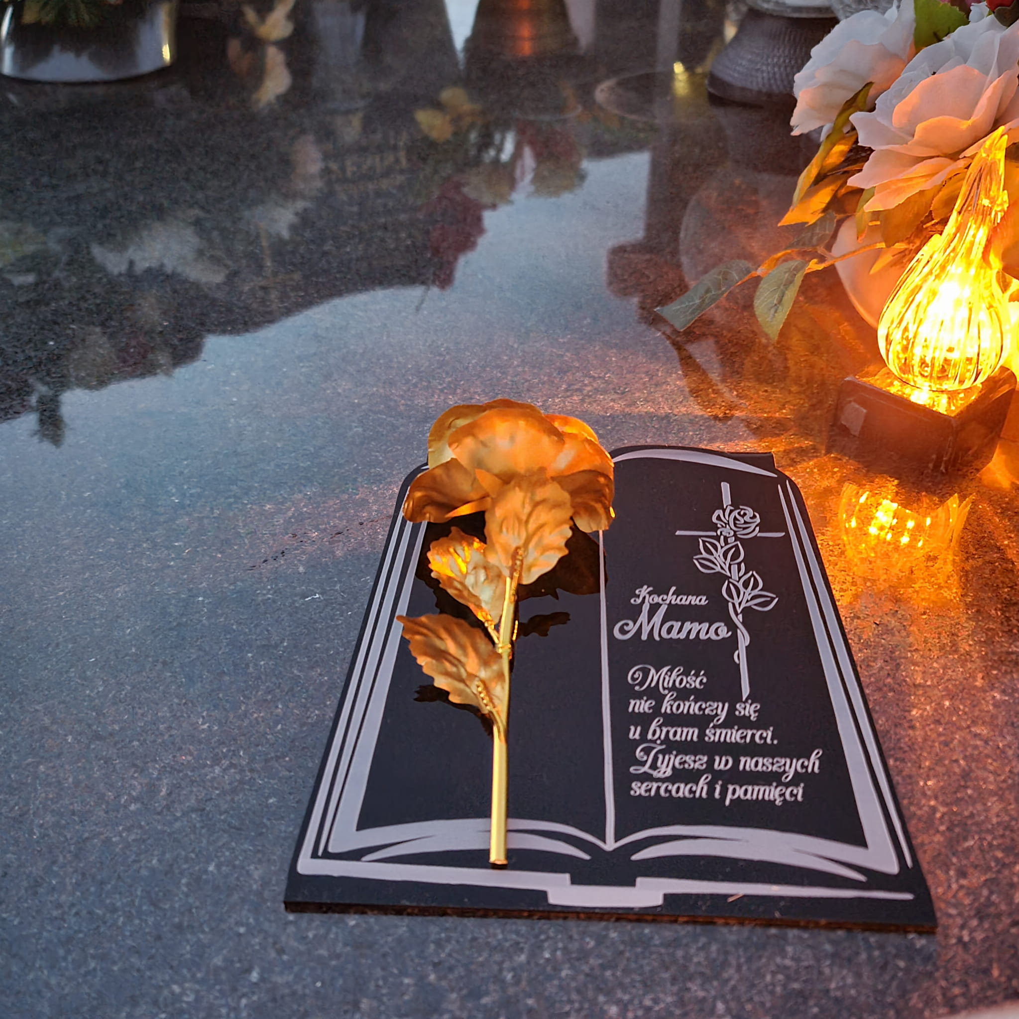 DEKORACJA na grób GRAWEROWANY ZNICZ podstawka na cmentarz RÓŻA DLA MAMY