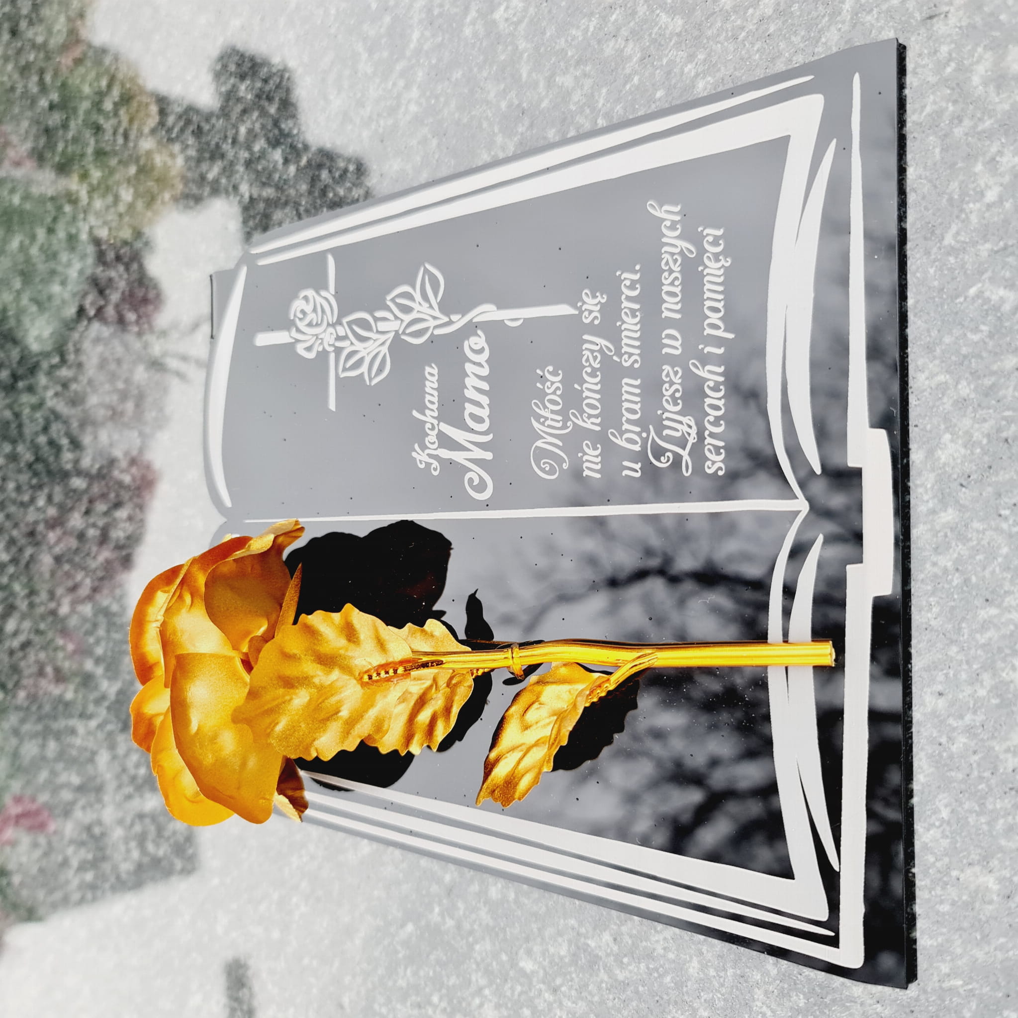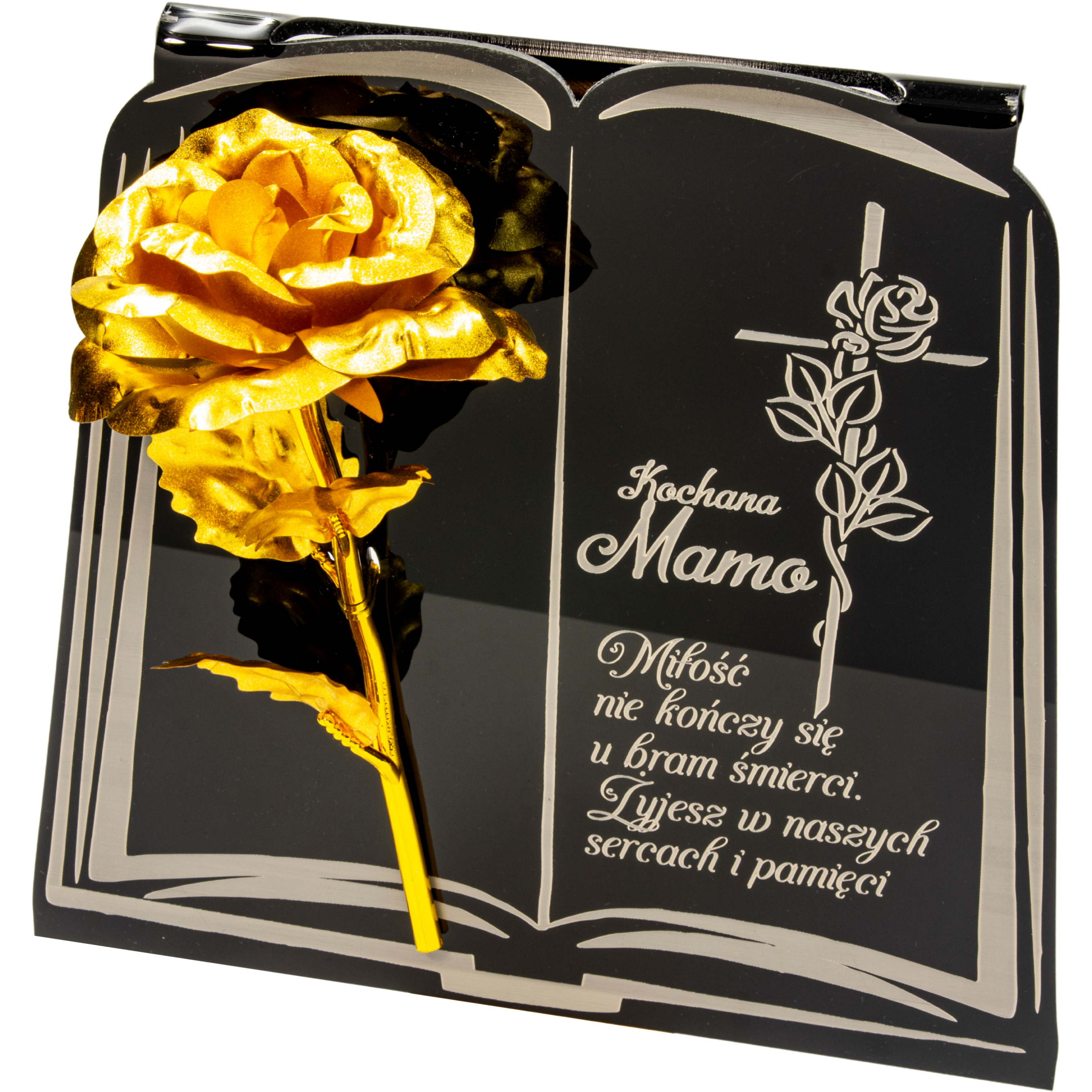 Złota róża na postumencie z grawerem dla MAMY