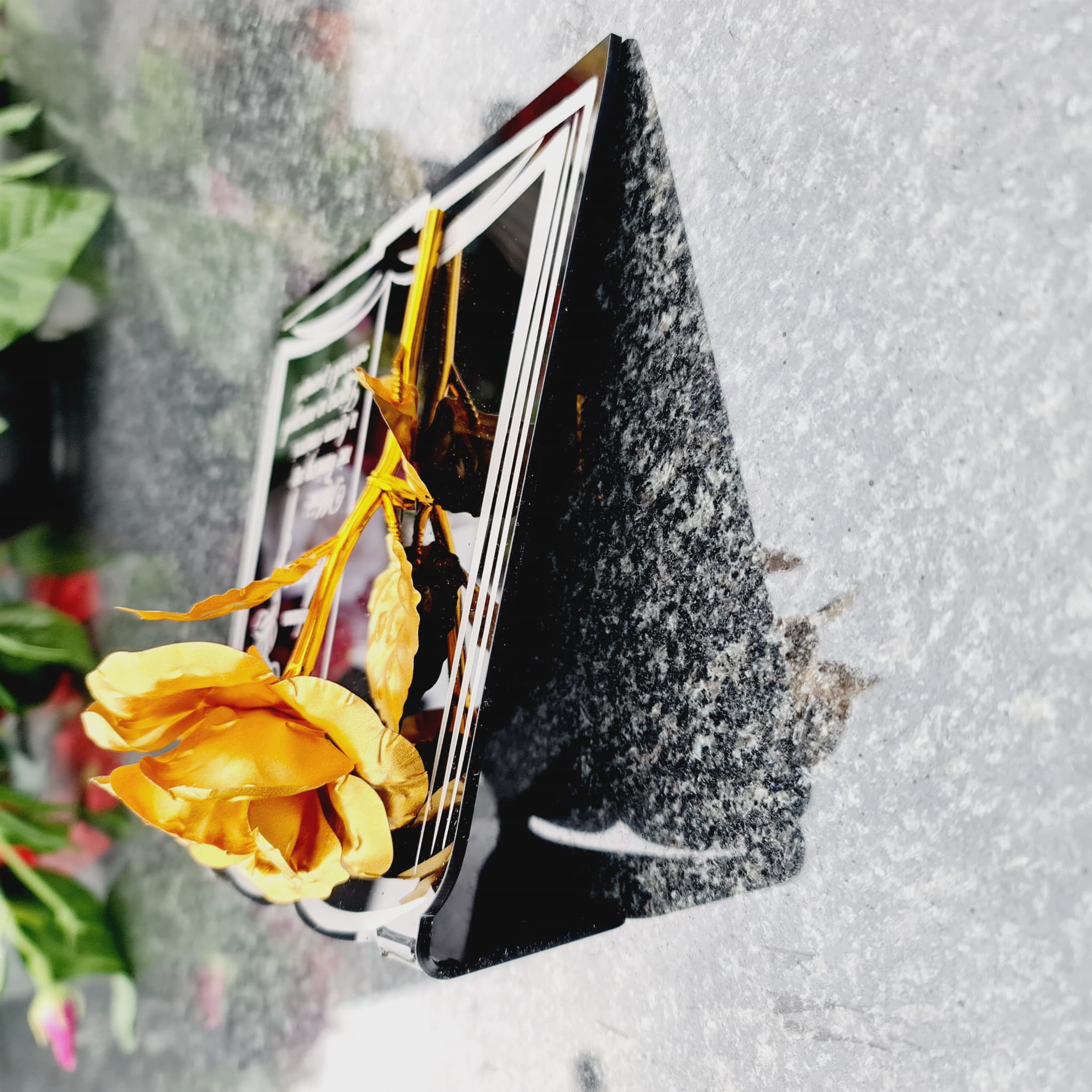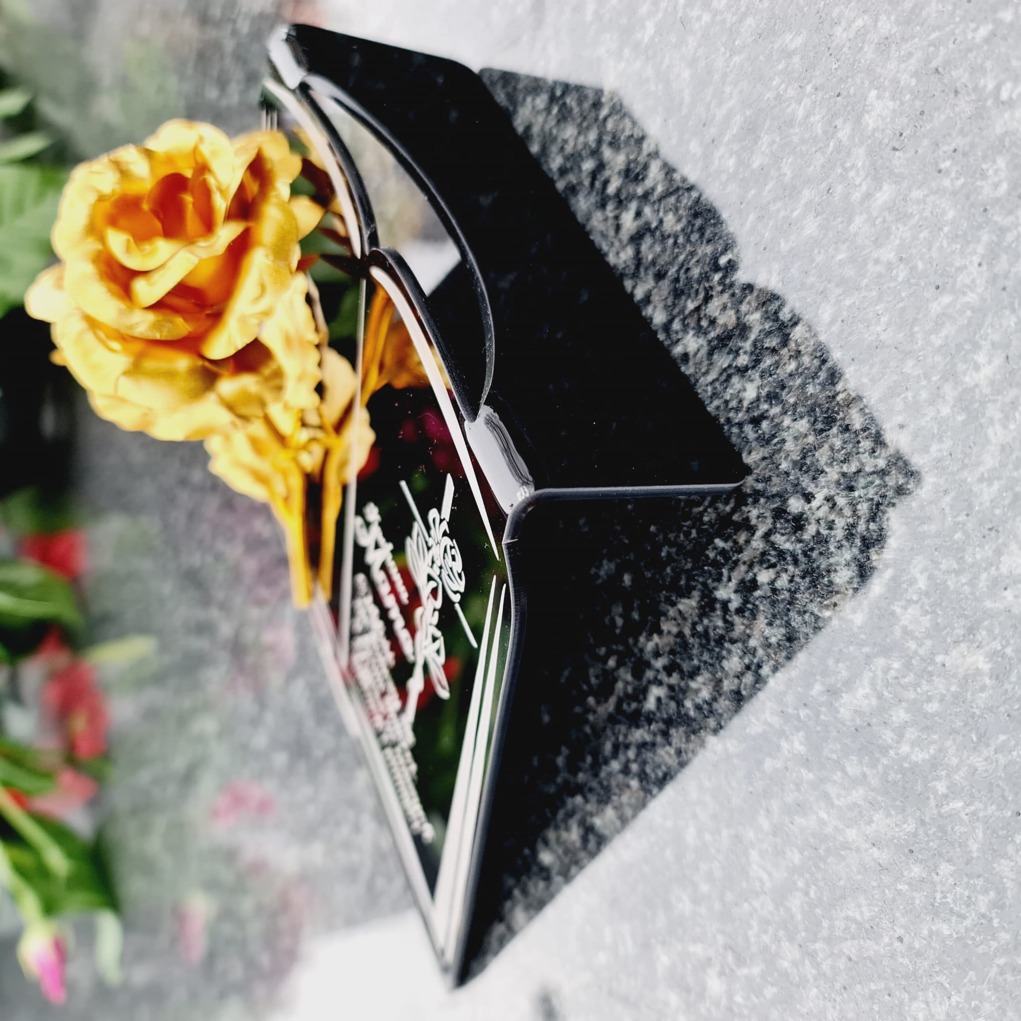 Postument został wykonany ze szkła akrylowego, ozdobiony metaliczną wieczną różą.