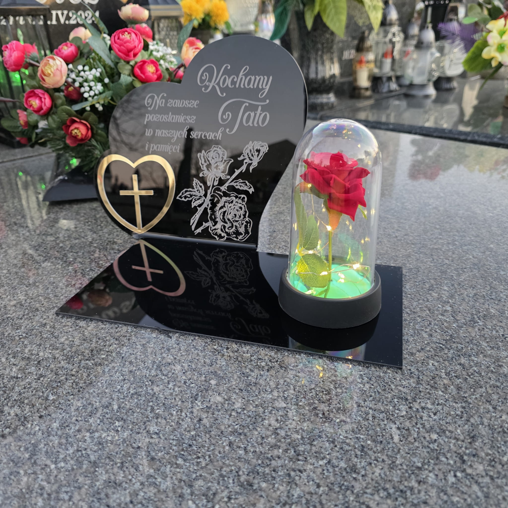 DEKORACJA na grób GRAWEROWANY ZNICZ podstawka na cmentarz RÓŻA DLA TATY