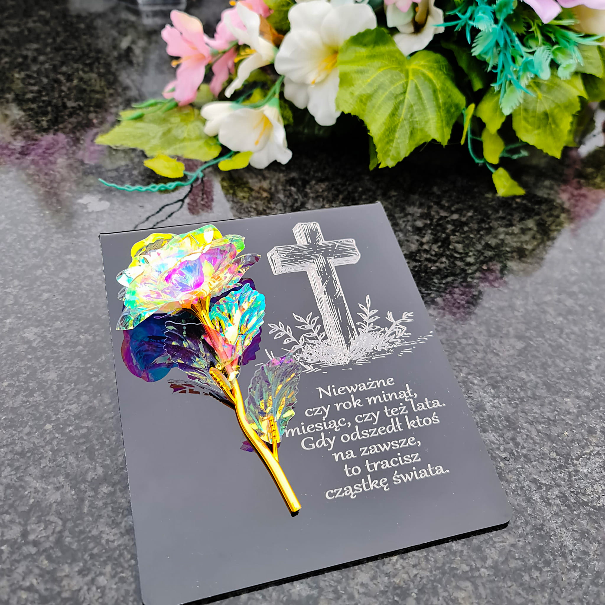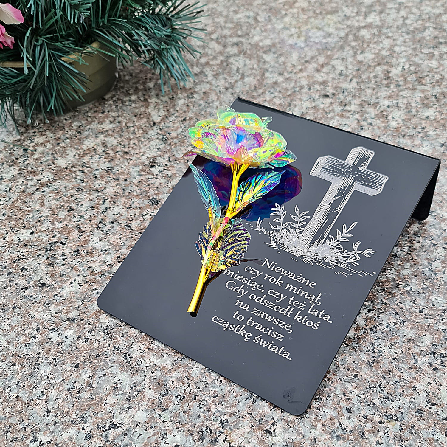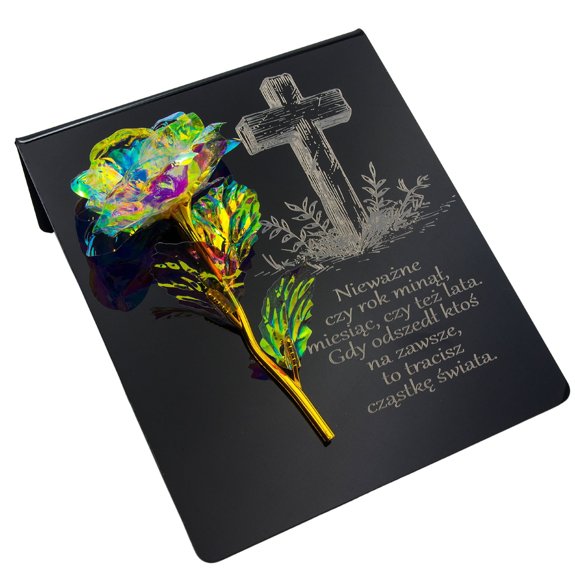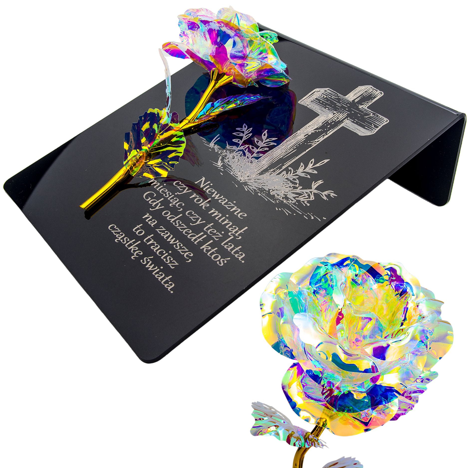 DEKORACJA na grób GRAWEROWANY ZNICZ z Krzyżem i Różą podstawka na cmentarz WIECZNA RÓŻA Tęczowa