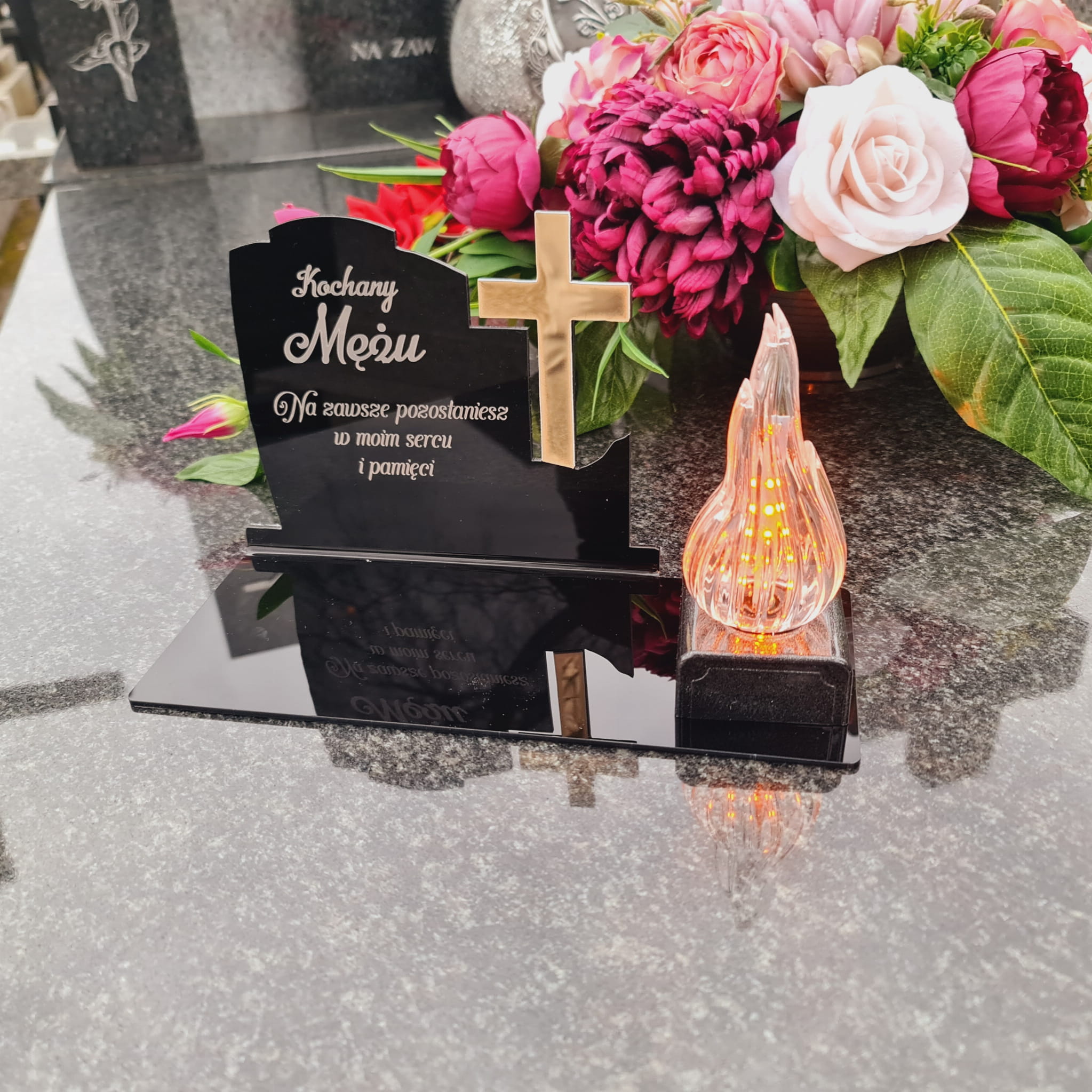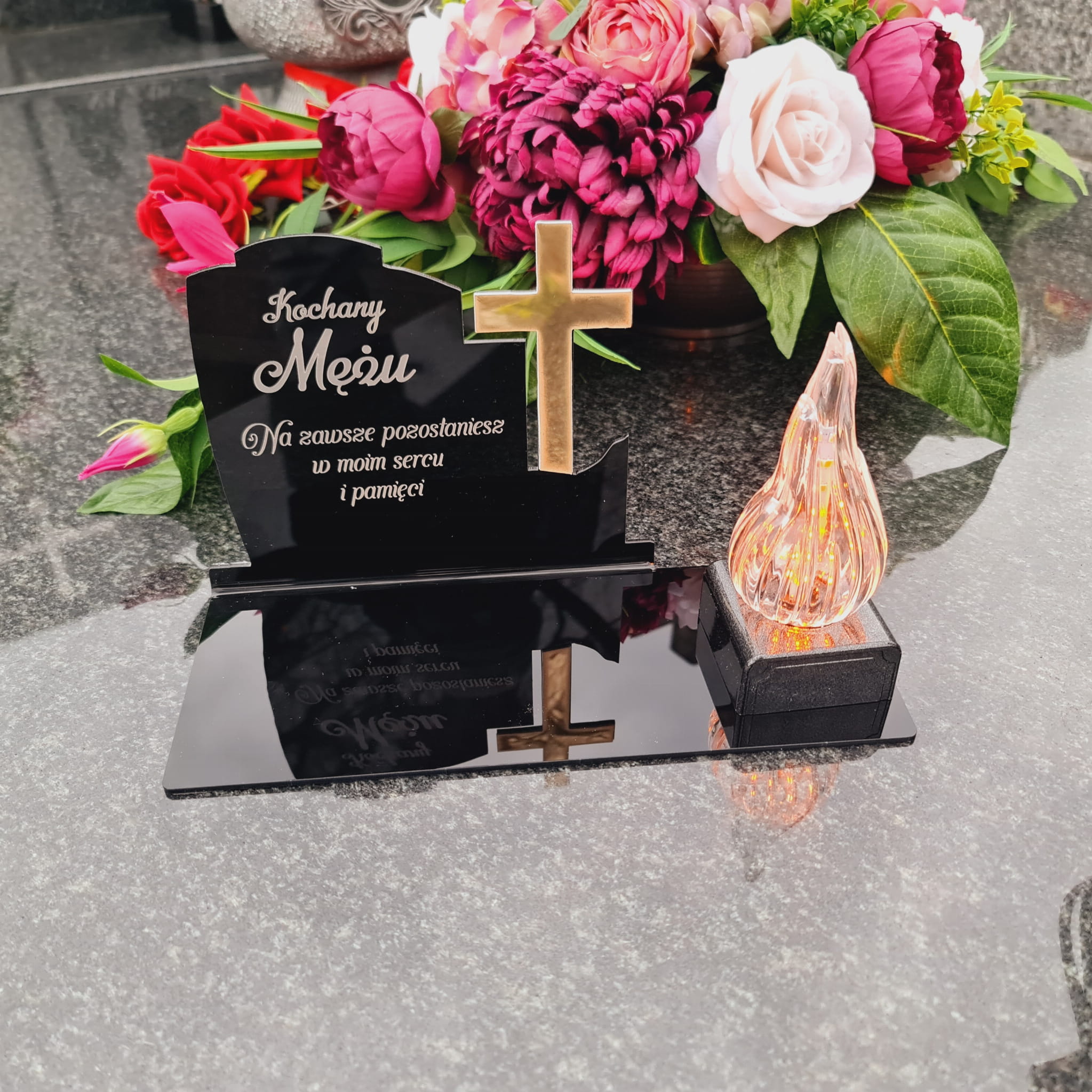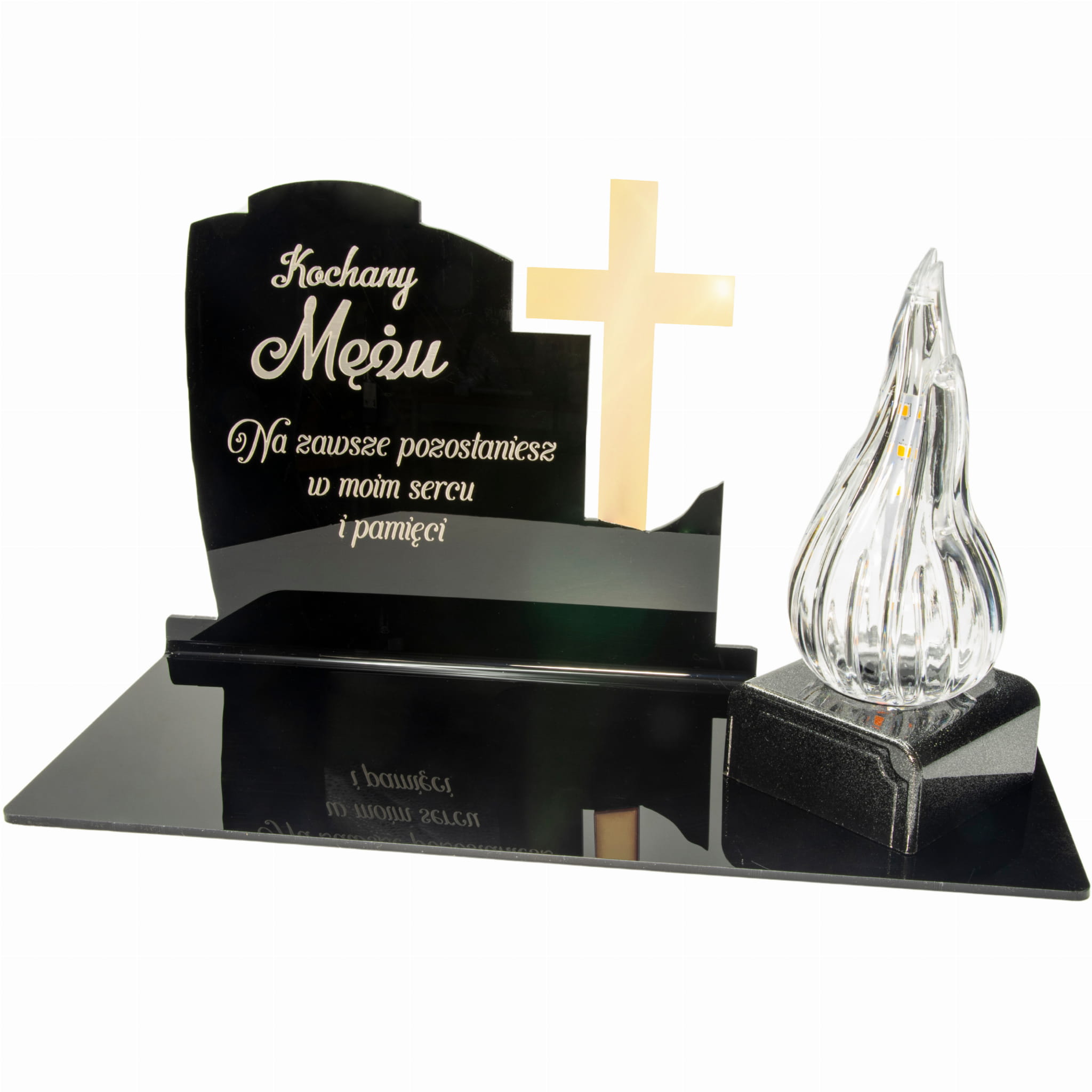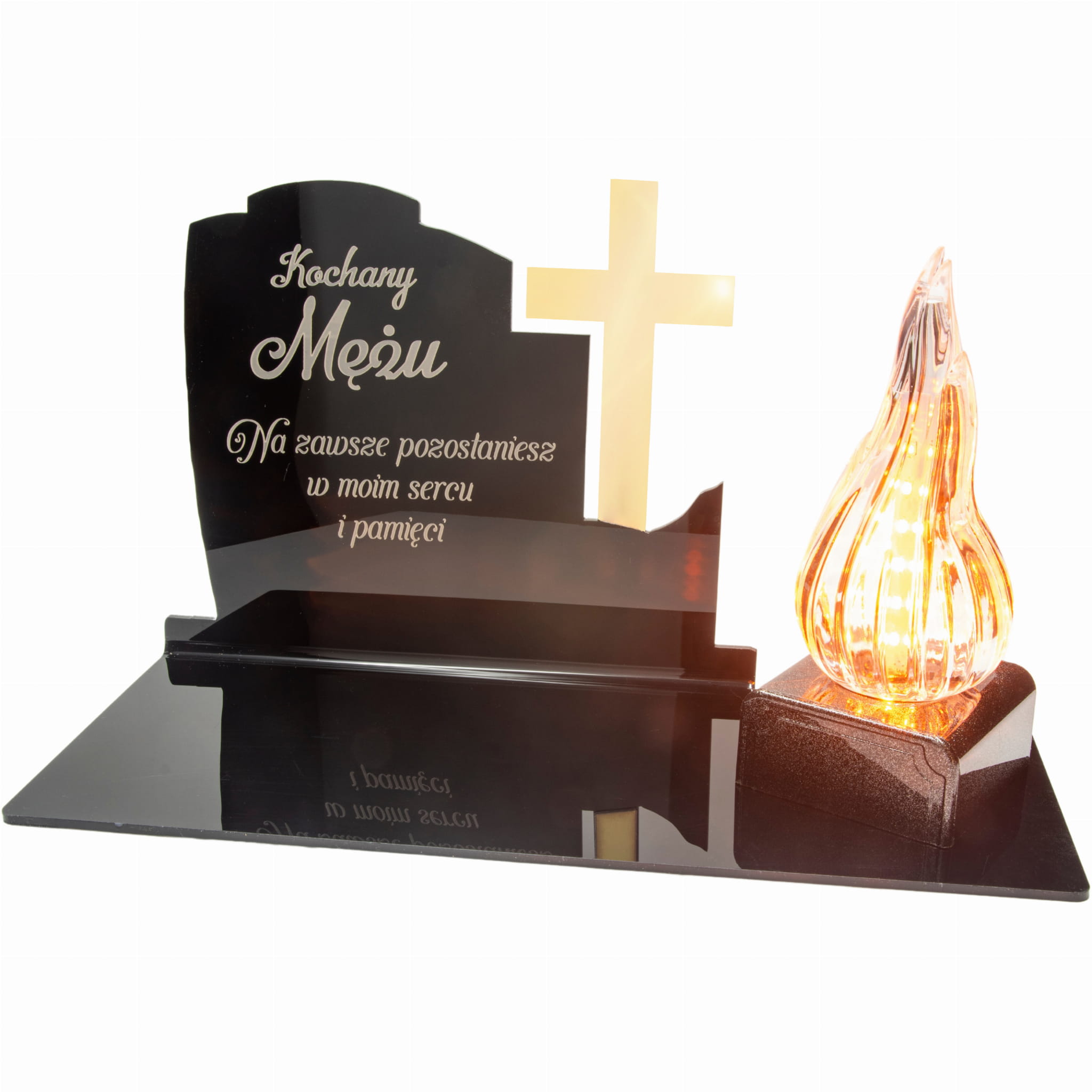 WIECZNY ZNICZ NA GRÓB Z GRAWEROWANĄ PODSTAWKĄ ZE SZKŁA AKRYLOWEGO