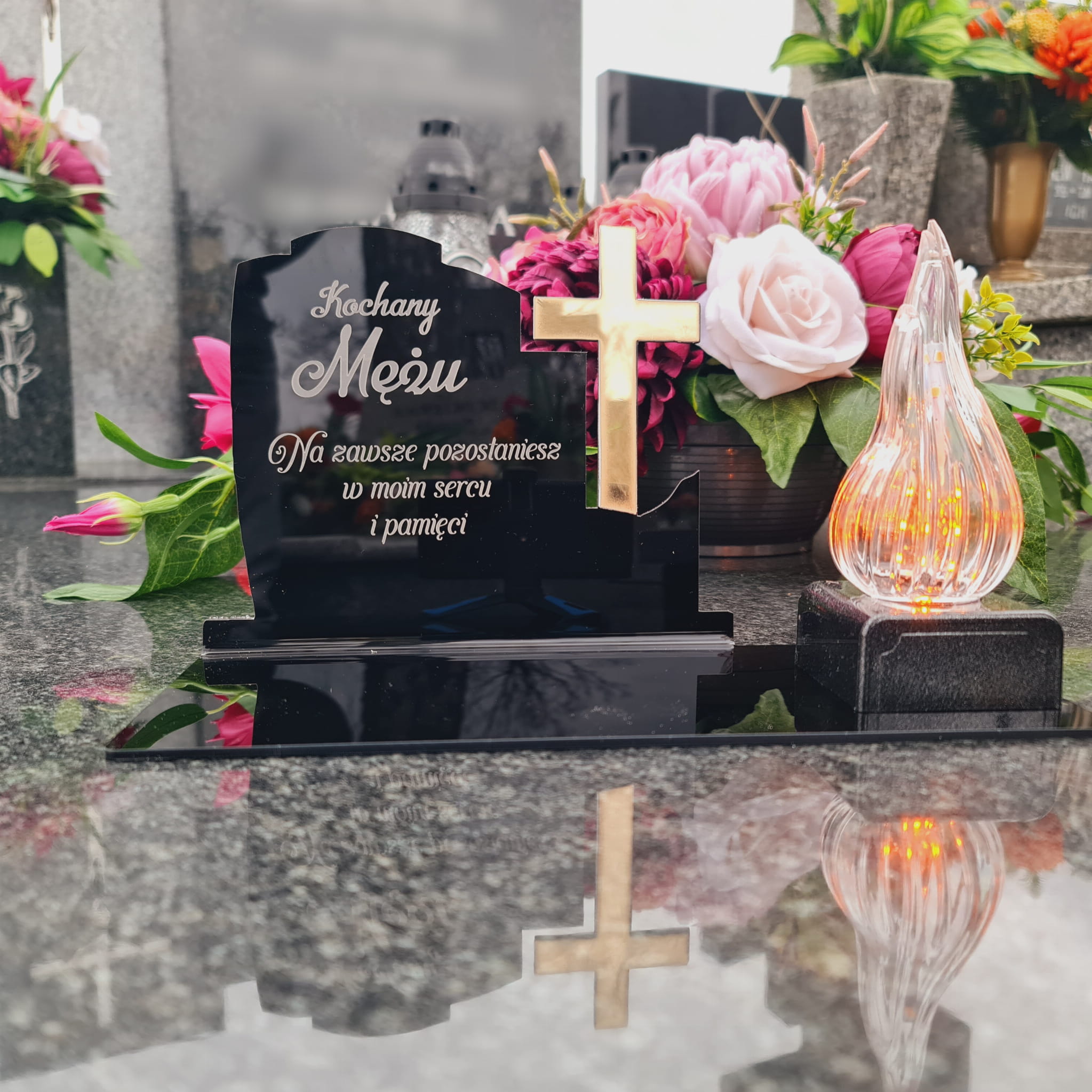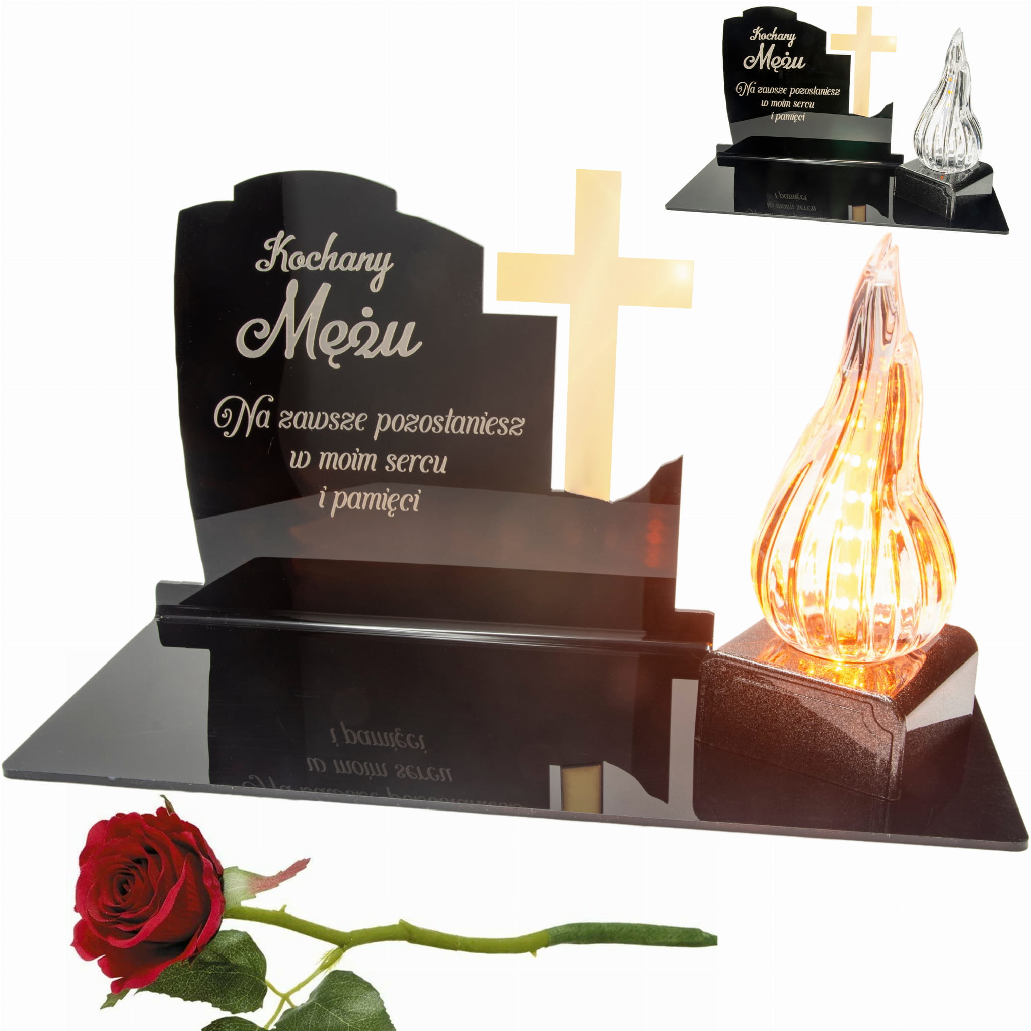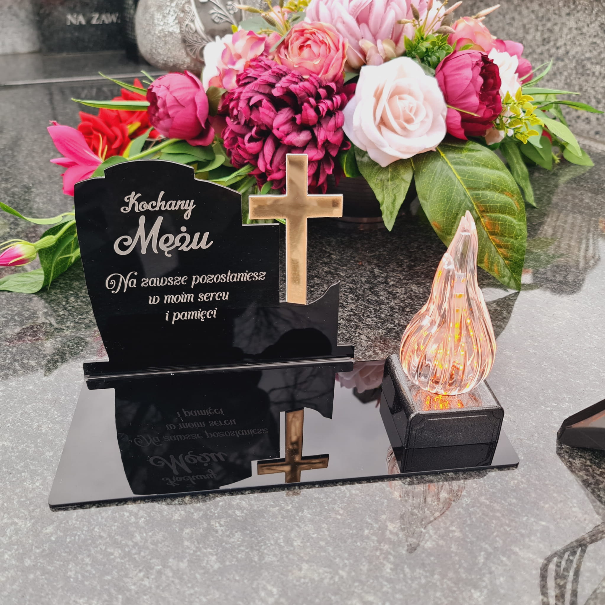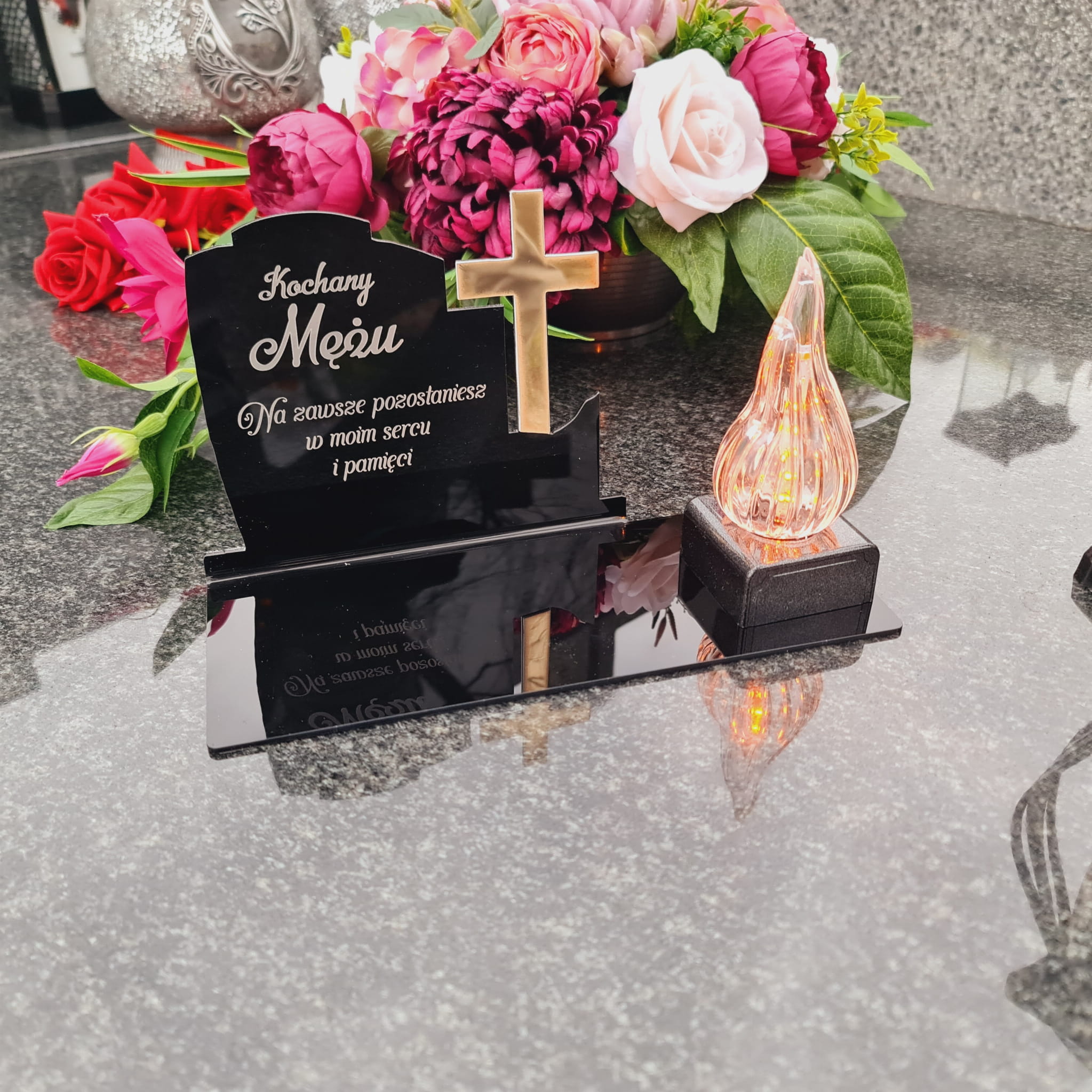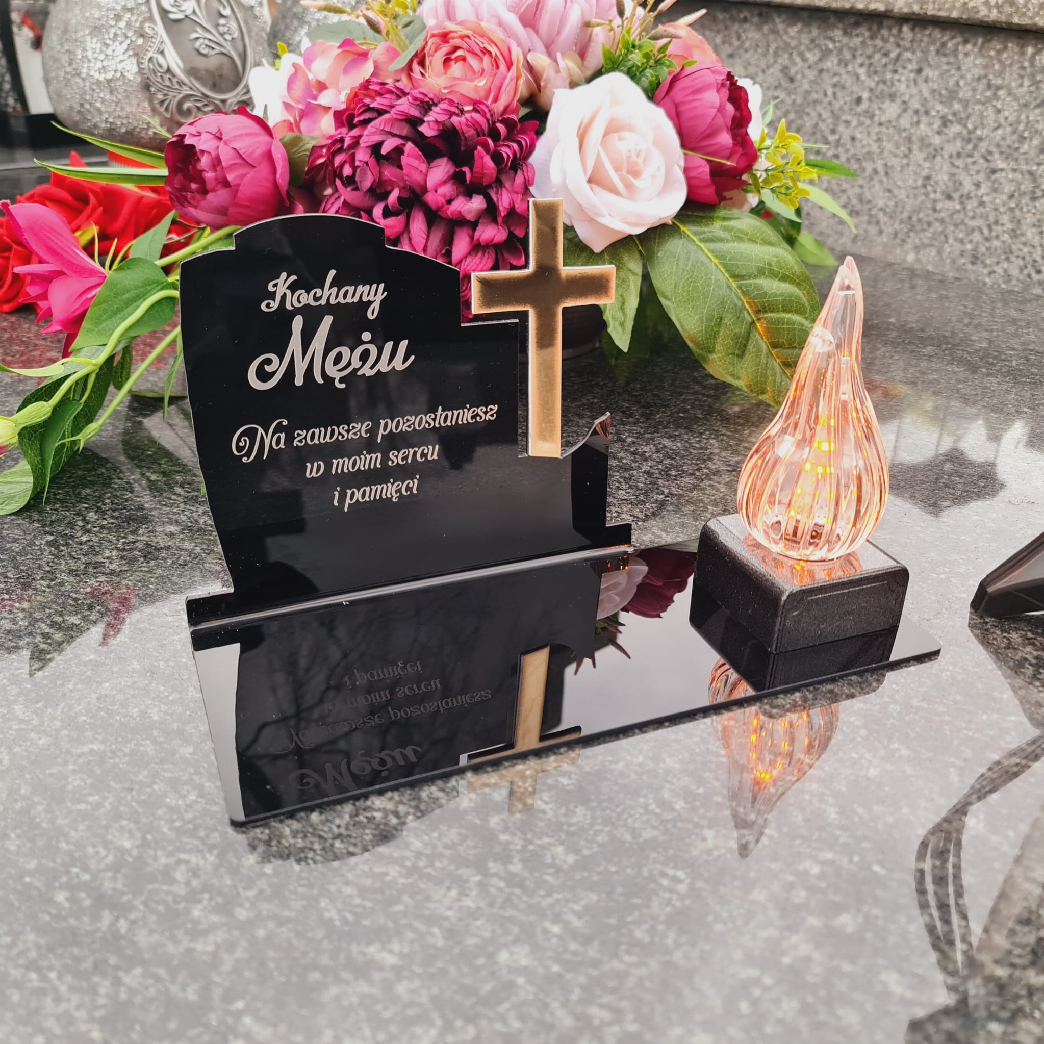 WIECZNY ZNICZ NA GRÓB Z GRAWEROWANĄ PODSTAWKĄ ZE SZKŁA AKRYLOWEGO