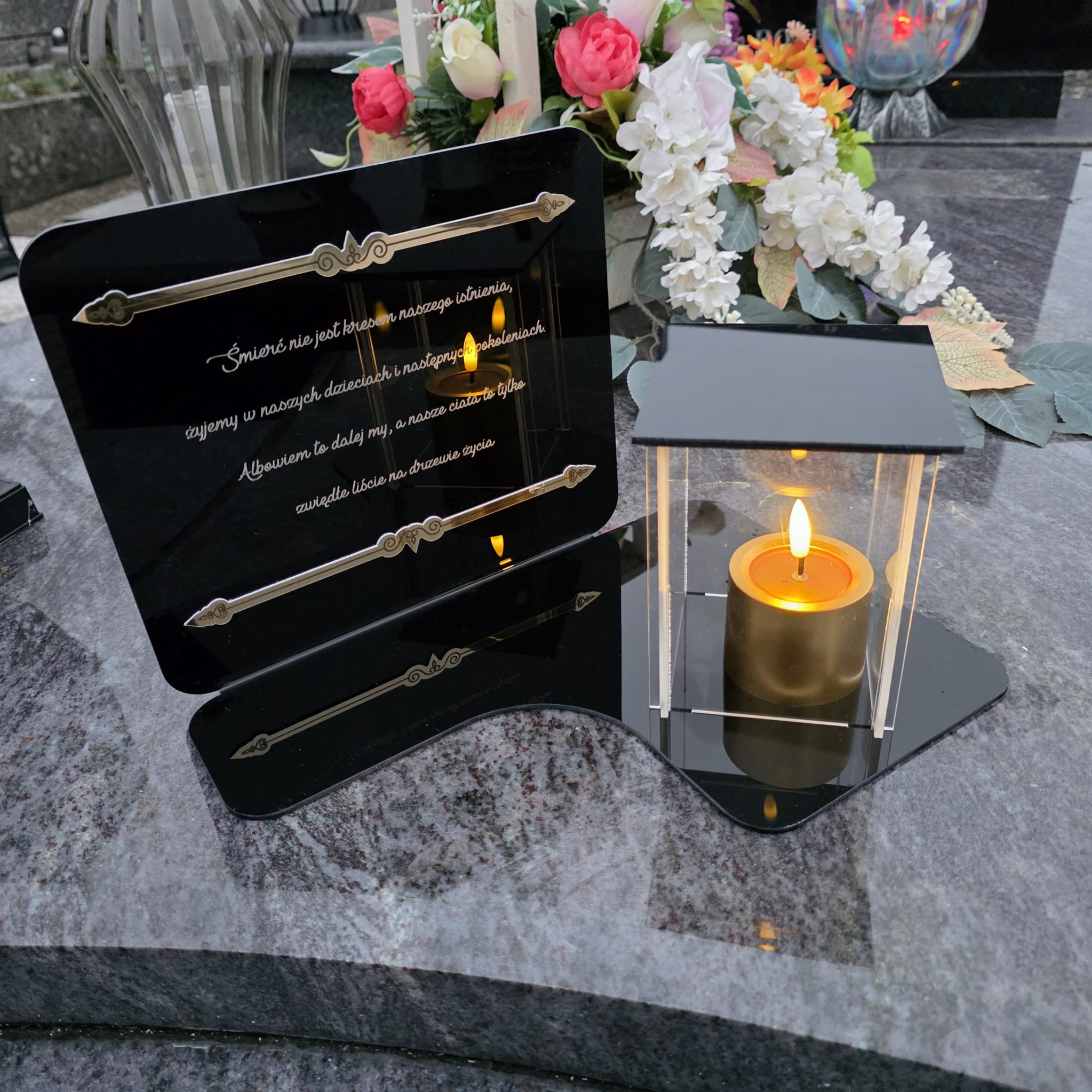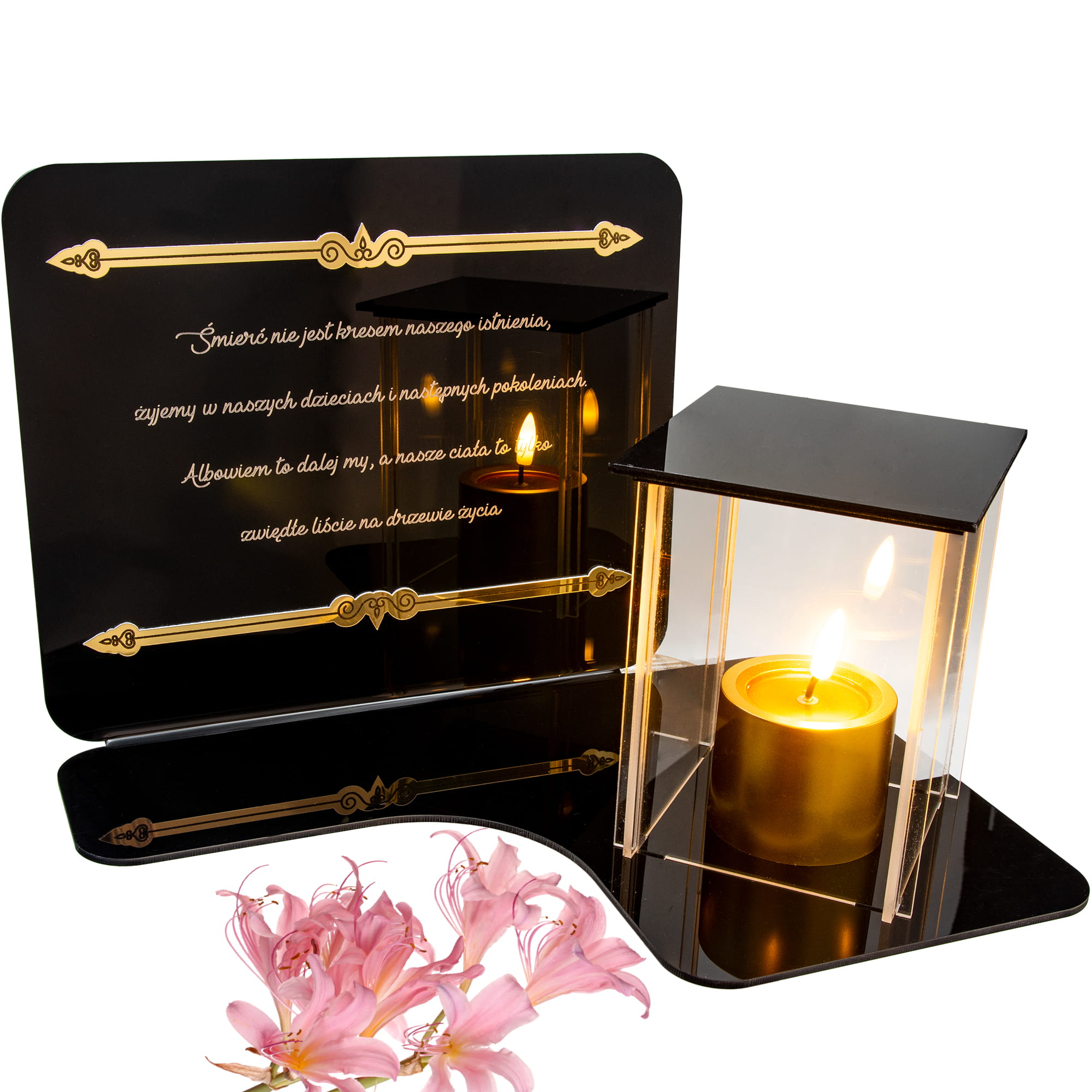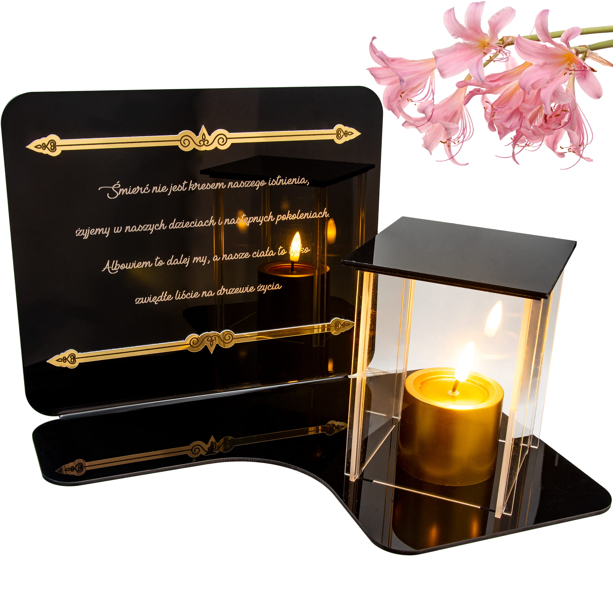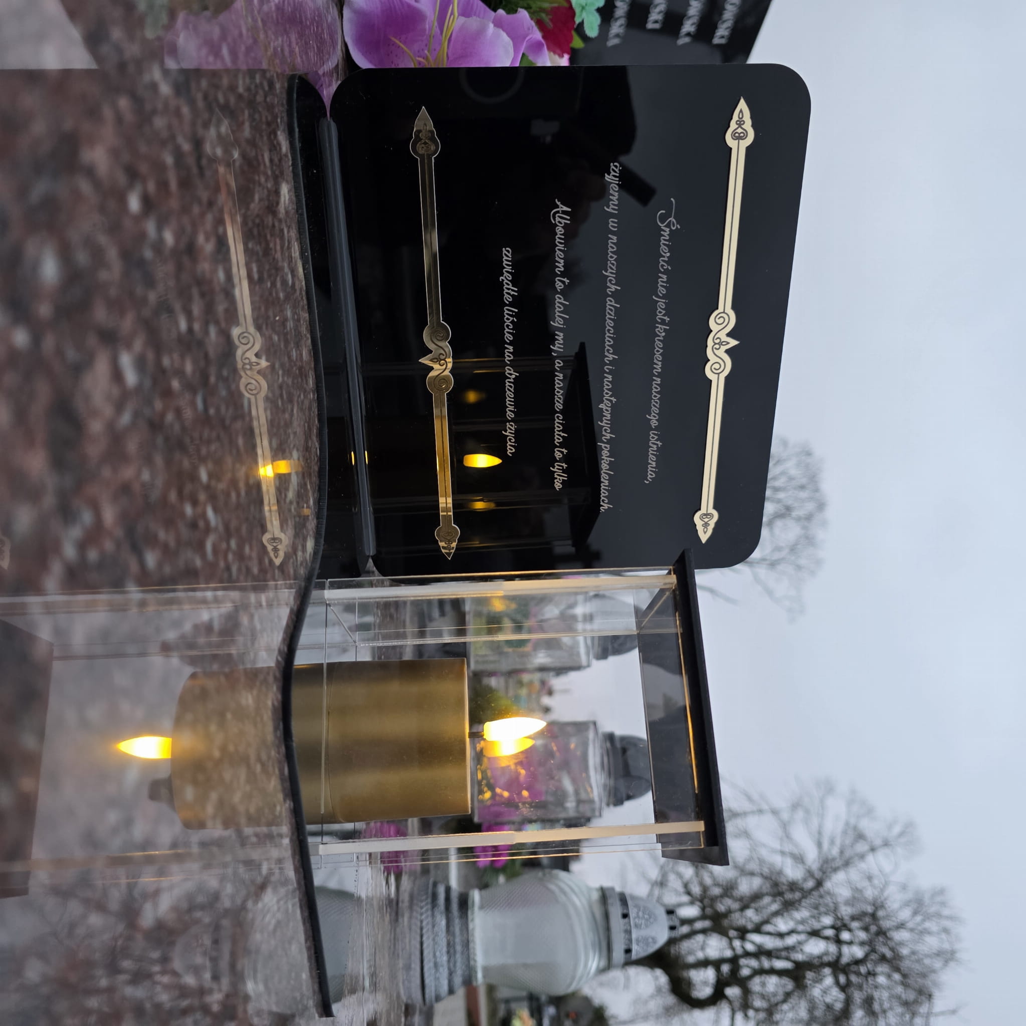 WIECZNY ZNICZ NA GRÓB Z GRAWEROWANĄ PODSTAWKĄ ZE SZKŁA AKRYLOWEGO