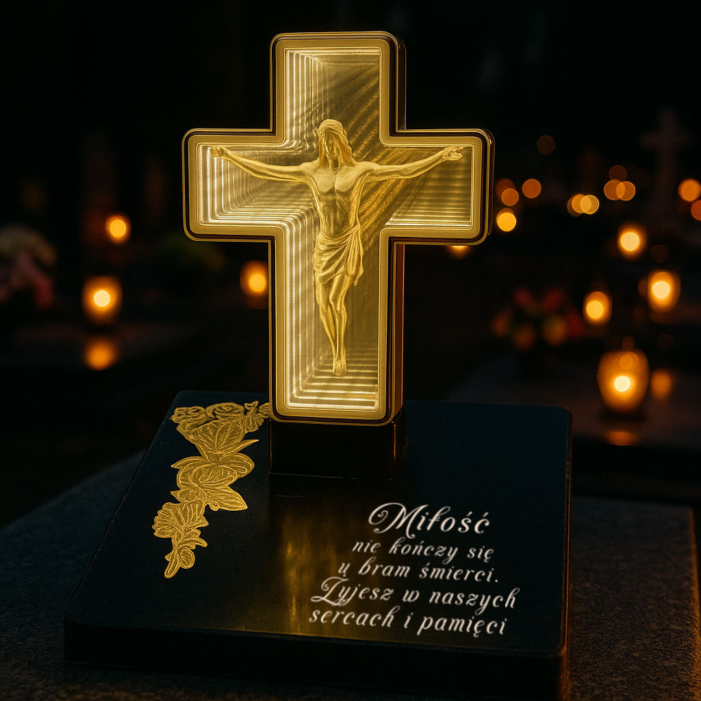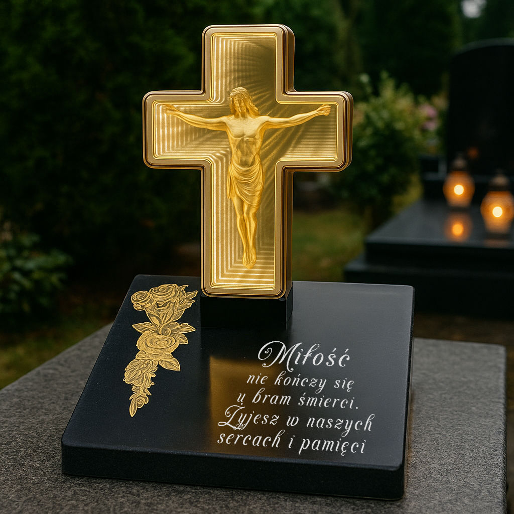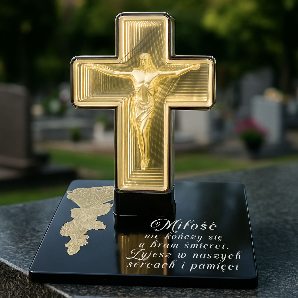 Nowoczesny znicz nagrobny z iluminowanym, przestrzennym krzyżem LED to elegancki i trwały sposób na wyrażenie wiecznej pamięci. Efekt nieskończonej głębi świetlnej tworzy niezwykłą aurę refleksji i duchowości — widoczny zarówno w dzień, jak i po zmroku.
