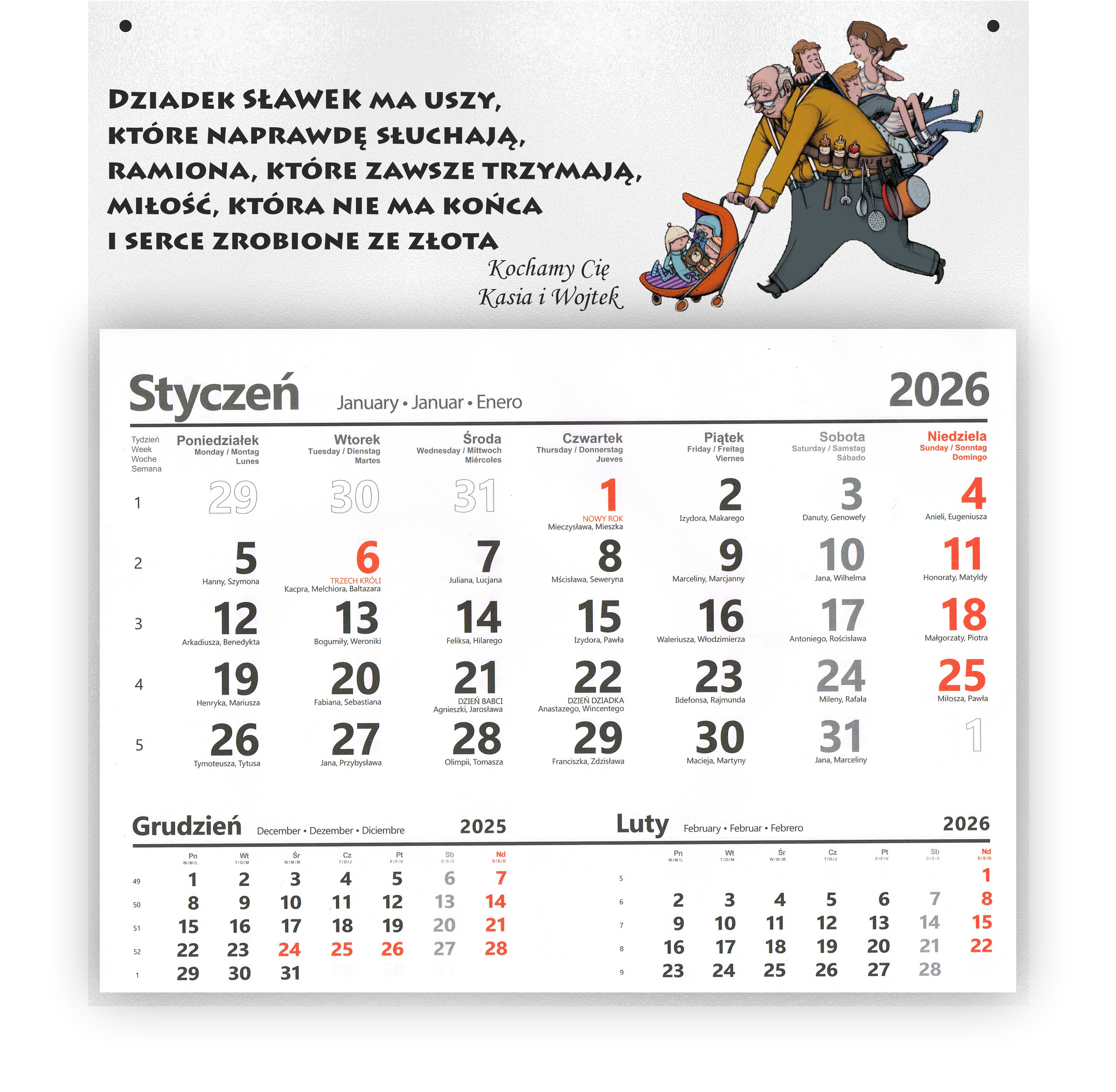 KALENDARZ 2026 NA DZIEŃ DZIADKA Z NADRUKOWANYMI IMIONAMI I PERSONALIZOWANY