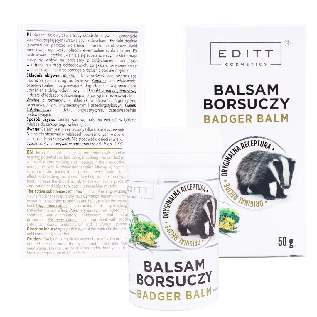 Balsam Borsuczy – Balsam ziołowy zawierający składniki aktywne o potencjale kojąco-odprężającym i ułatwiającym oddychanie. Produkt idealnie sprawdzi się podczas wcierania i masażu na obszarze klatki piersiowej, szyi, karku, pleców ewentualnie czoła i skroni.