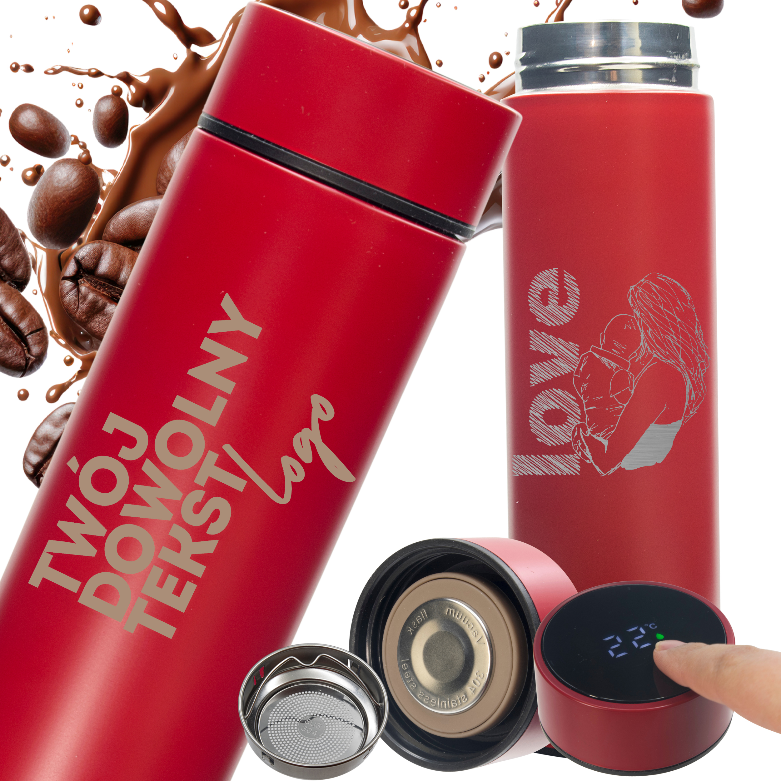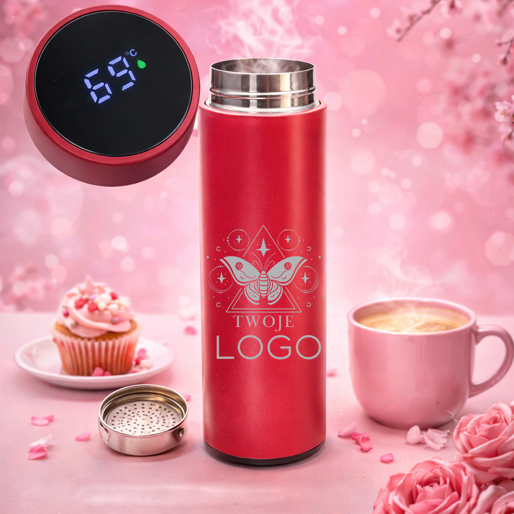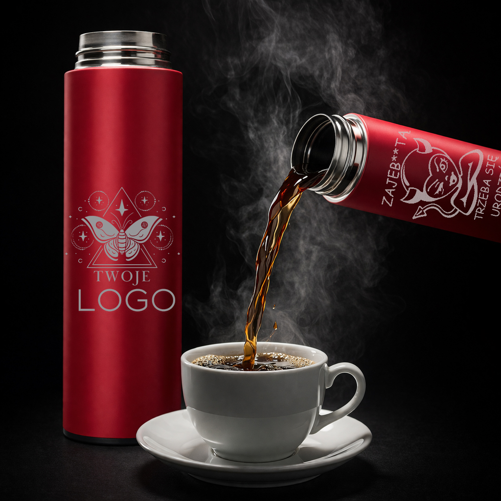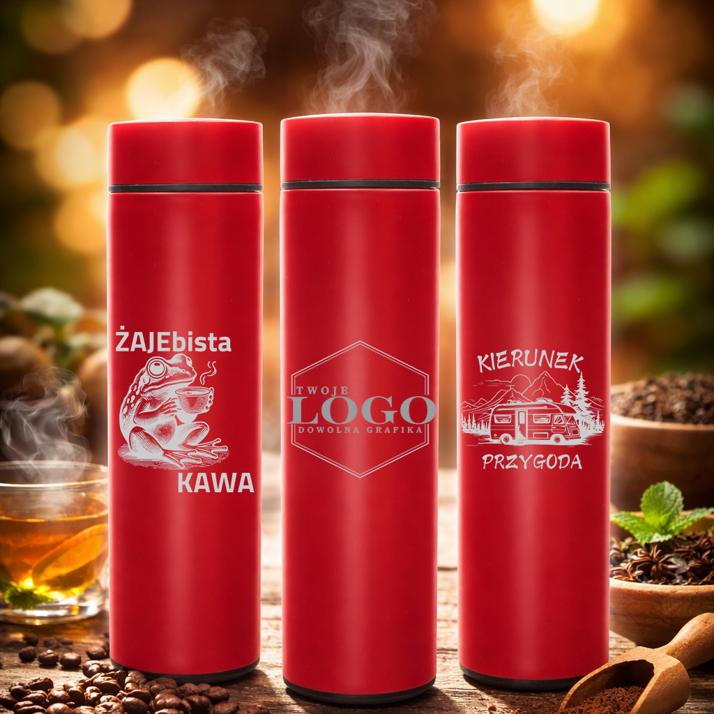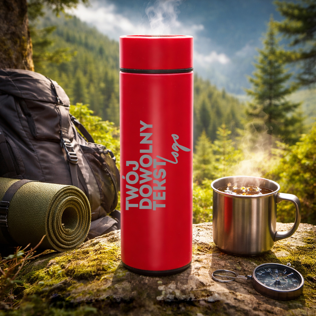 Elegancki, nowoczesny i praktyczny — czerwony termos z personalizowanym grawerem to świetny pomysł na prezent, gadżet firmowy lub pamiątkę na specjalną okazję.