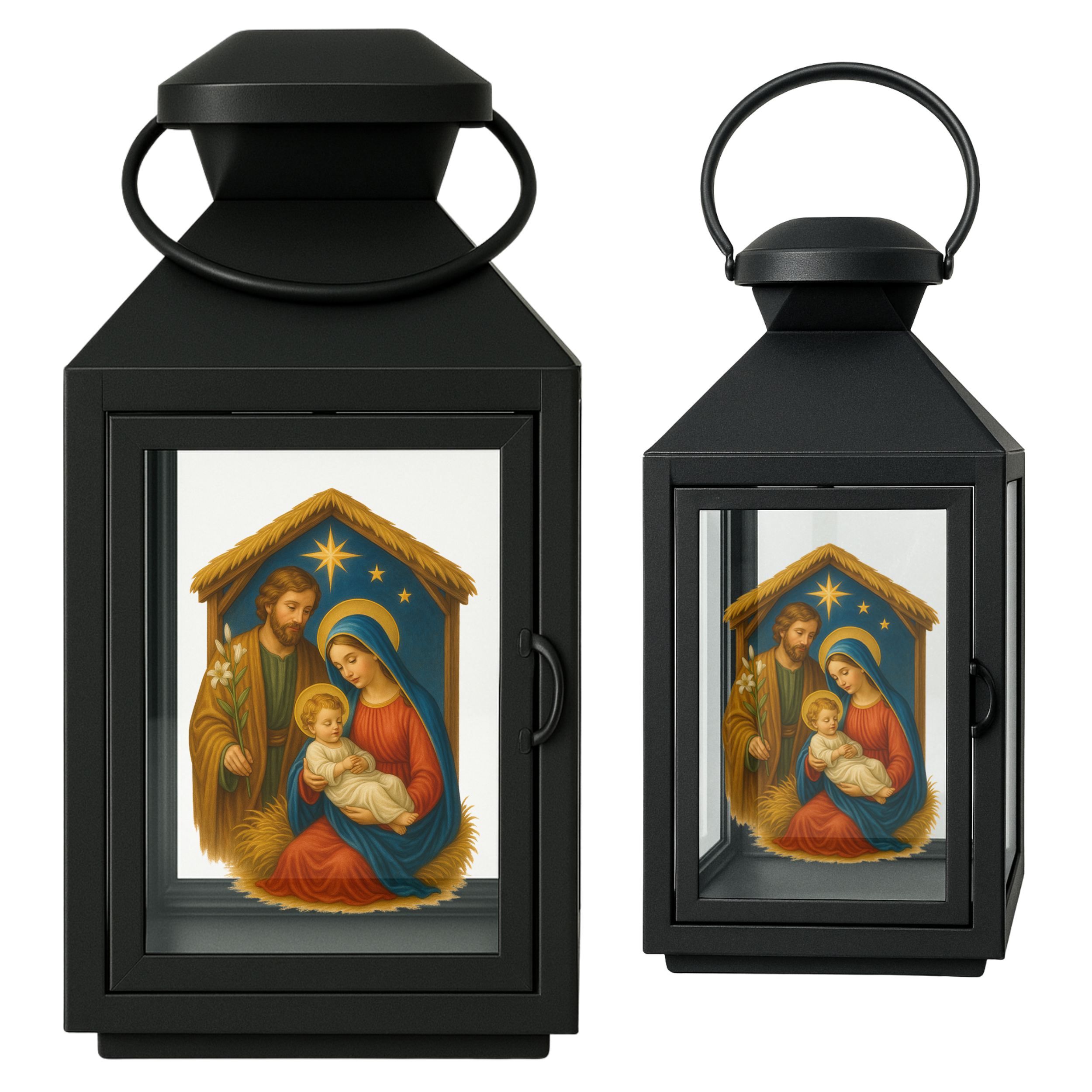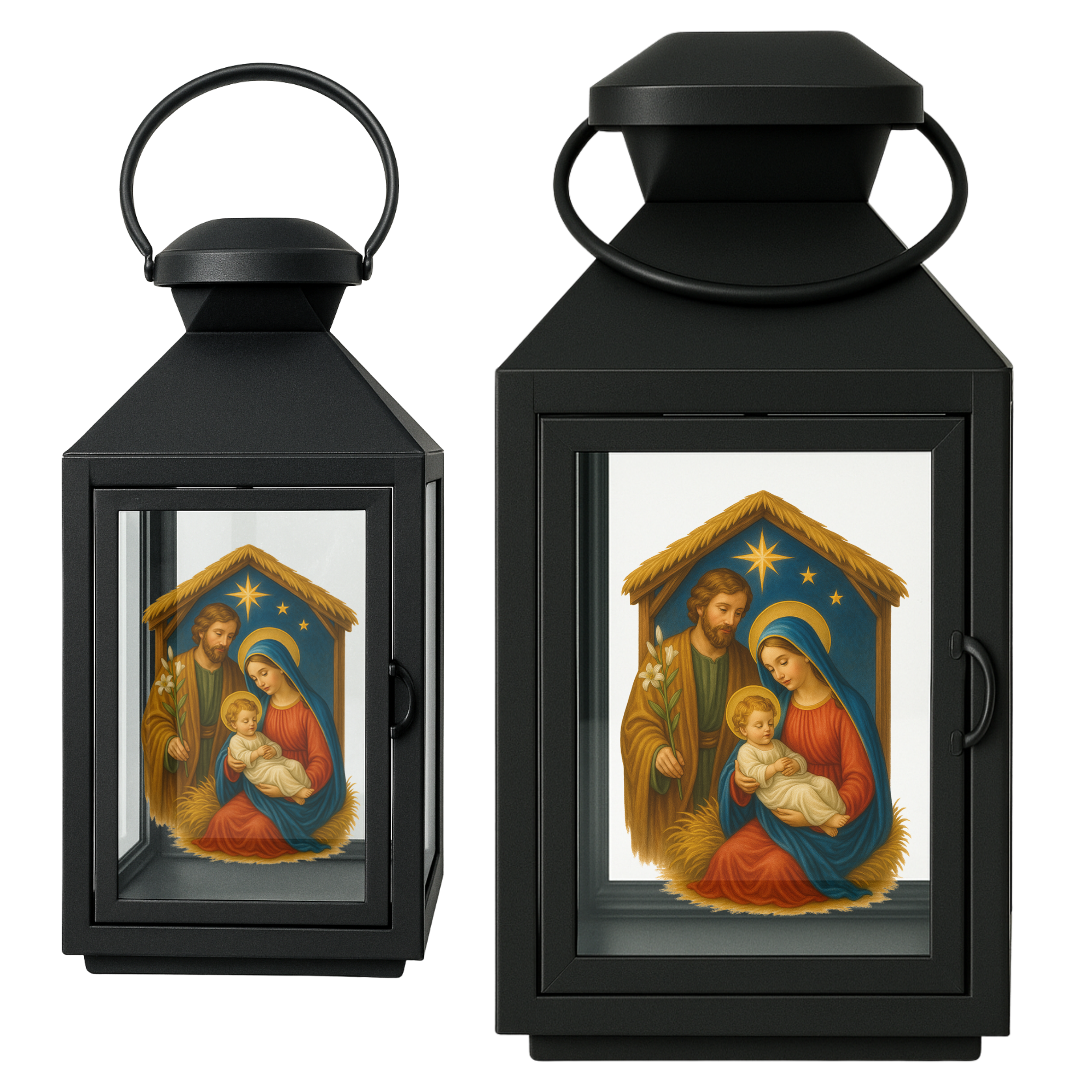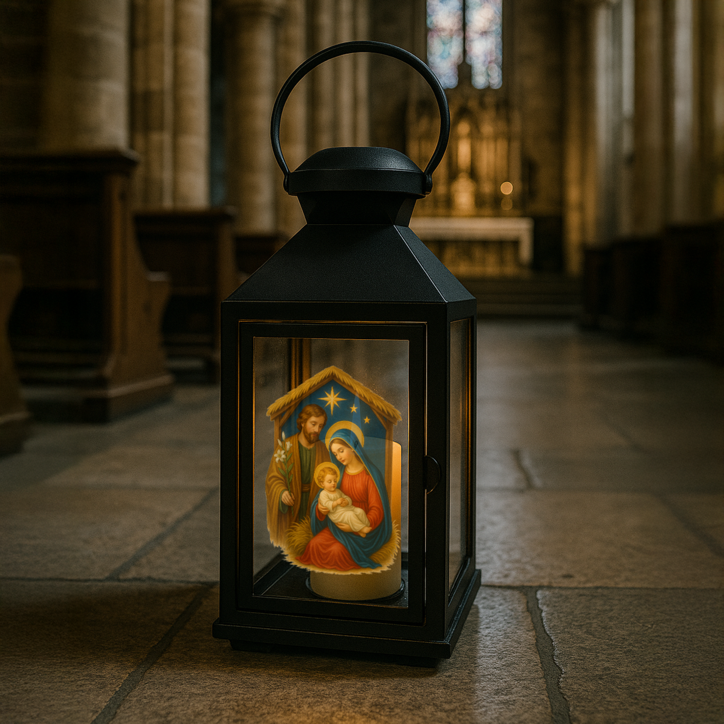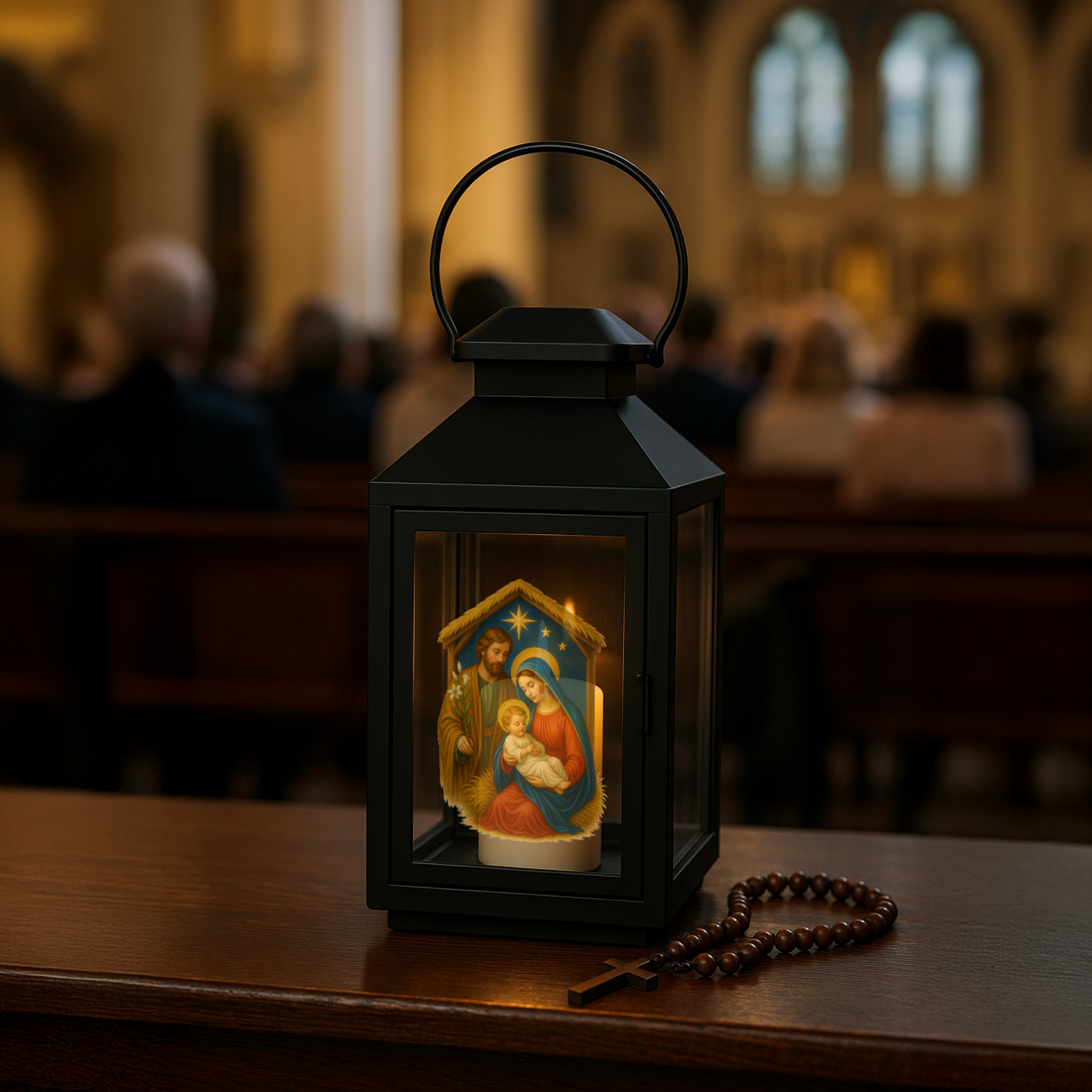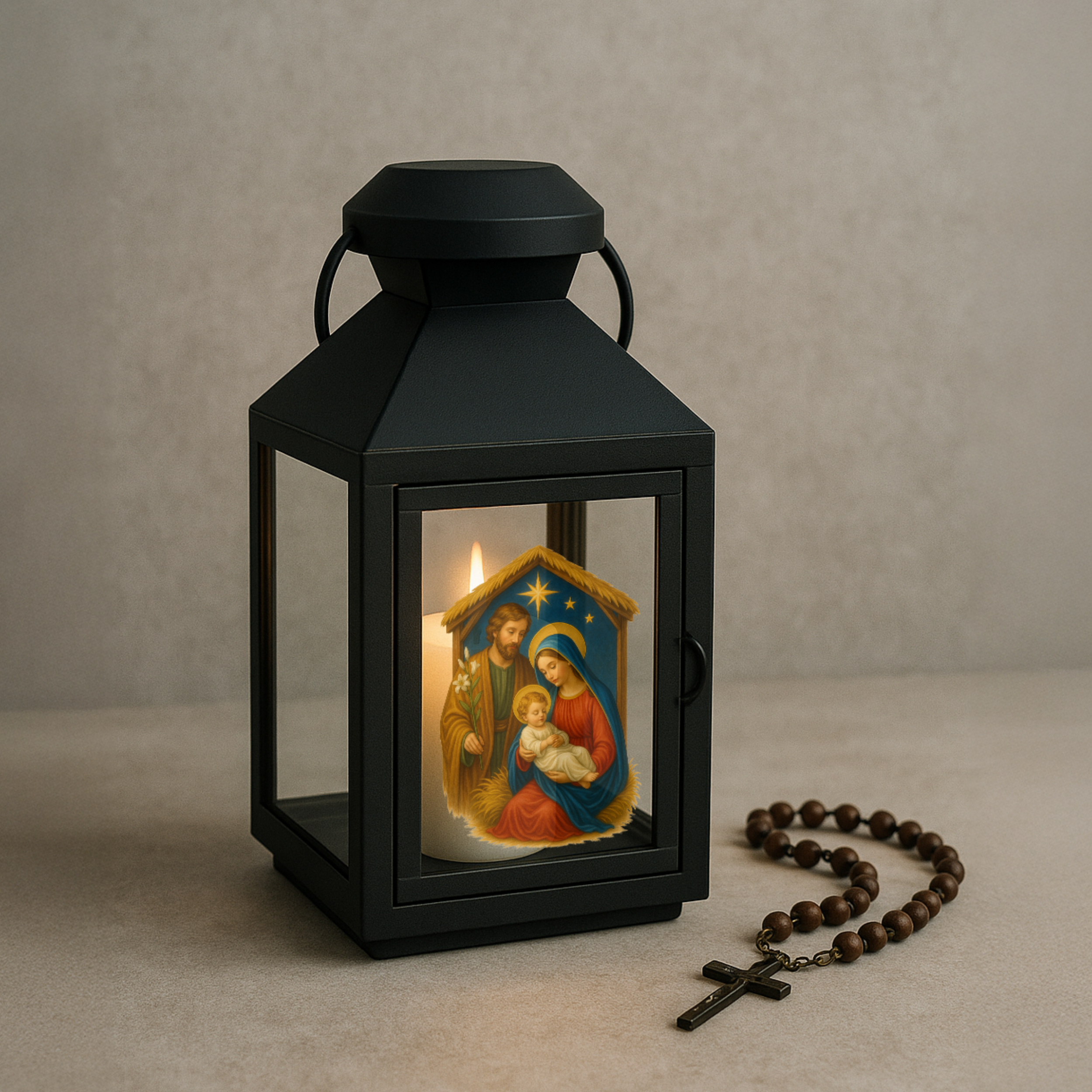 Wprowadź do adwentowych poranków prawdziwe ciepło i duchowy klimat. Ta elegancka czarna latarenka z realistycznym wizerunkiem Świętej Rodziny idealnie sprawdza się na Roraty, procesje, nabożeństwa oraz dziecięce światełka adwentowe. Jej delikatne podświetlenie tworzy wyjątkową atmosferę modlitwy i skupienia.