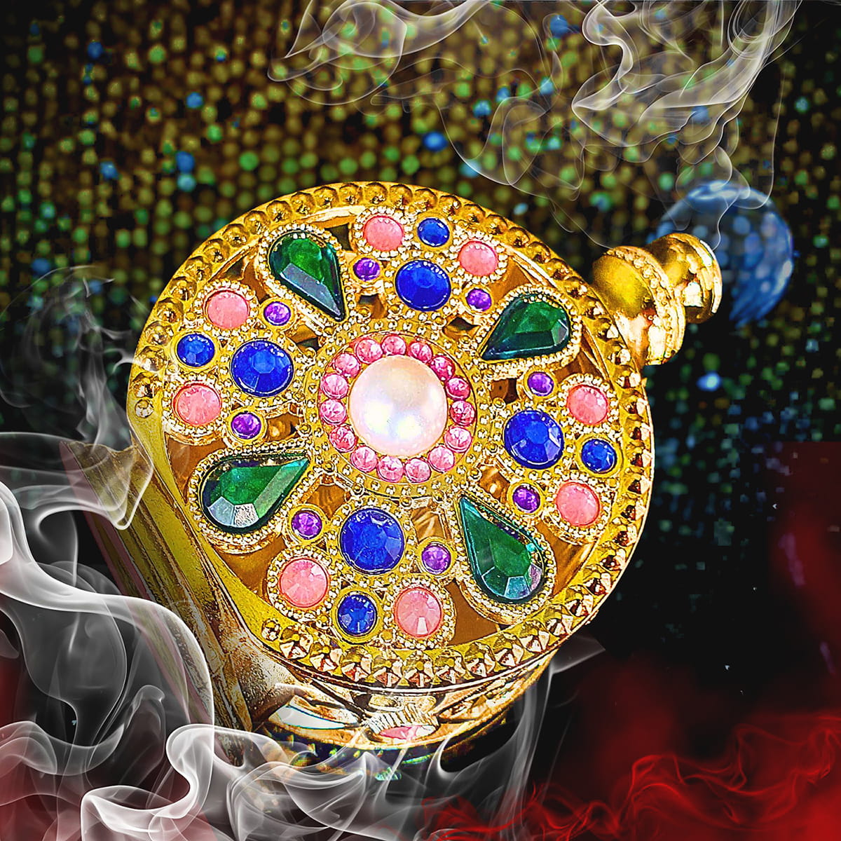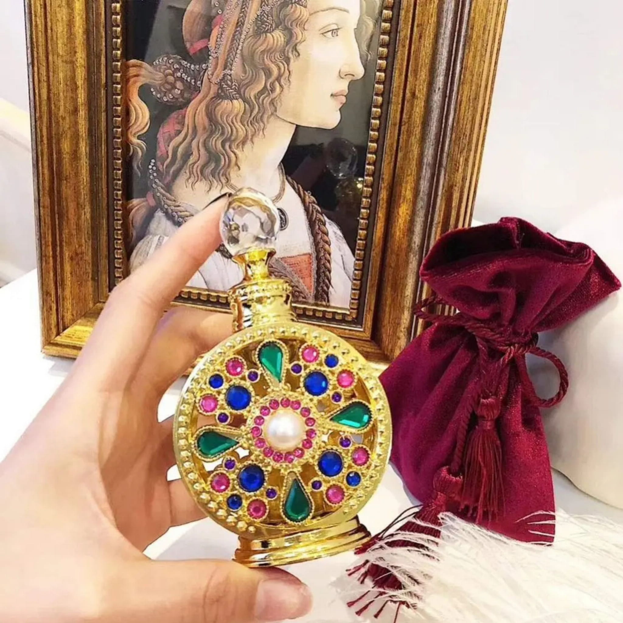 Perfekcyjnie wykonany flakon w orientalnym stylu, ozdobiony barwnymi kryształkami i perłowym akcentem, jest prawdziwym klejnotem na Twojej toaletce. Idealny zarówno do użytku osobistego, jak i jako wyjątkowy prezent dla miłośników pięknych zapachów i artystycznych detali.