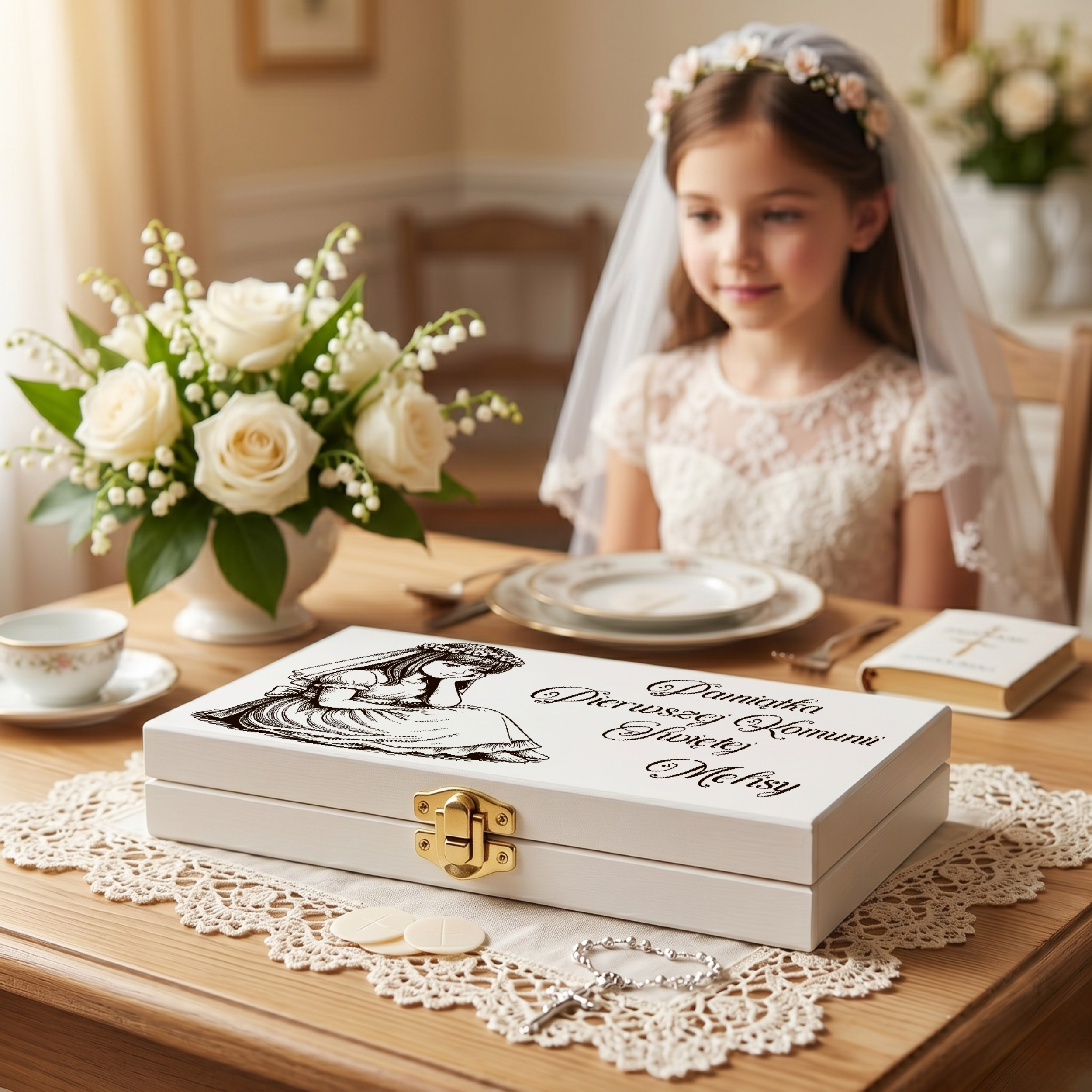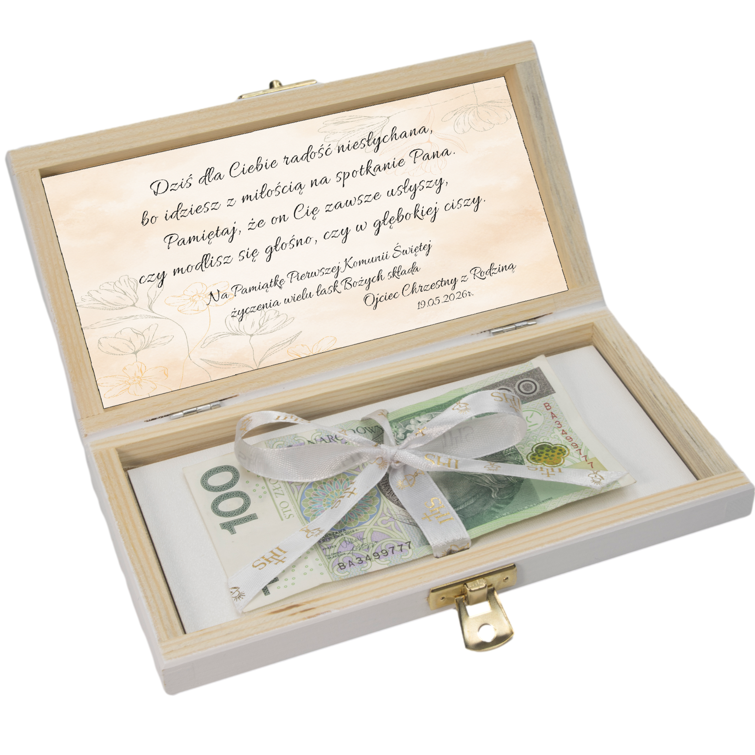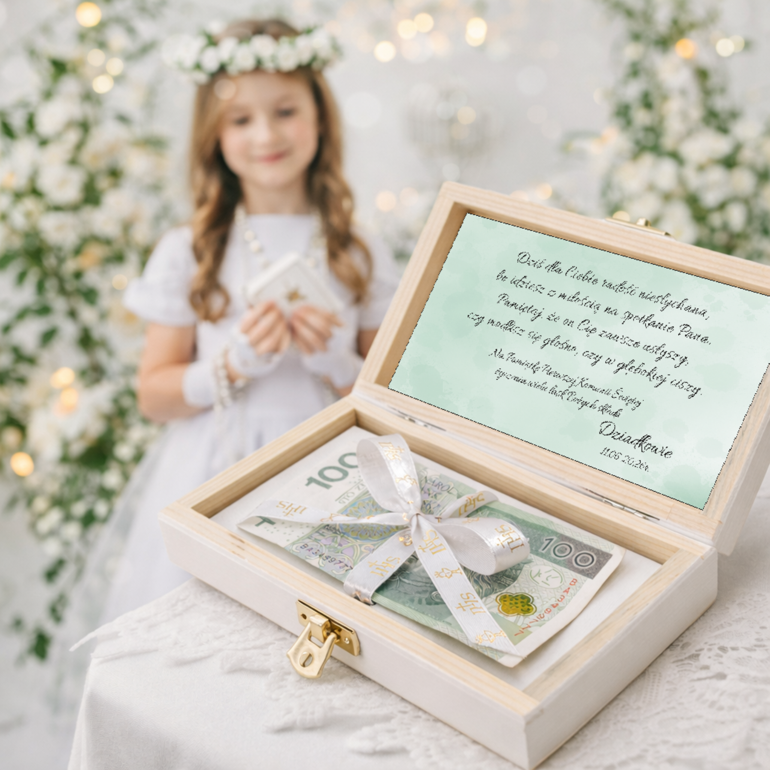 Pamiątka Pierwszej Komunii Świętej – Personalizowane Drewniane Pudełko na Pieniądze
