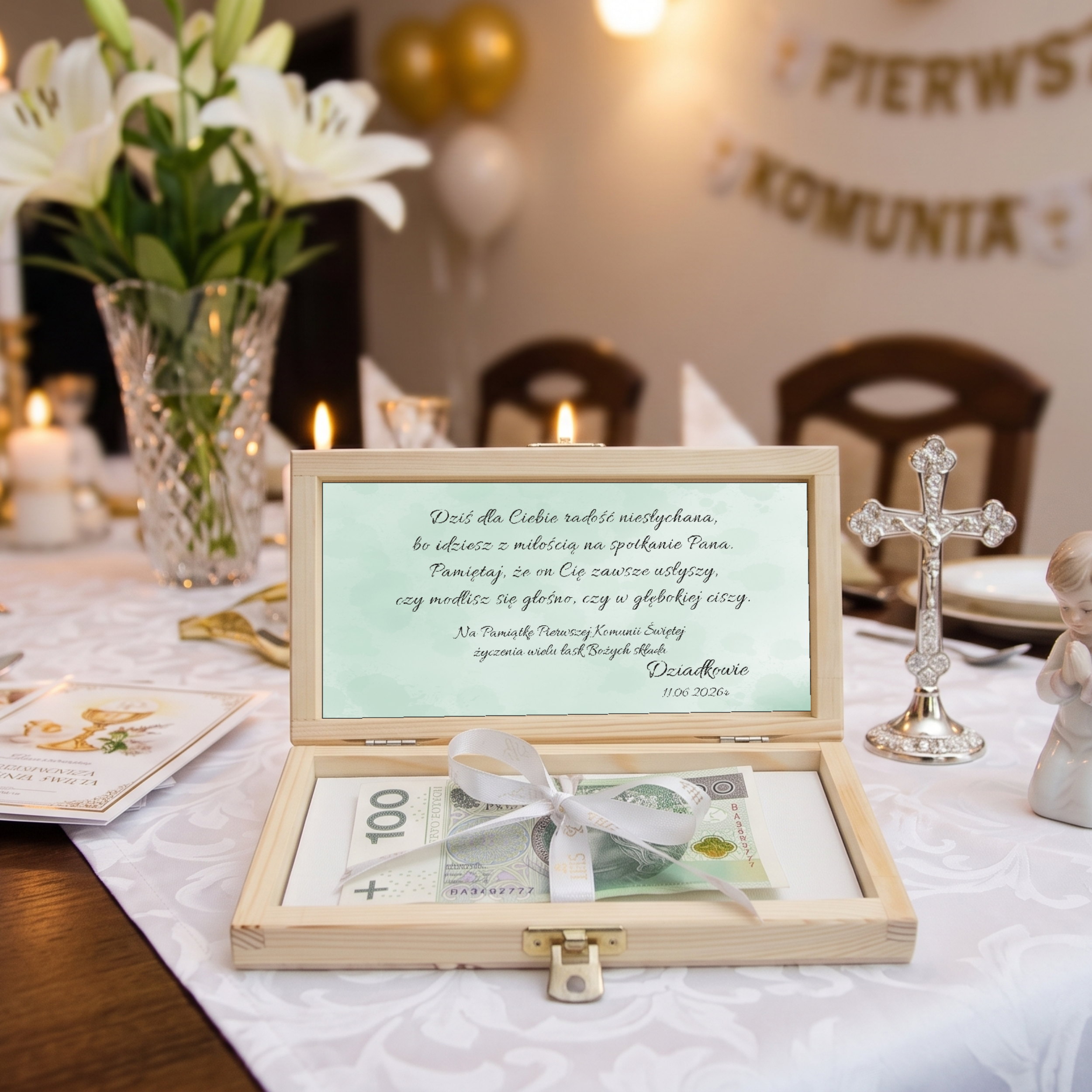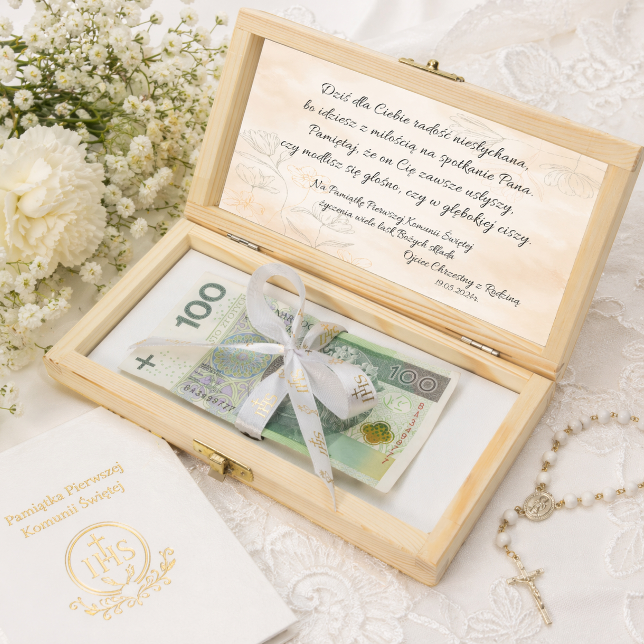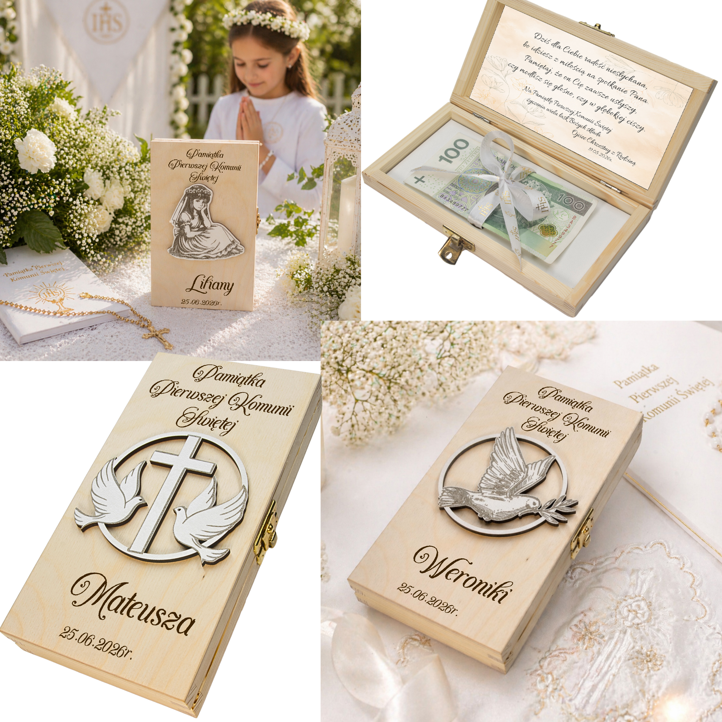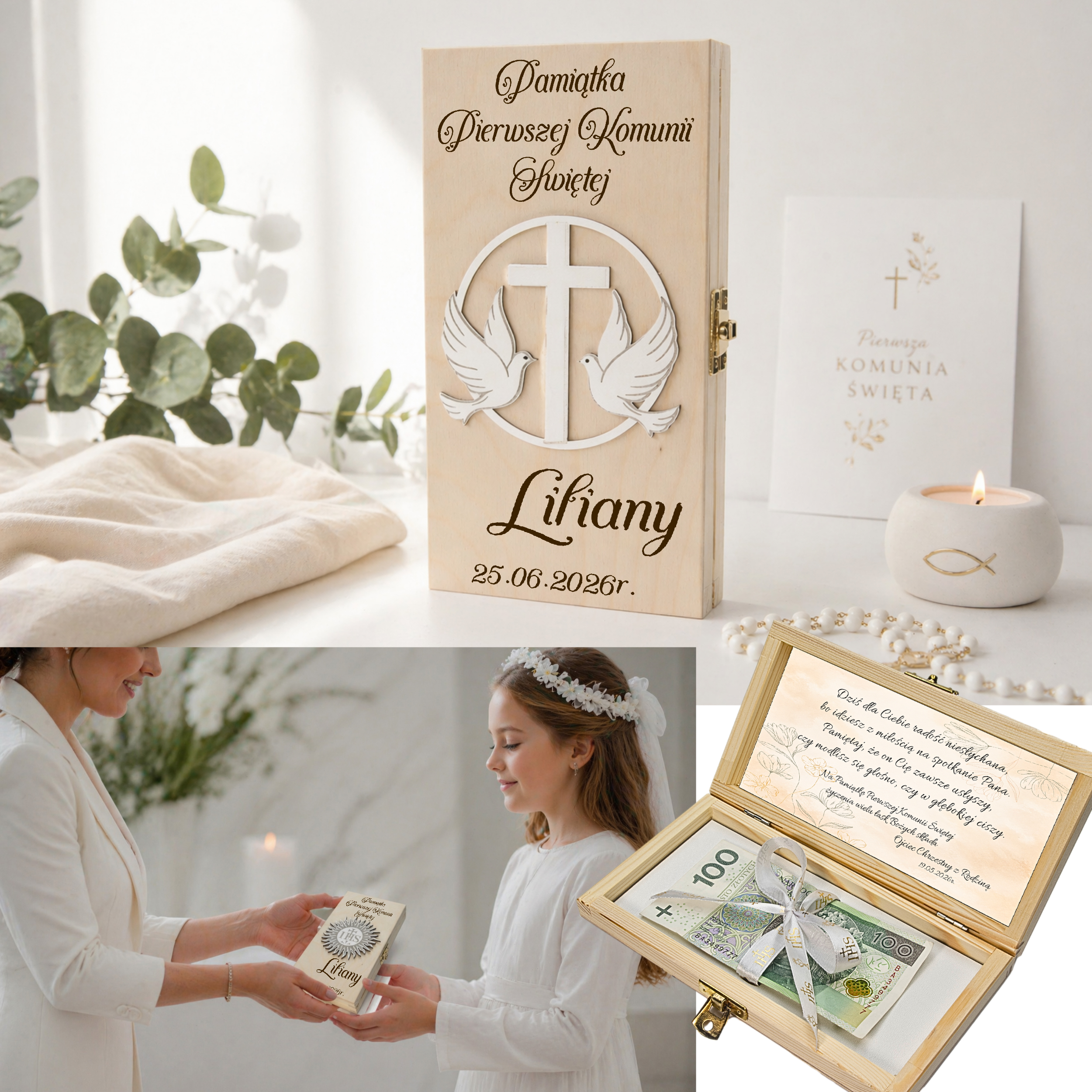 PAMIĄTKA I KOMUNII ŚWIĘTEJ Pudełko na Pieniądze KOMUNIA PREZENT na Komunię