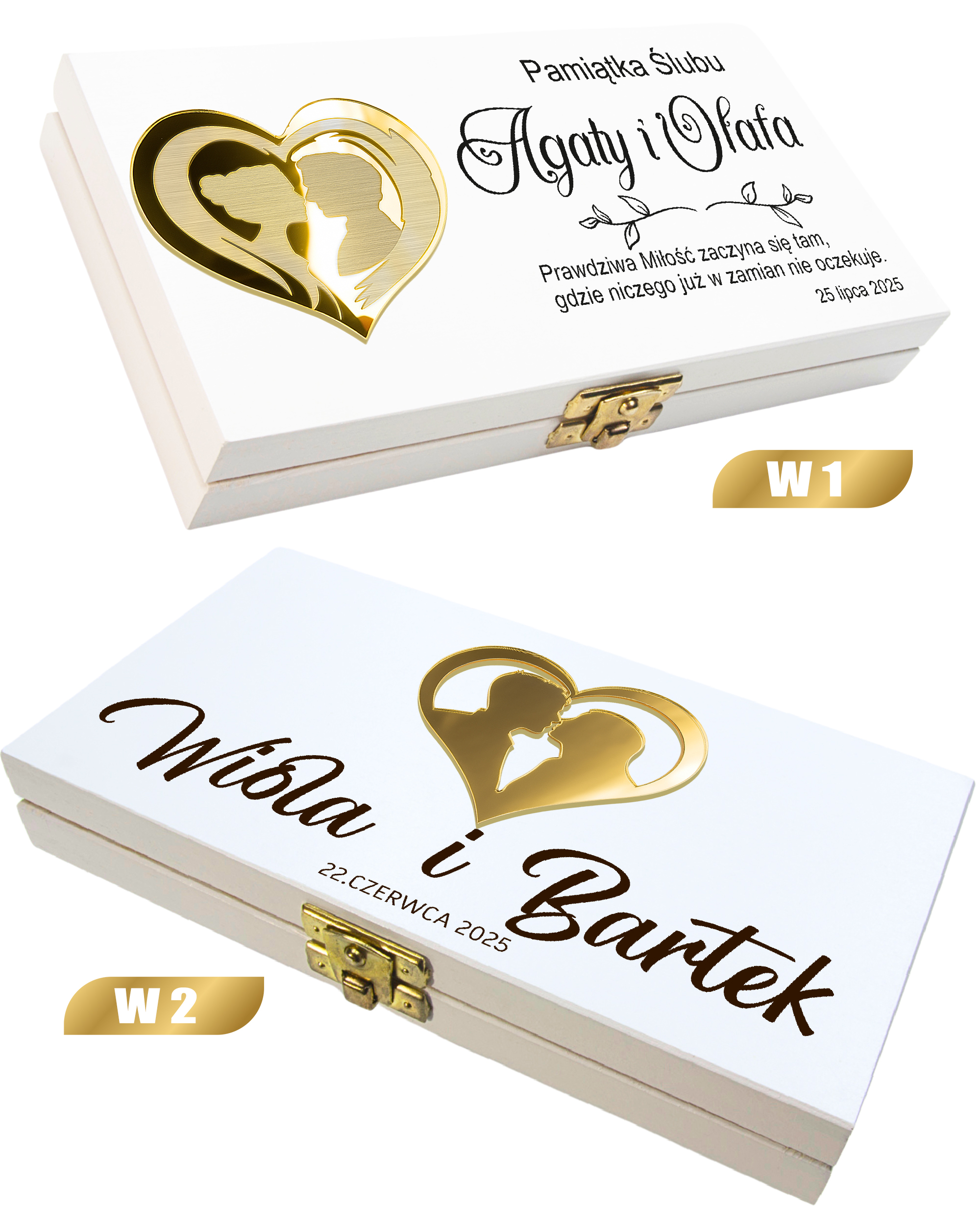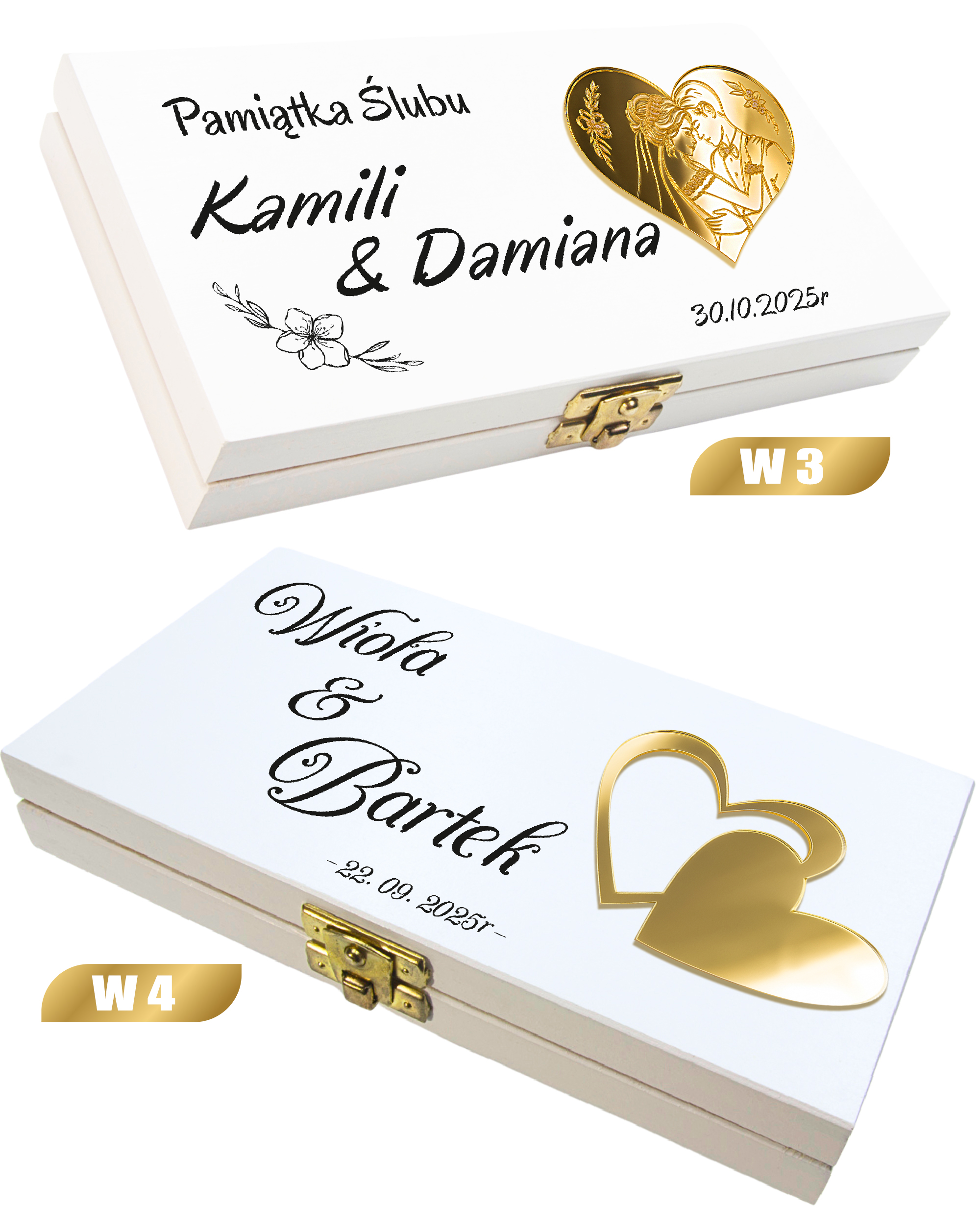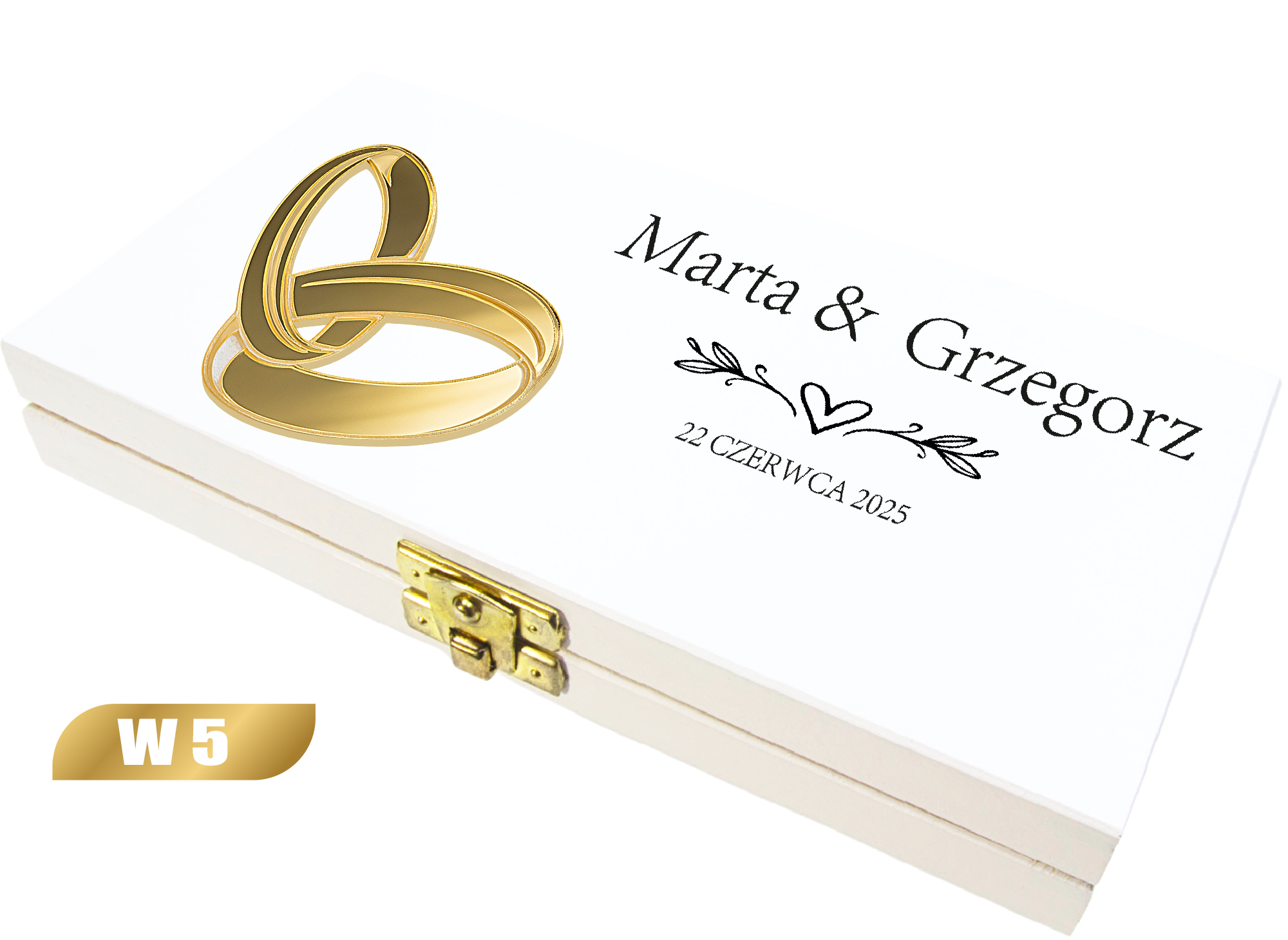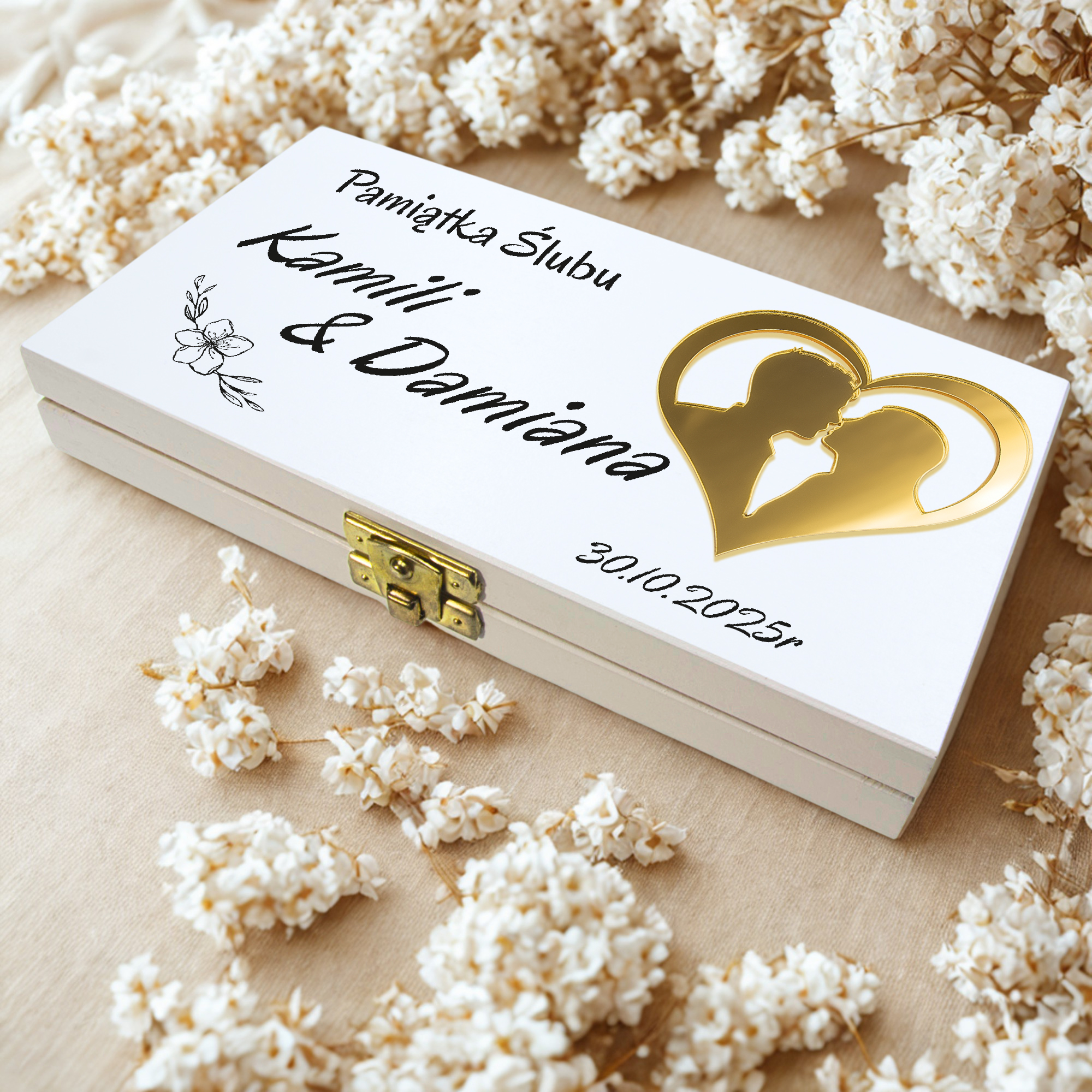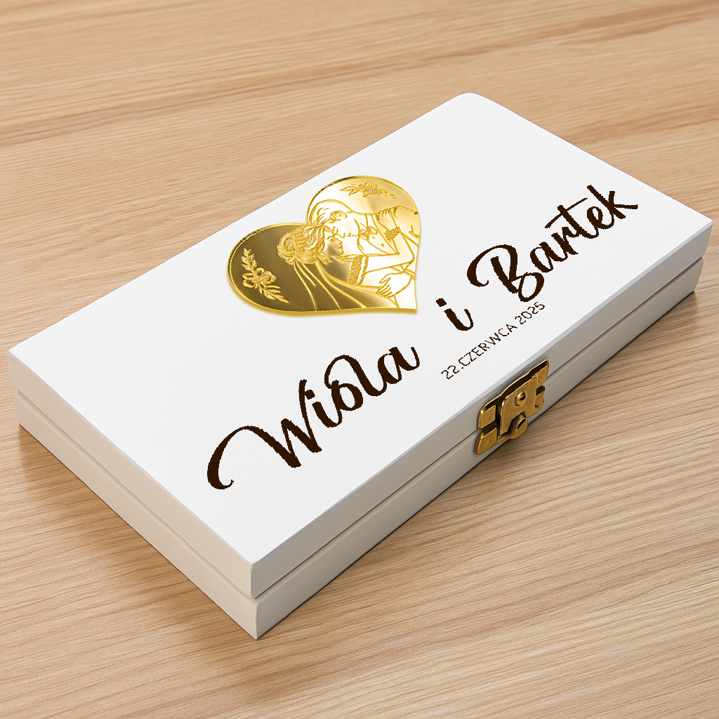 Drewniane białe pudełko z personalizowaną grafiką i eleganckim złotym zapięciem