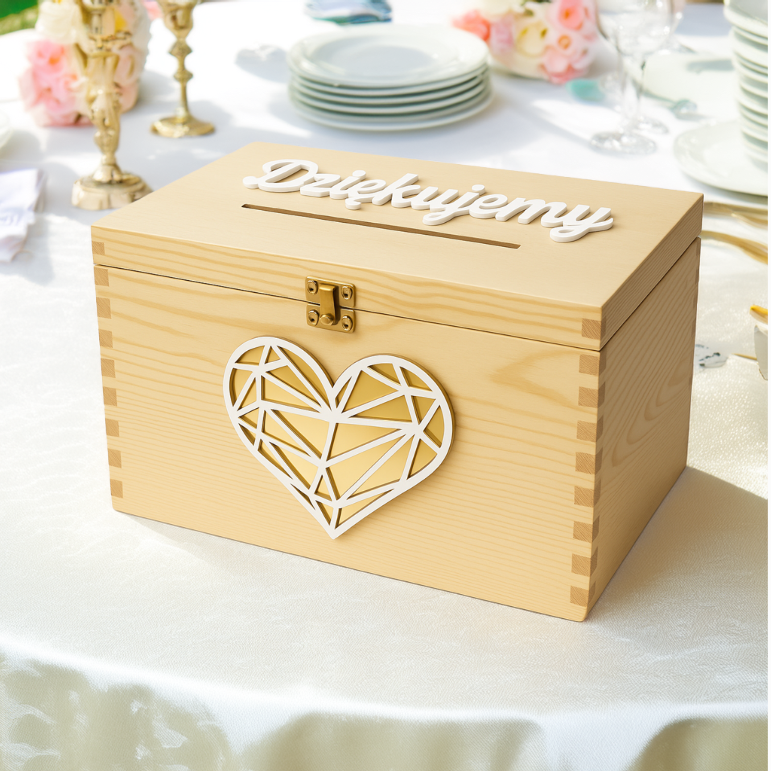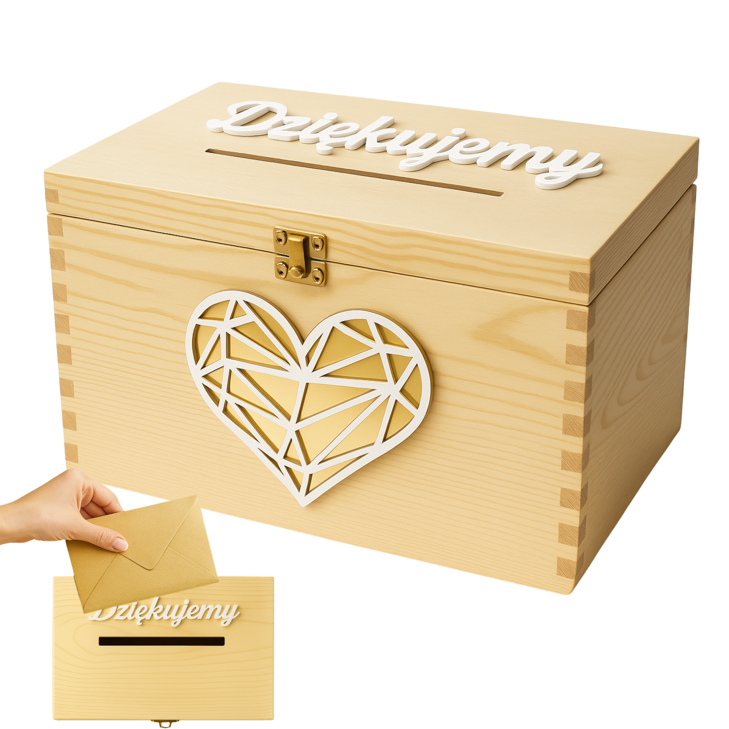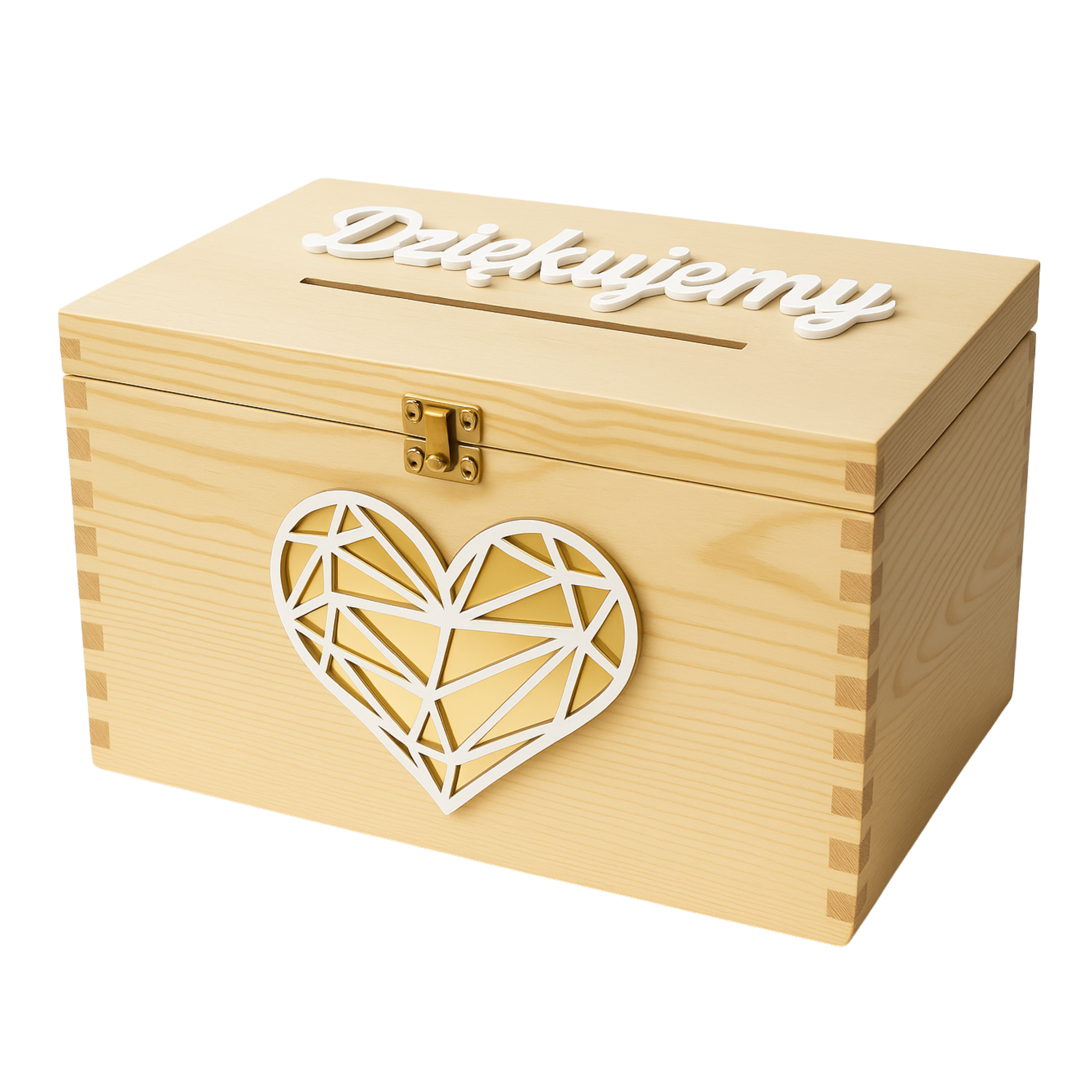 Drewniana skrzynka ślubna na koperty – z napisem 3D i geometrycznym sercem ze złotym lustrem