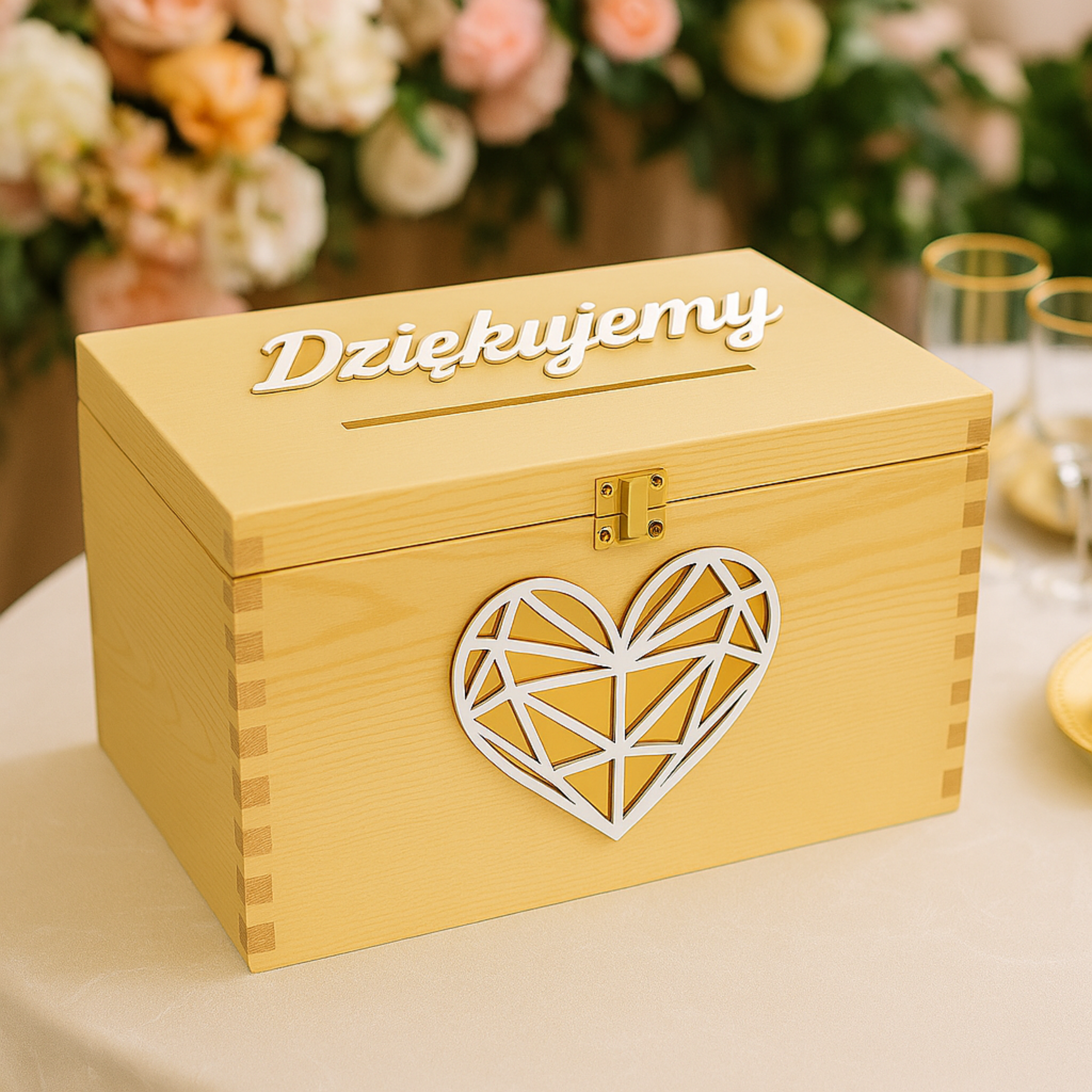 Szukasz eleganckiej, gotowej skrzynki na koperty, która nie wymaga personalizacji, a jednocześnie przyciąga wzrok i podkreśla wyjątkowość uroczystości?