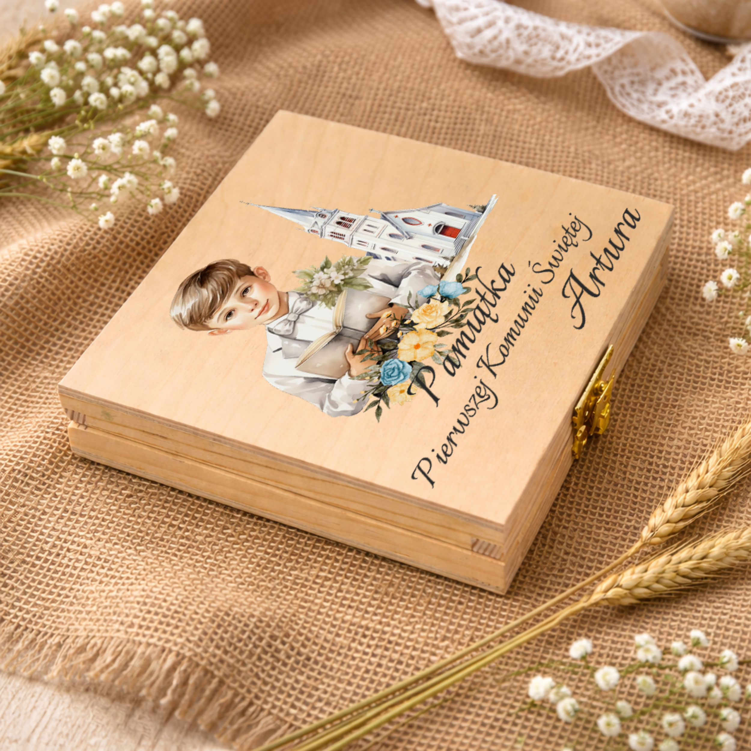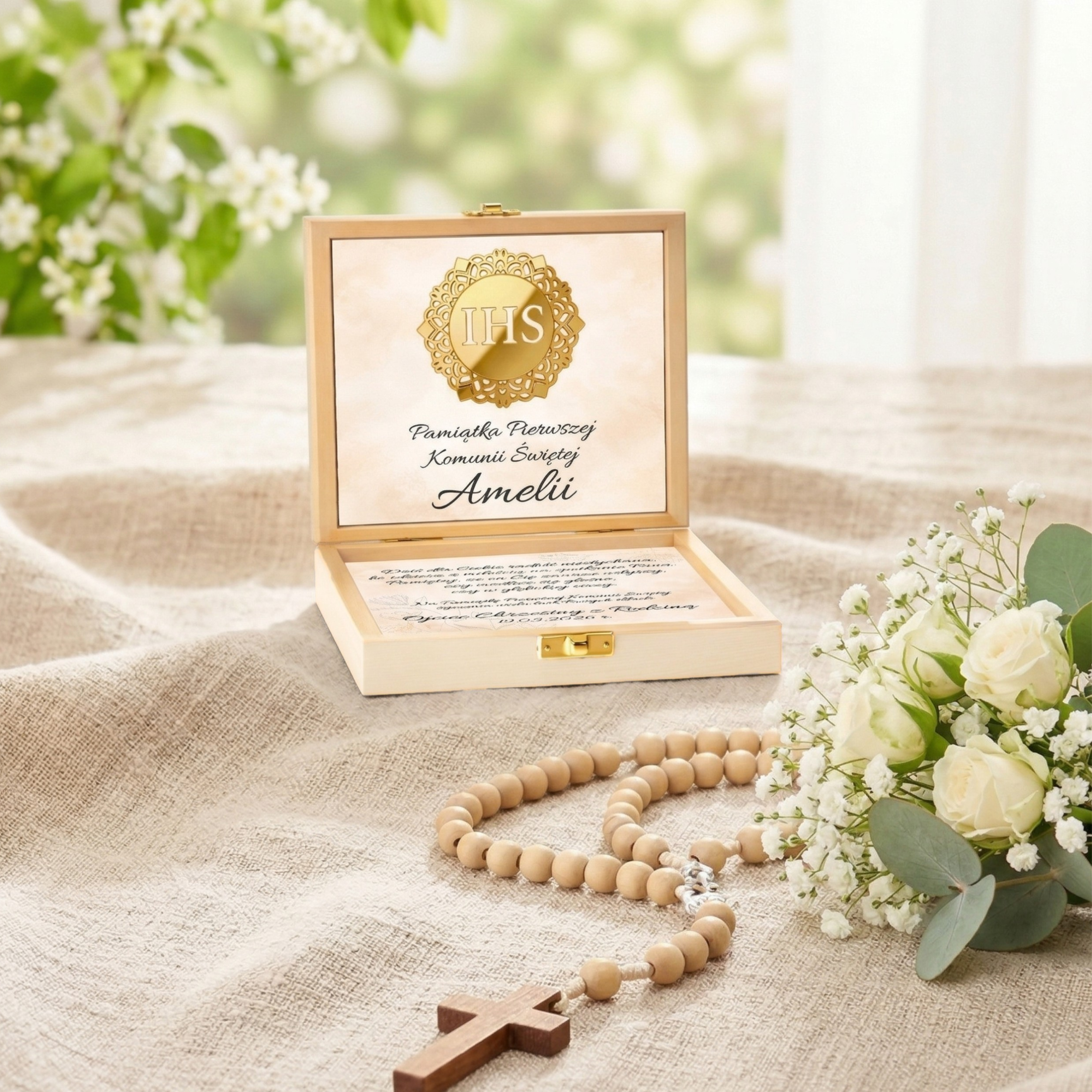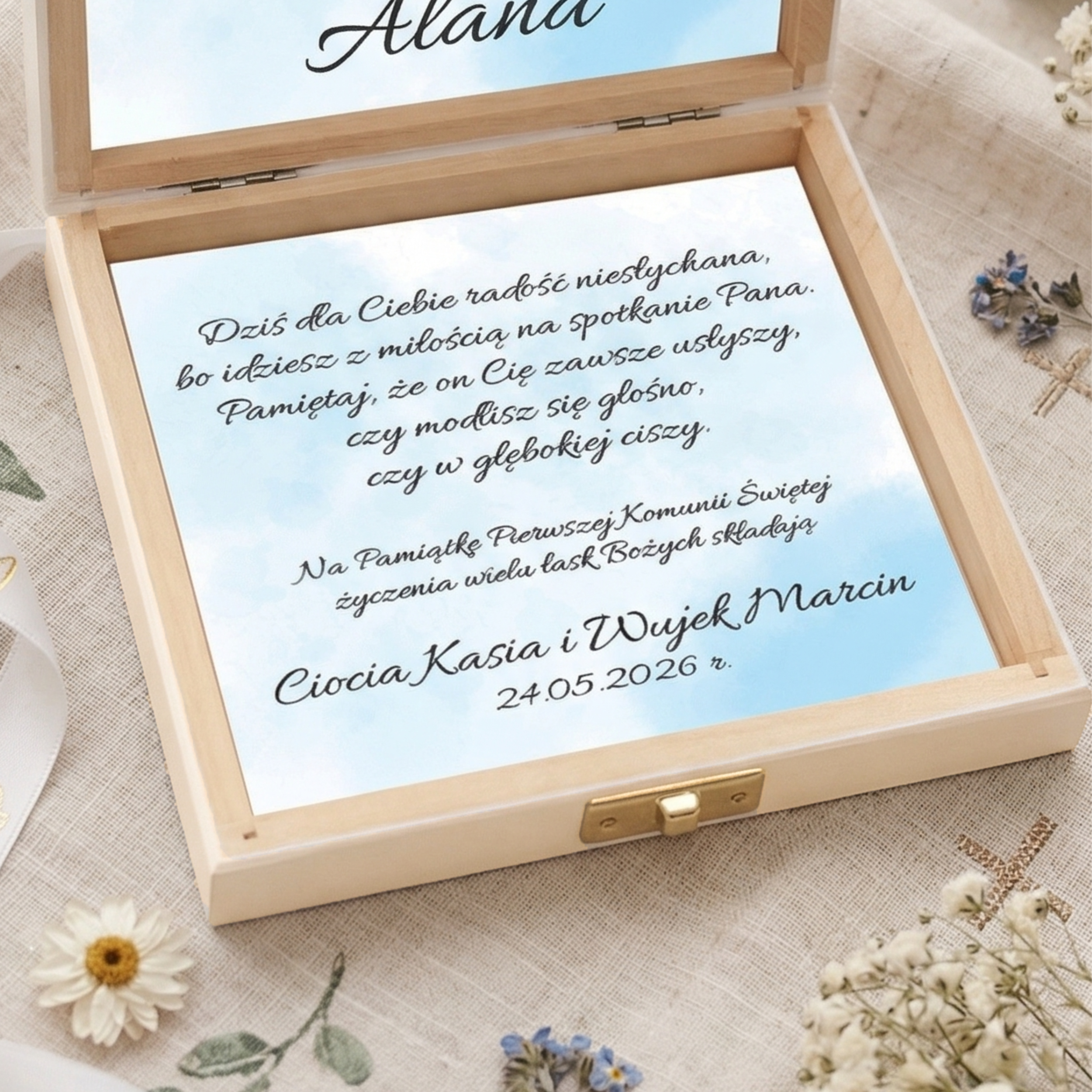 To produkt stworzony z myślą o wyjątkowej chwili, jaką jest Pierwsza Komunia Święta. Subtelna kolorystyka, delikatne wzory, złote detale i możliwość personalizacji sprawiają, że pudełko prezentuje się niezwykle stylowo i od razu przyciąga uwagę