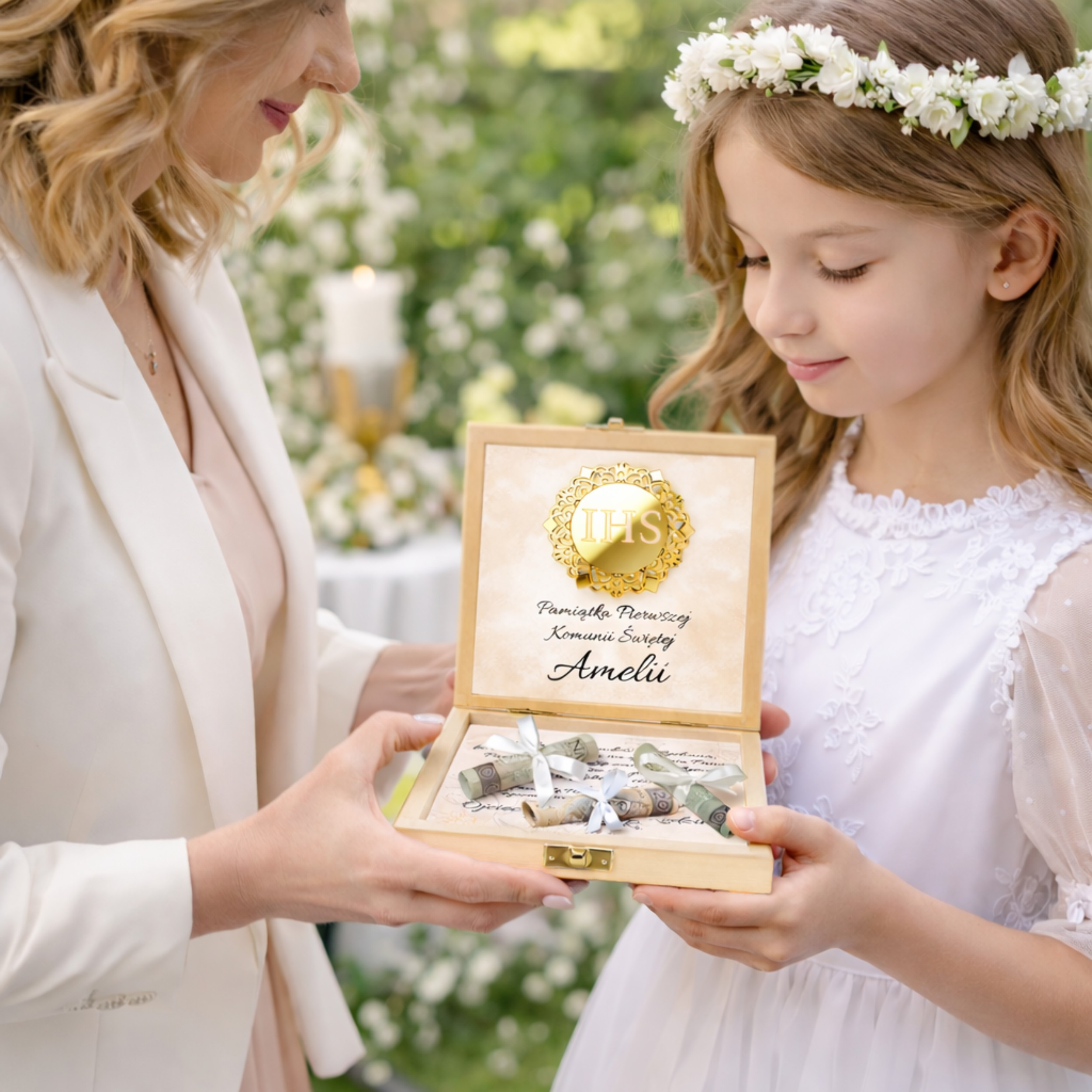 Szukasz wyjątkowego sposobu na wręczenie prezentu komunijnego? To eleganckie, personalizowane pudełko na pieniądze będzie nie tylko piękną oprawą dla banknotów, ale także wzruszającą pamiątką na długie lata