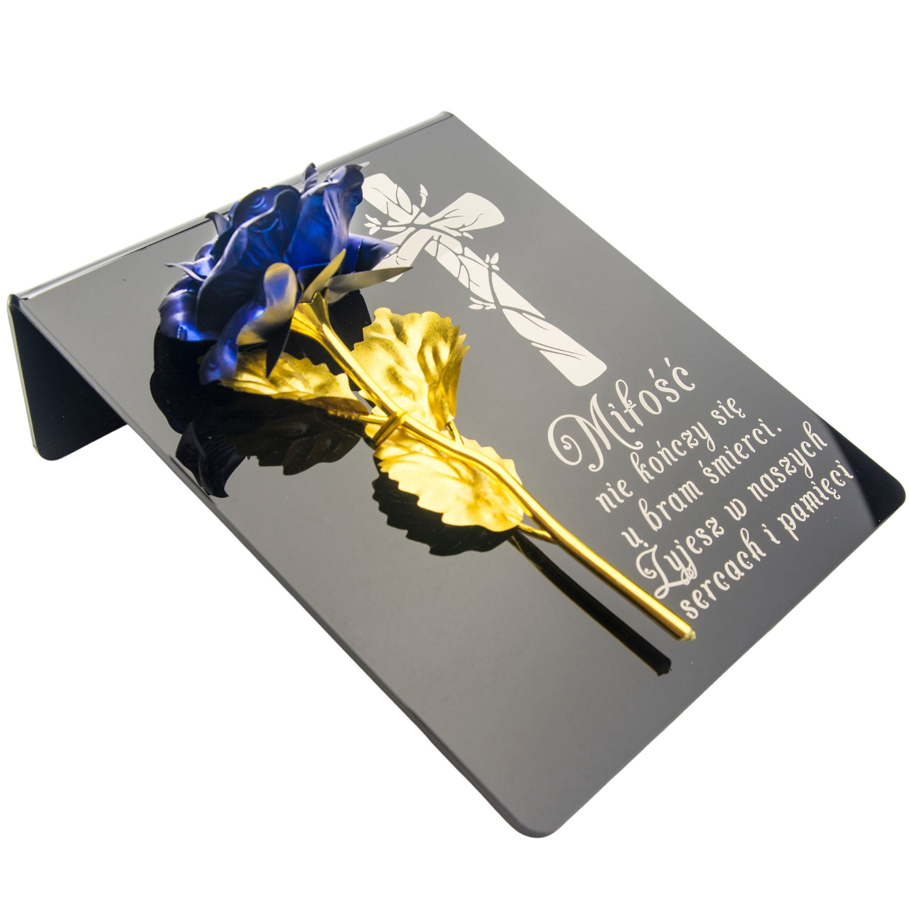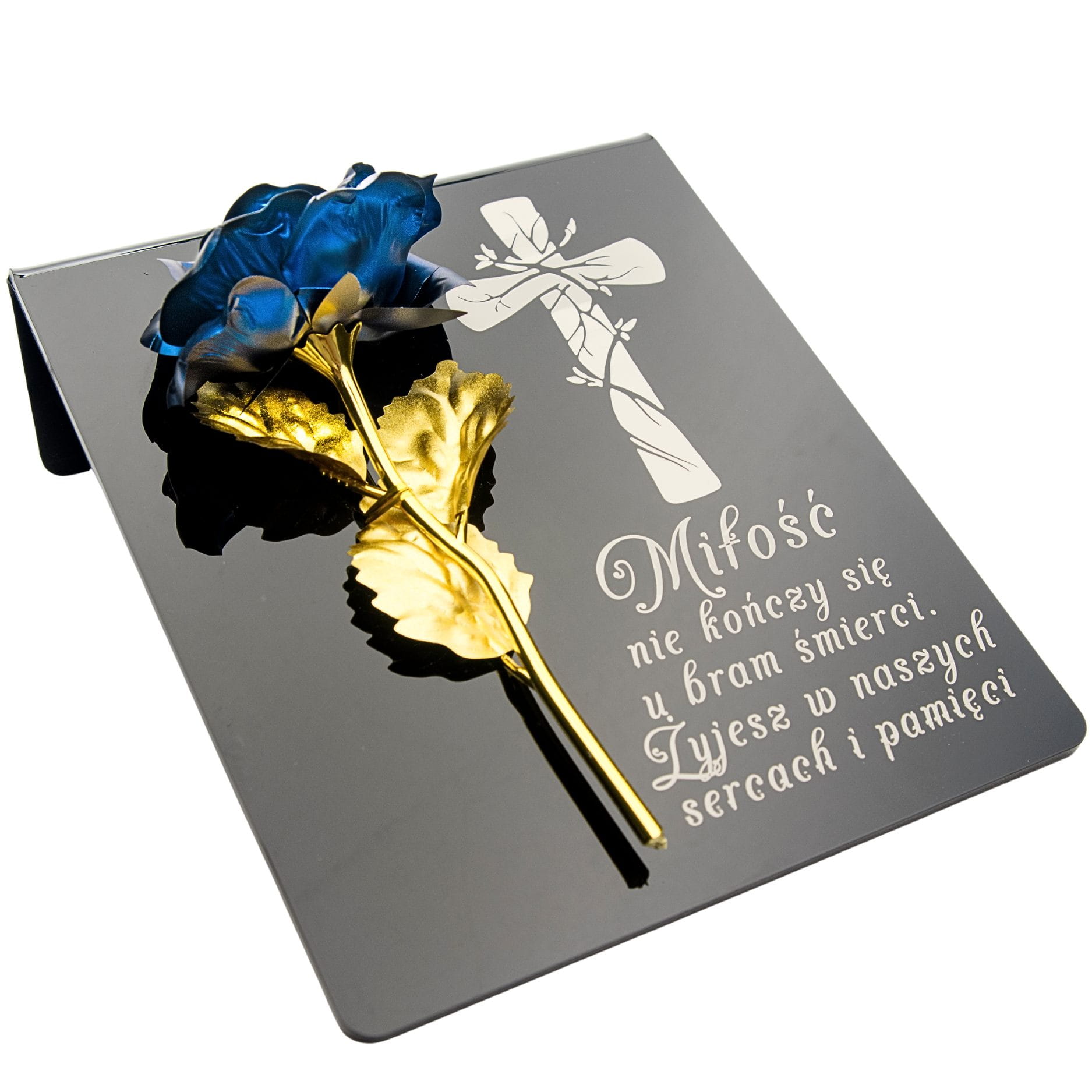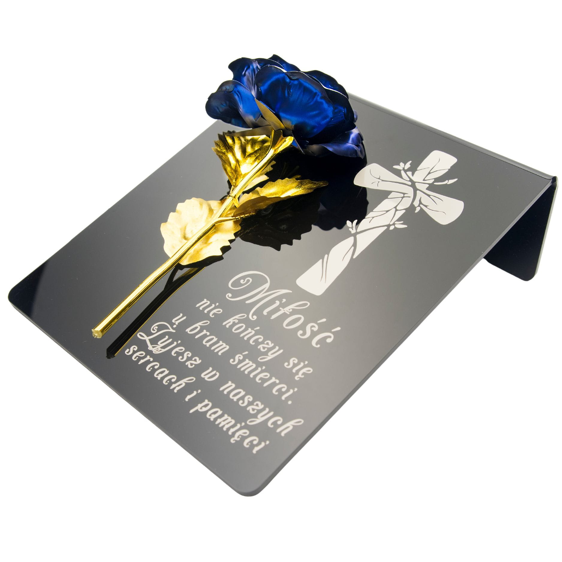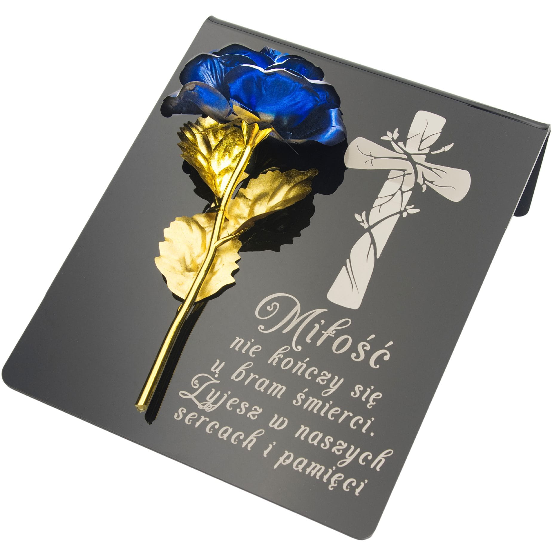 Niebiesko-złota róża na postumencie z grawerem