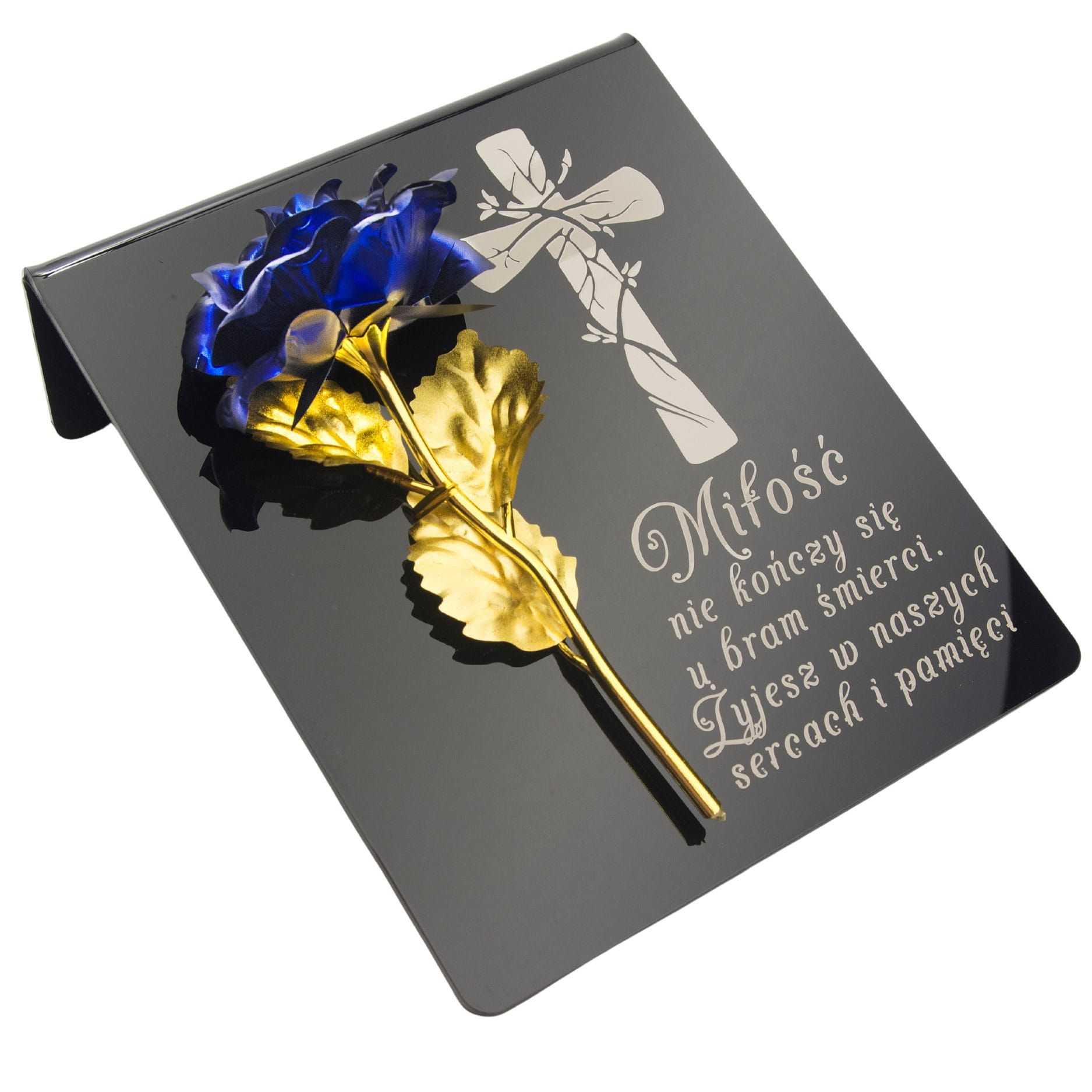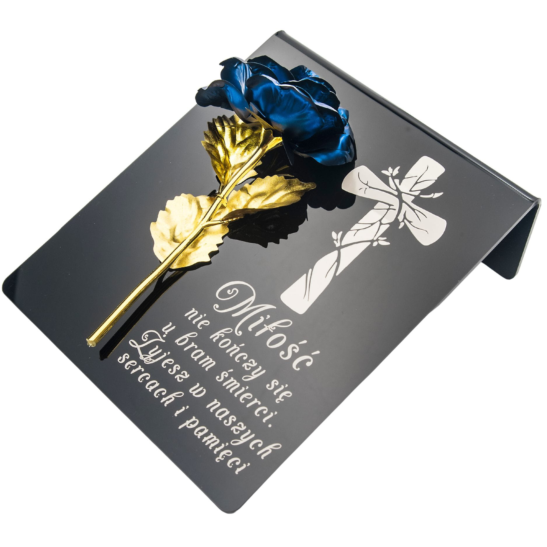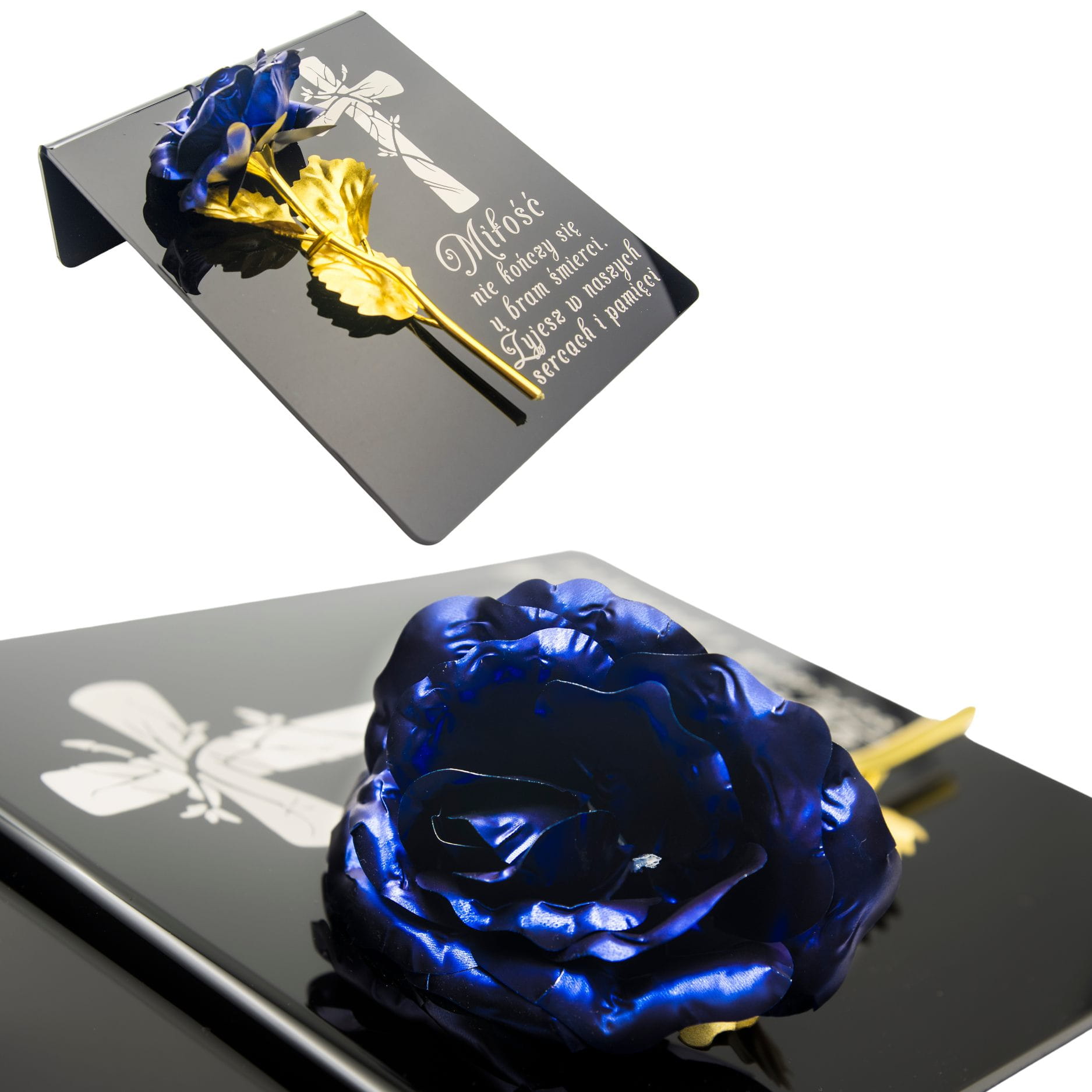Niebiesko-złota róża na postumencie z grawerem