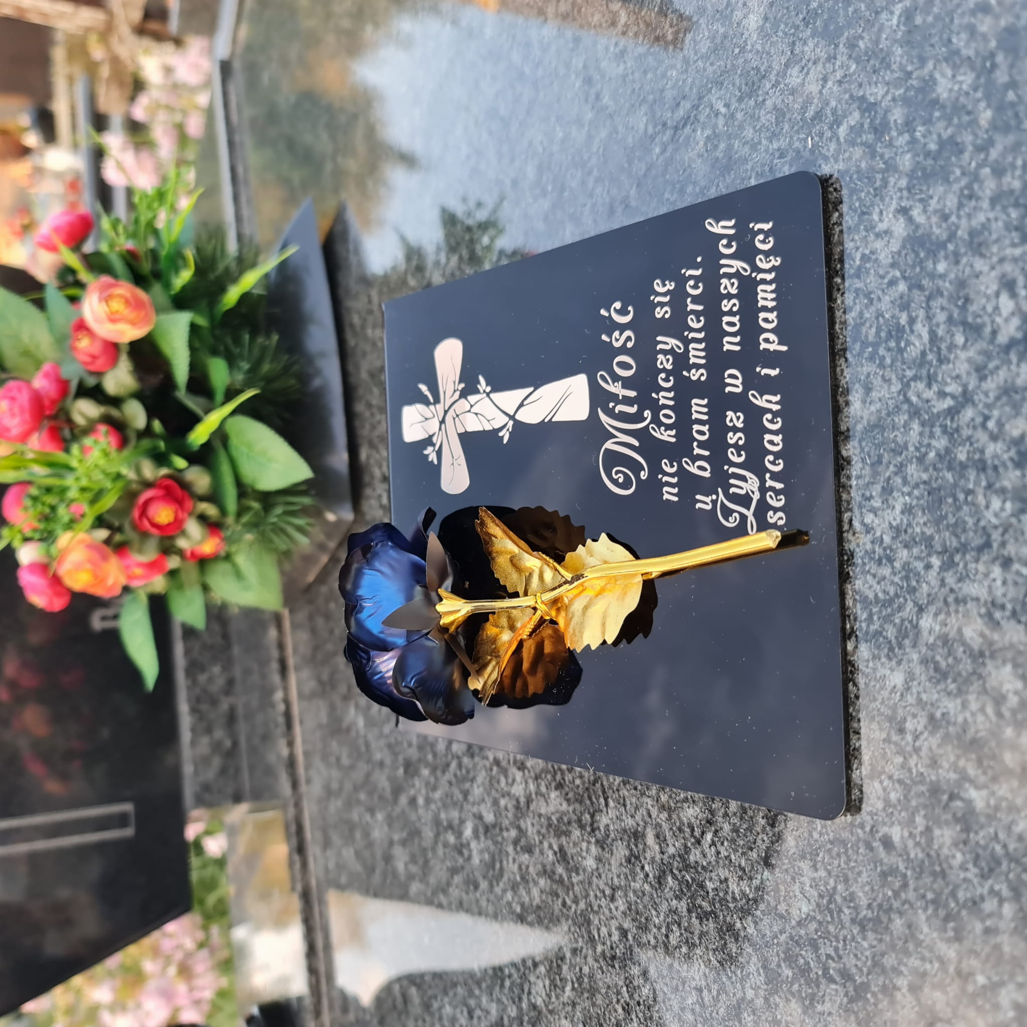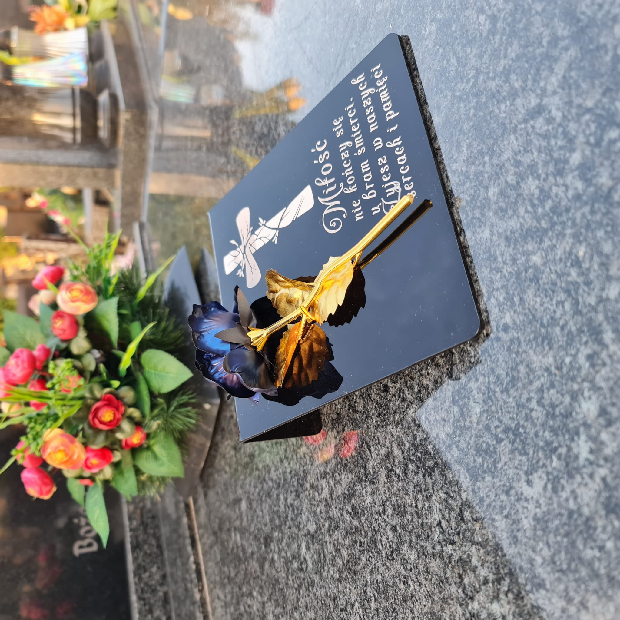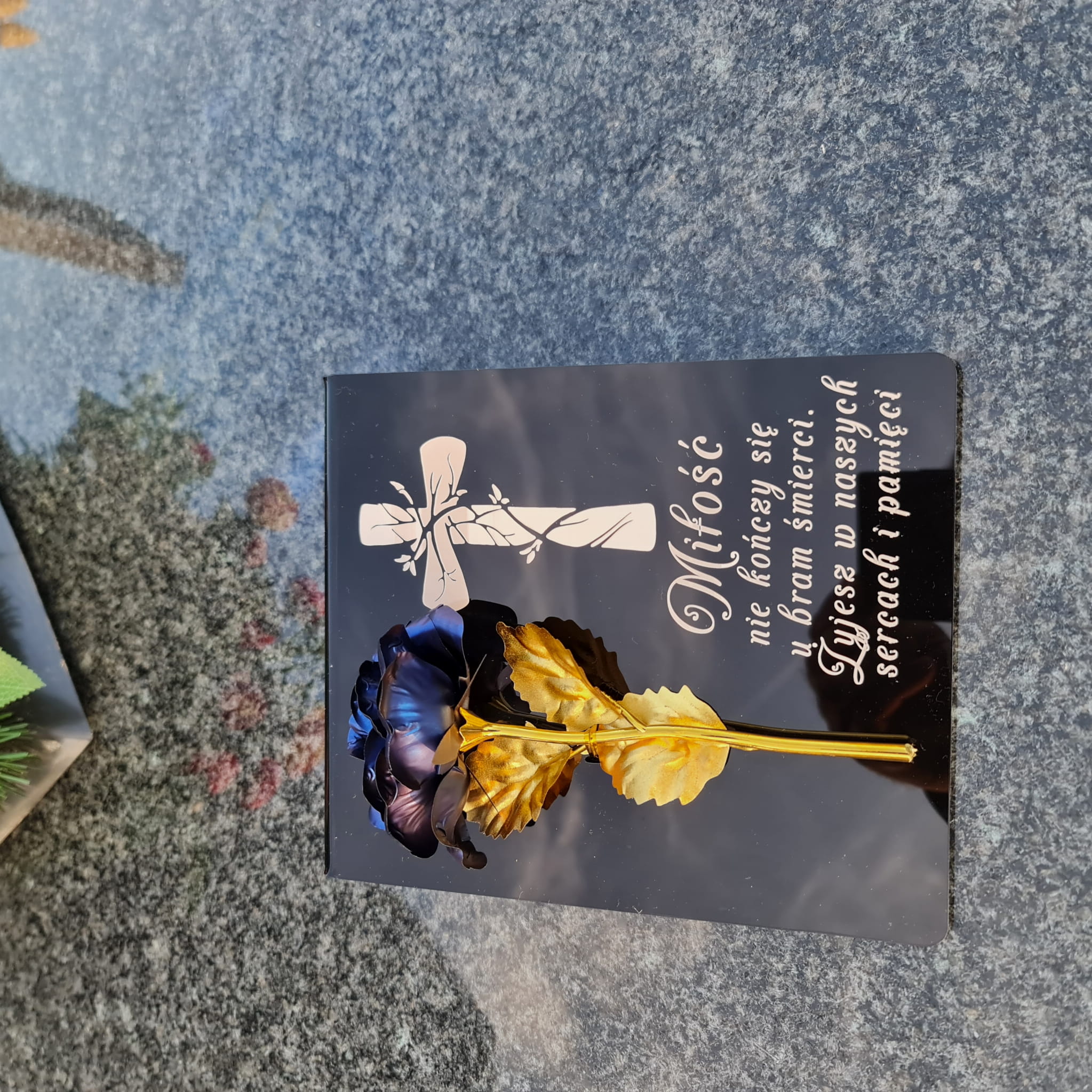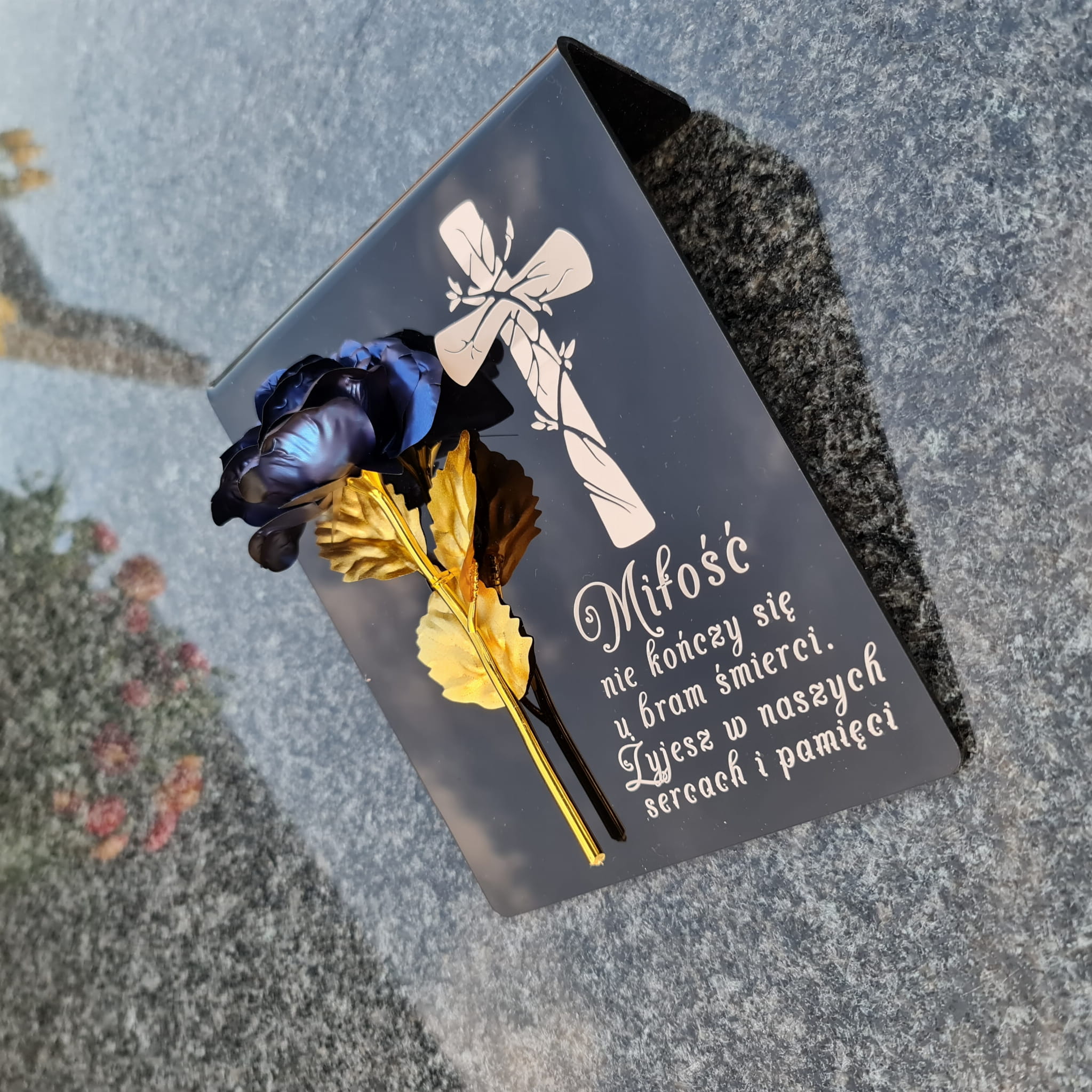 Niebiesko-złota róża na postumencie z grawerem