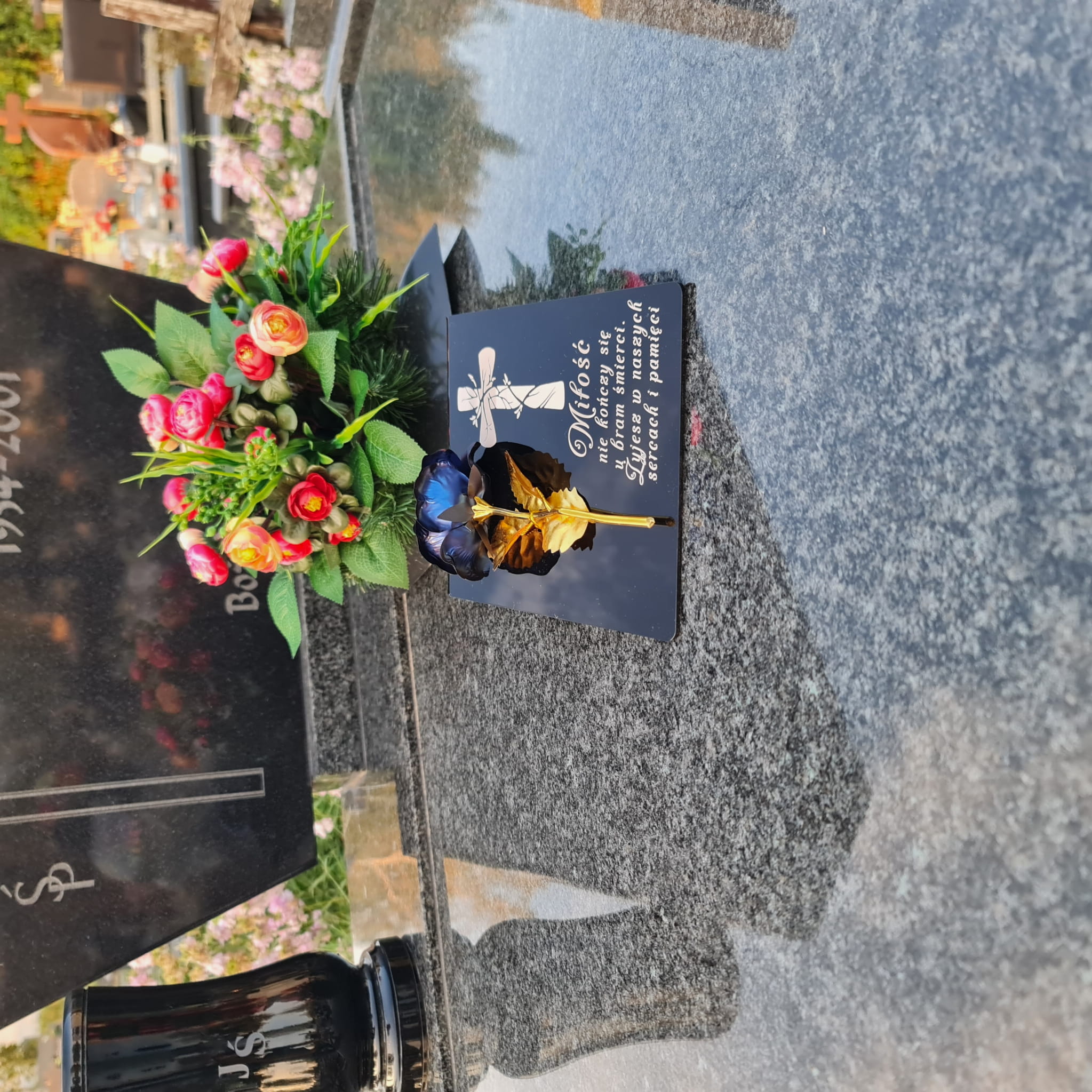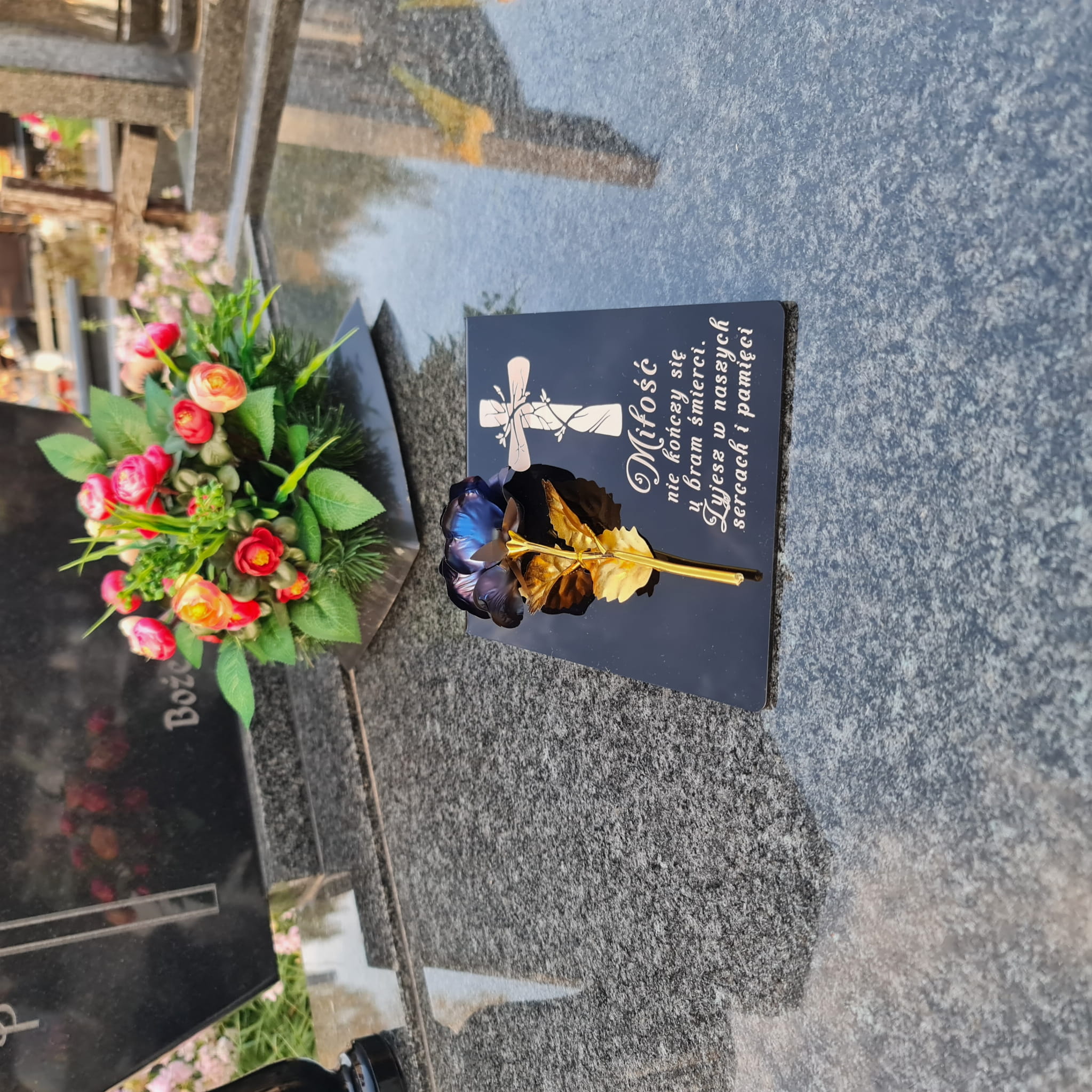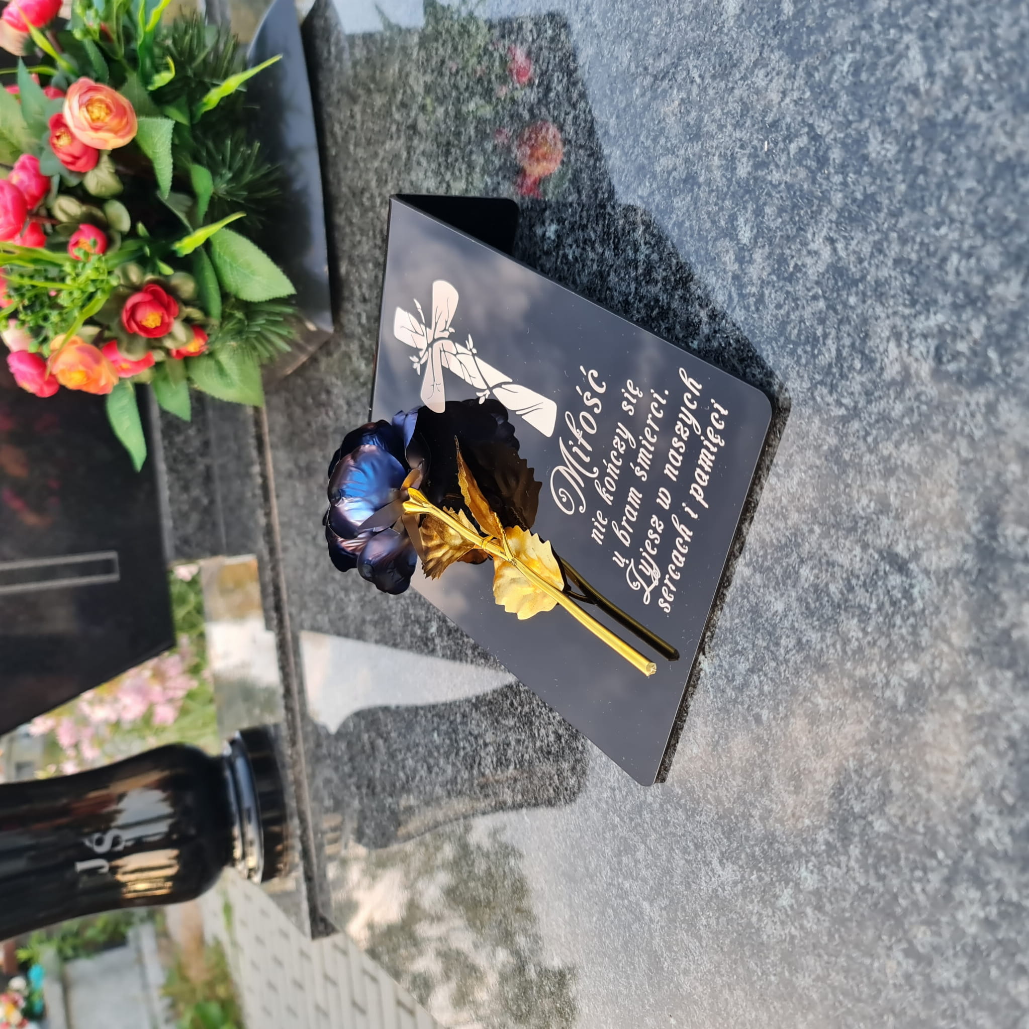 Postument został wykonany ze szkła akrylowego, ozdobiony metaliczną wieczną różą.