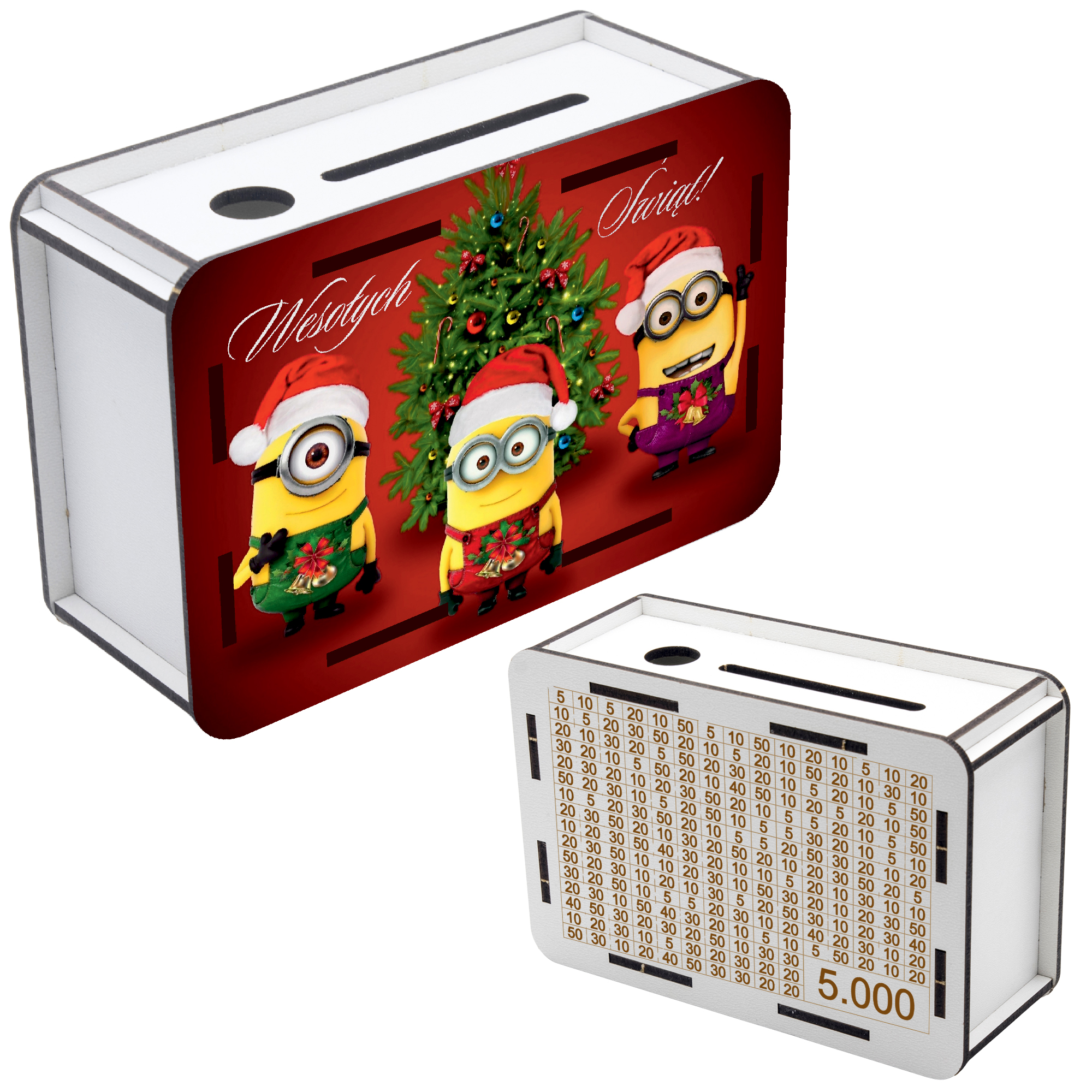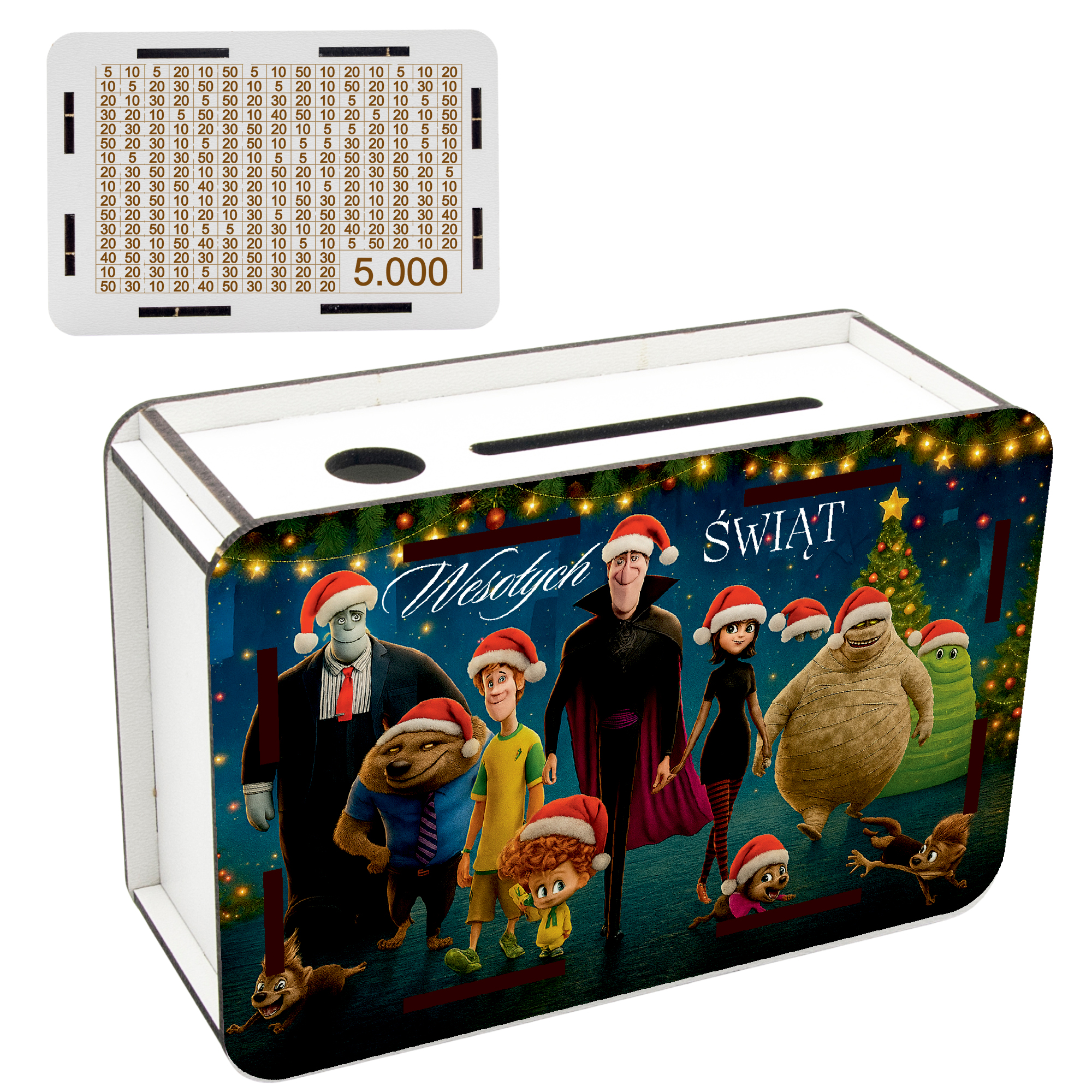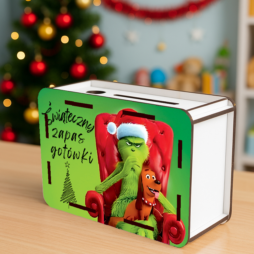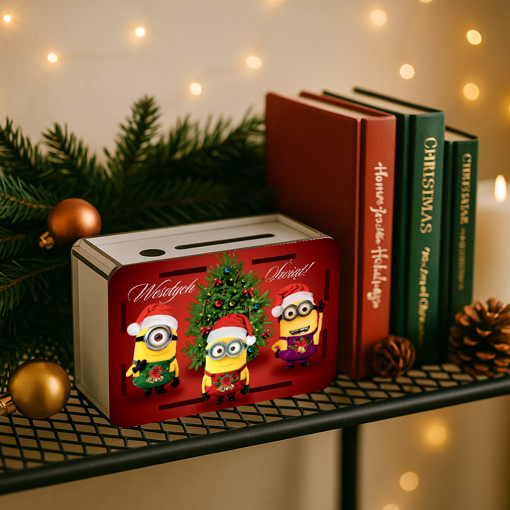 Świąteczna Skarbonka z nadrukiem + tylna grawerowana ścianka z wykreślanką kwot!