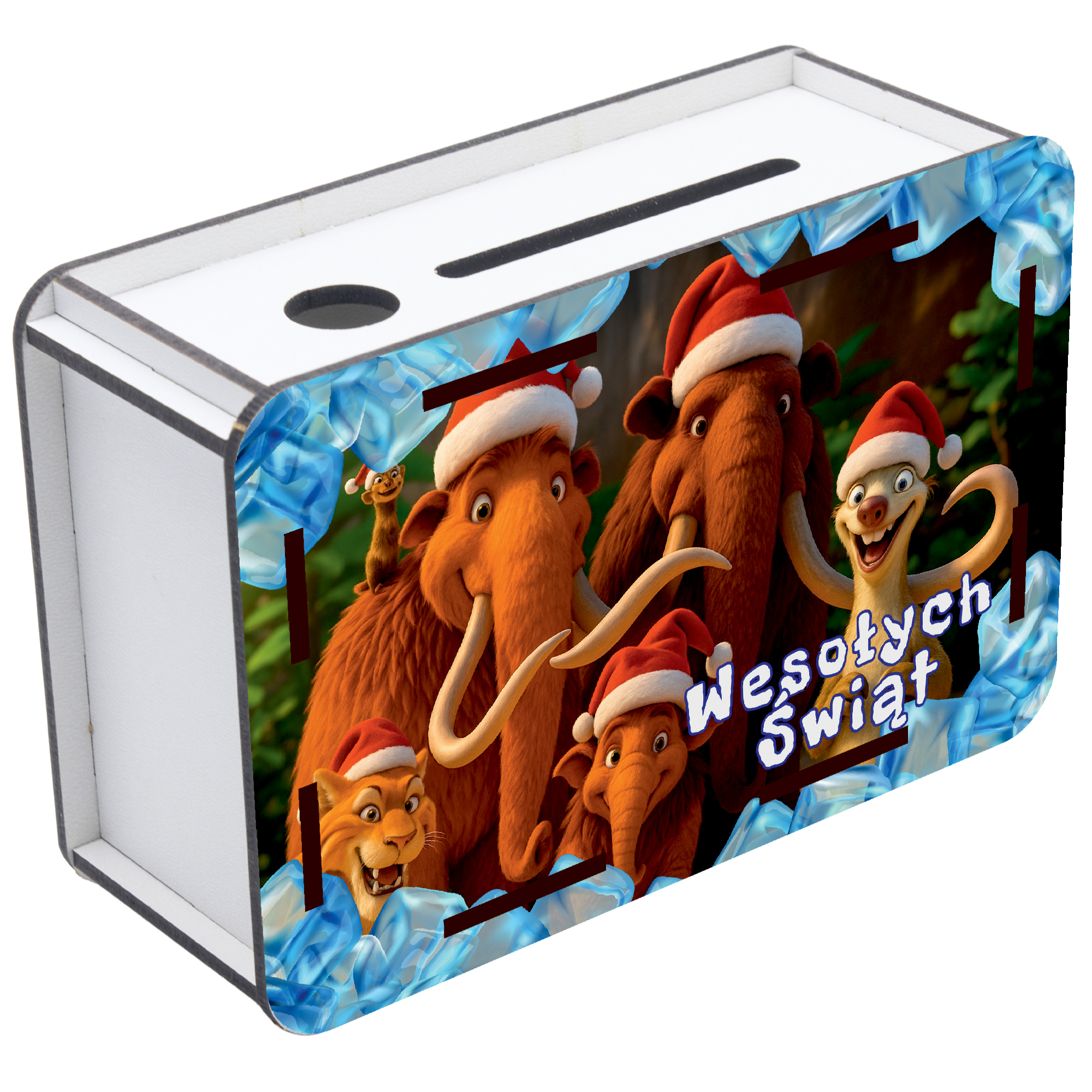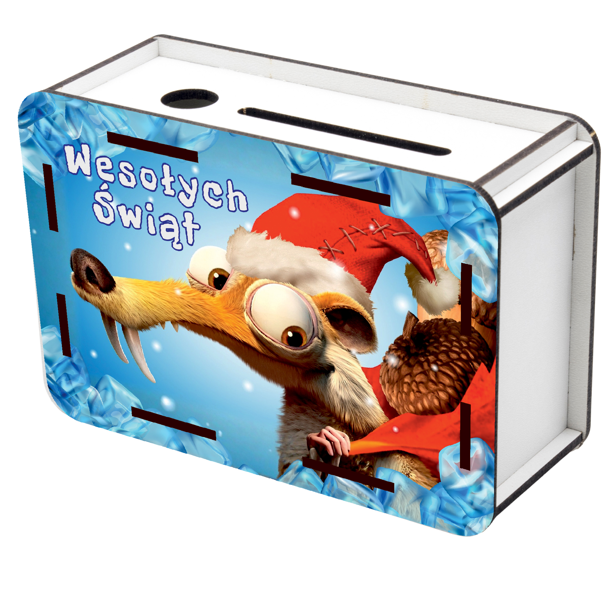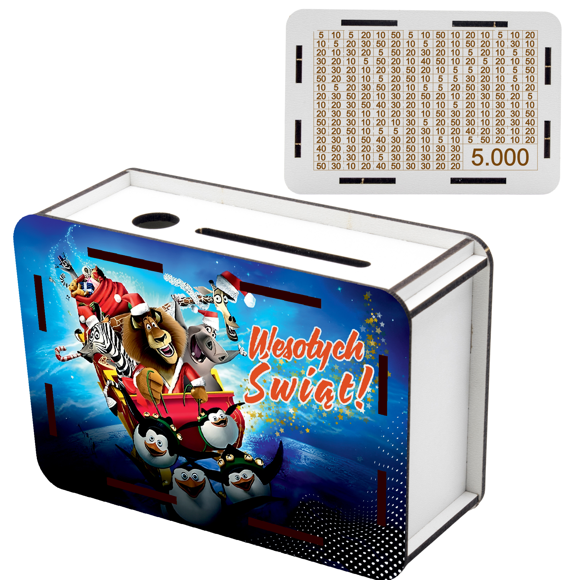 Świąteczna Skarbonka z nadrukiem + tylna grawerowana ścianka z wykreślanką kwot!