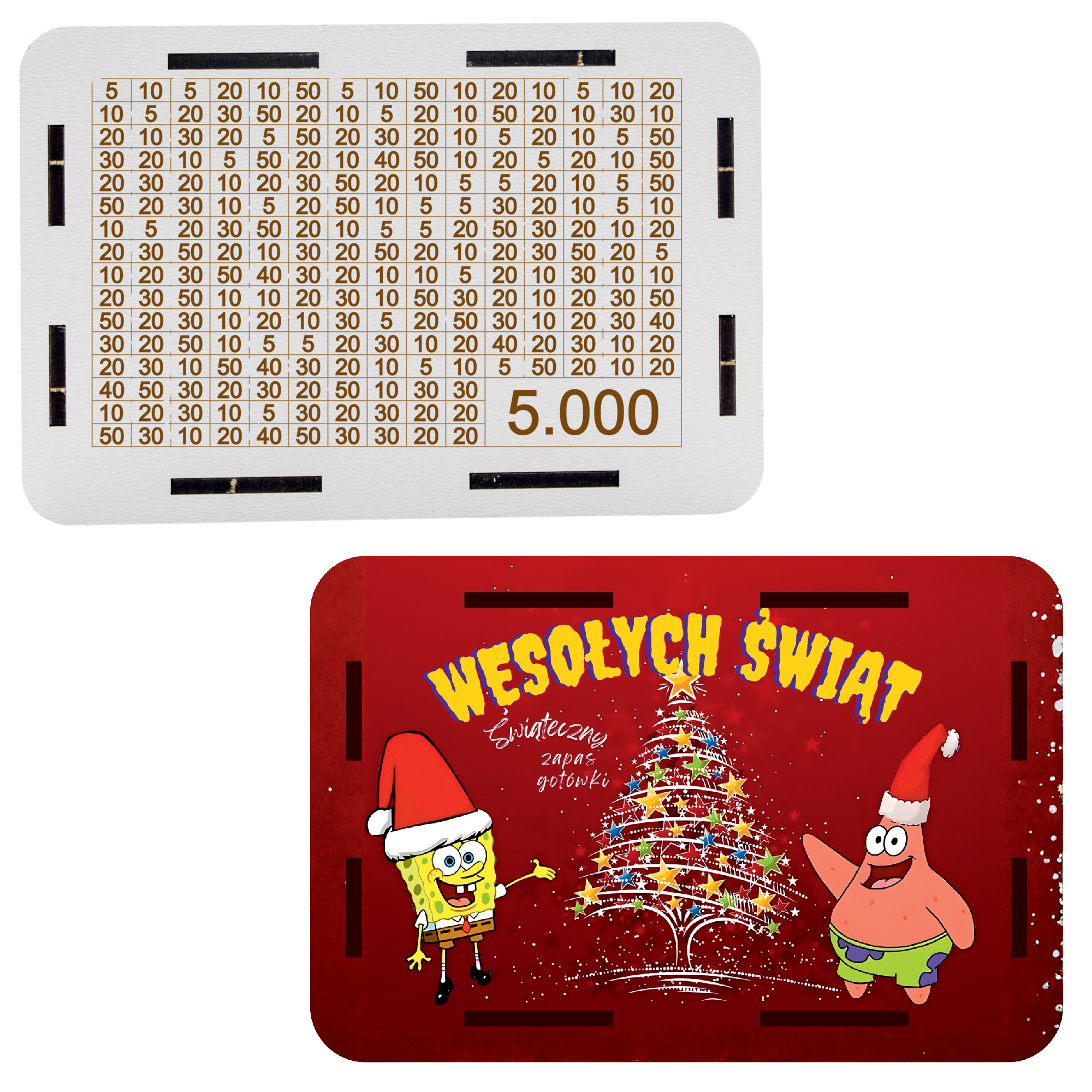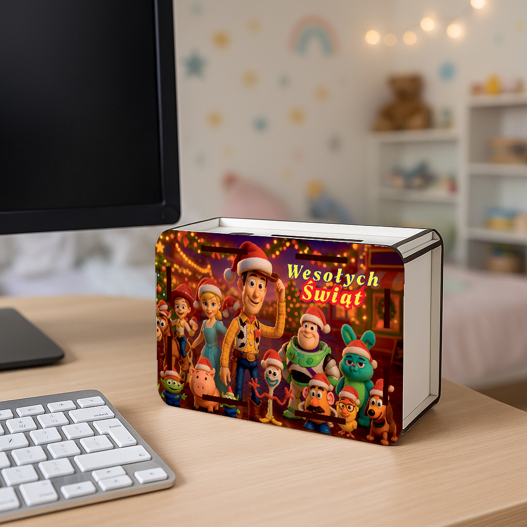 Wyjątkowy projekt łączy kolorowy, świąteczny nadruk z przodu oraz grawerowaną tylną ściankę ze specjalną tabelą kwot do wykreślania – dzięki niej oszczędzanie staje się przyjemnością i codzienną motywacją.