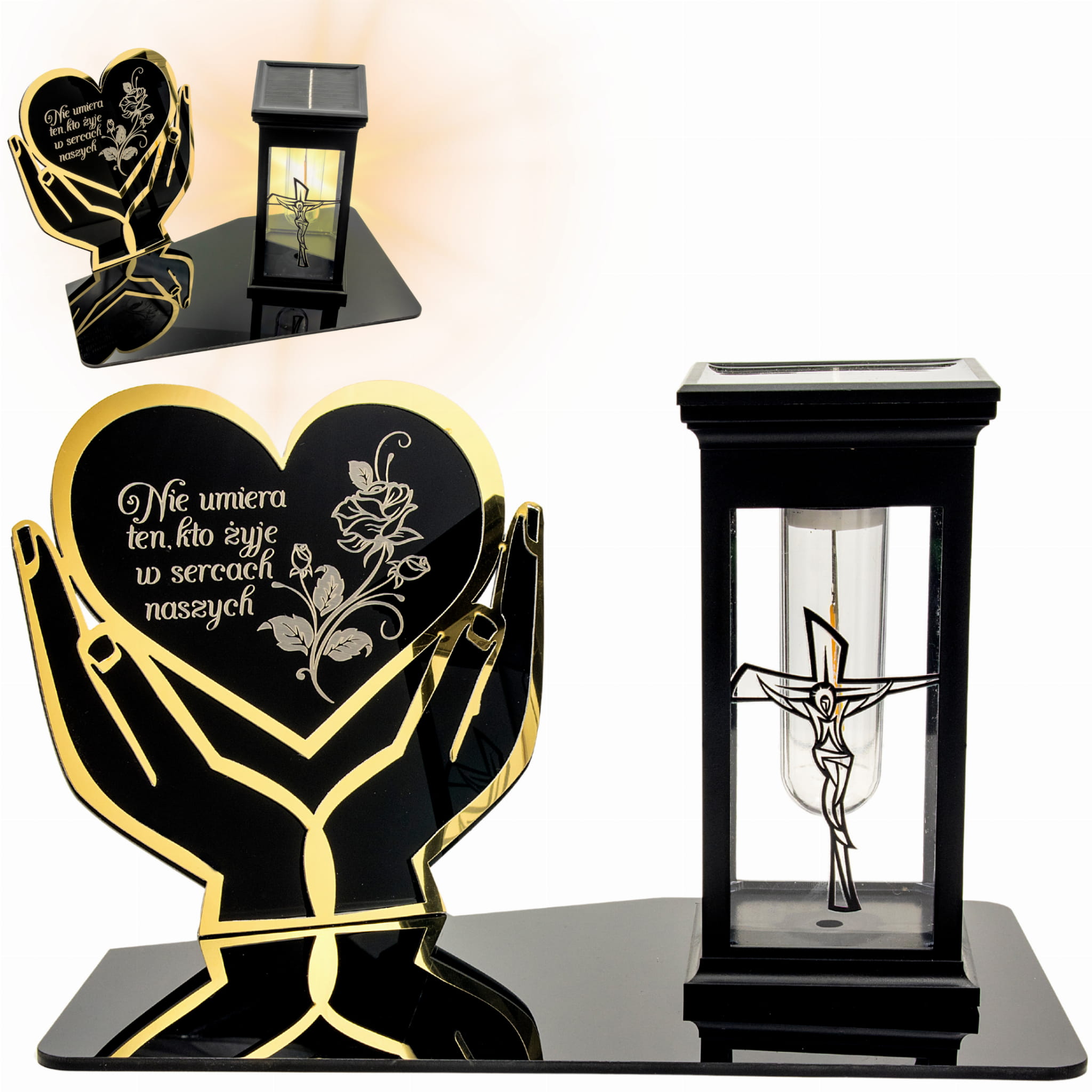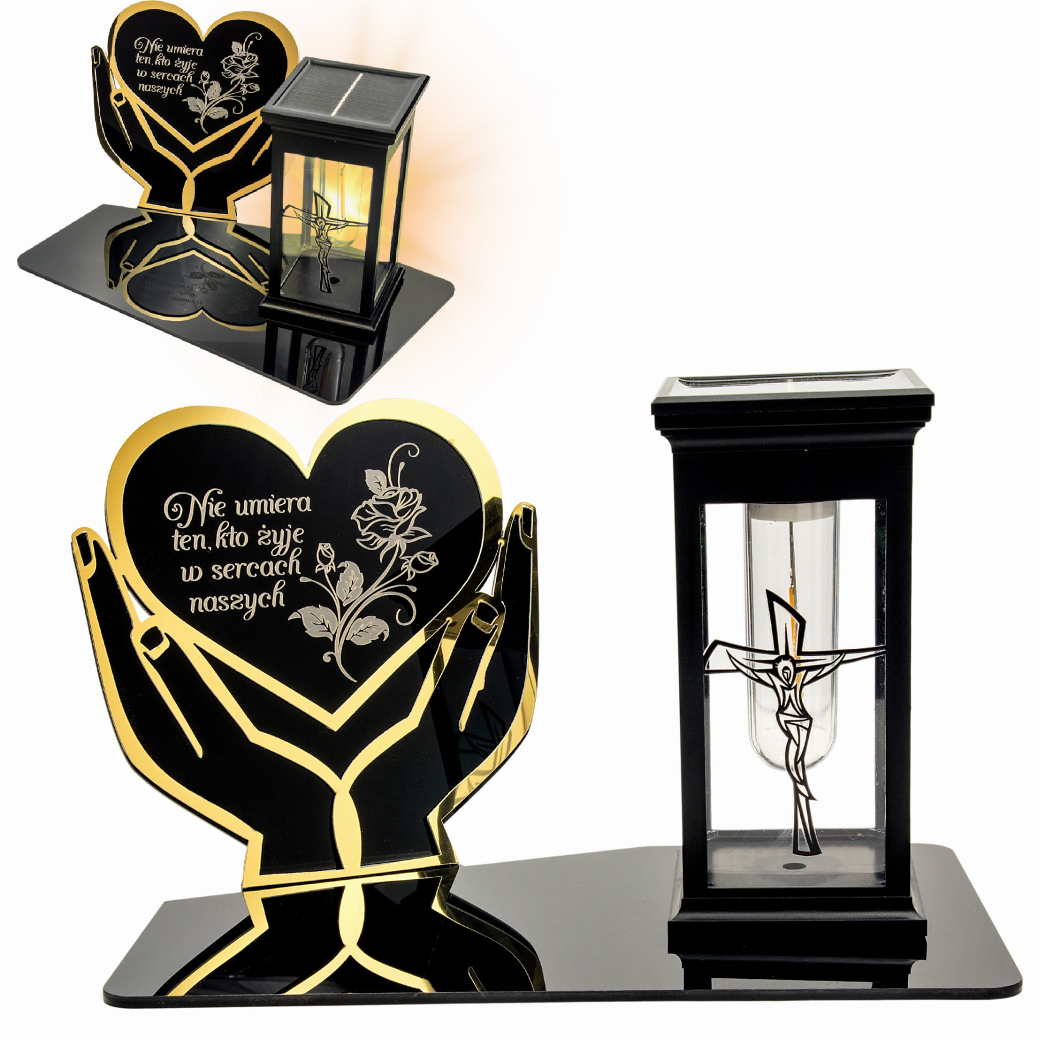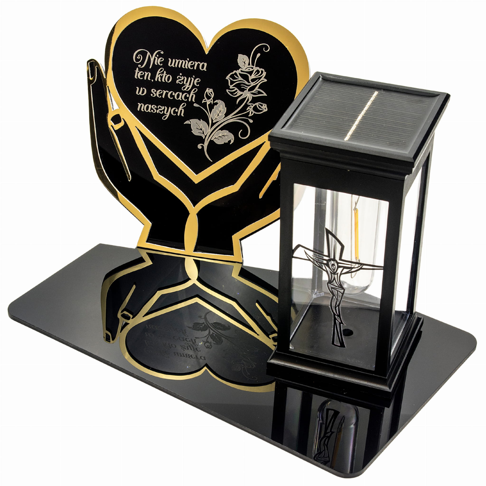 WIECZNY ZNICZ SOLARNY NA GRÓB Z GRAWEROWANĄ PODSTAWKĄ ZE SZKŁA AKRYLOWEGO OZDOBIONA MOTYWEM ZŁOTYCH RĄK Z SERCEM
