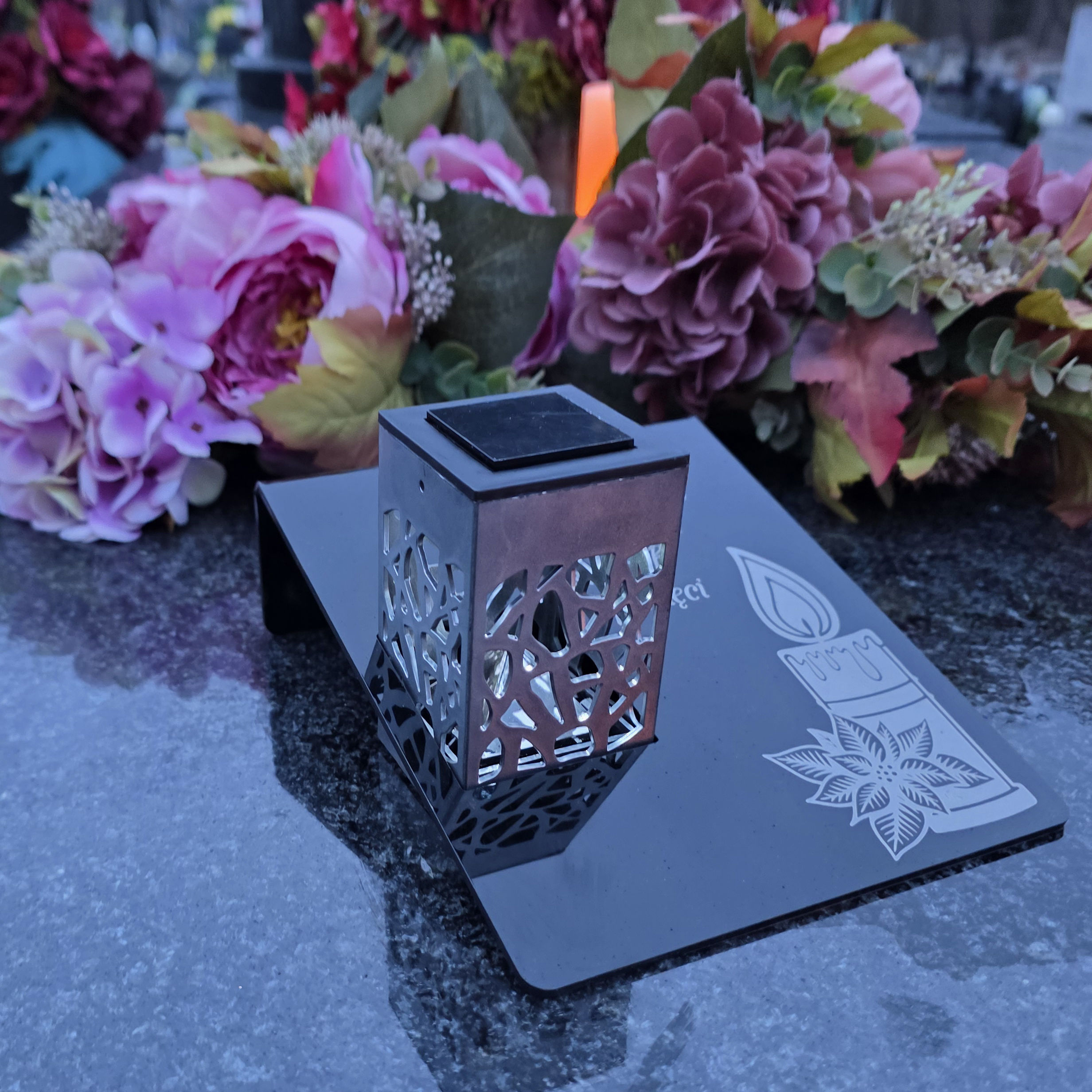 Zastosowaniu ledowej lampy słonecznej czyni znicz energooszczędnym i ekologicznym (nie wymaga wymiany baterii).