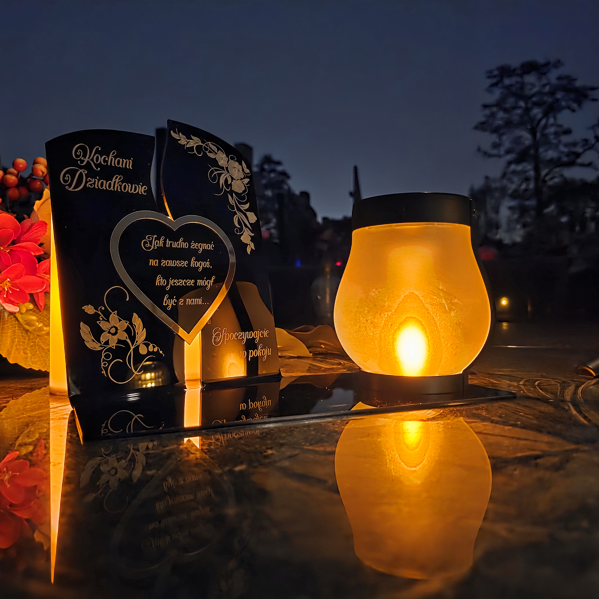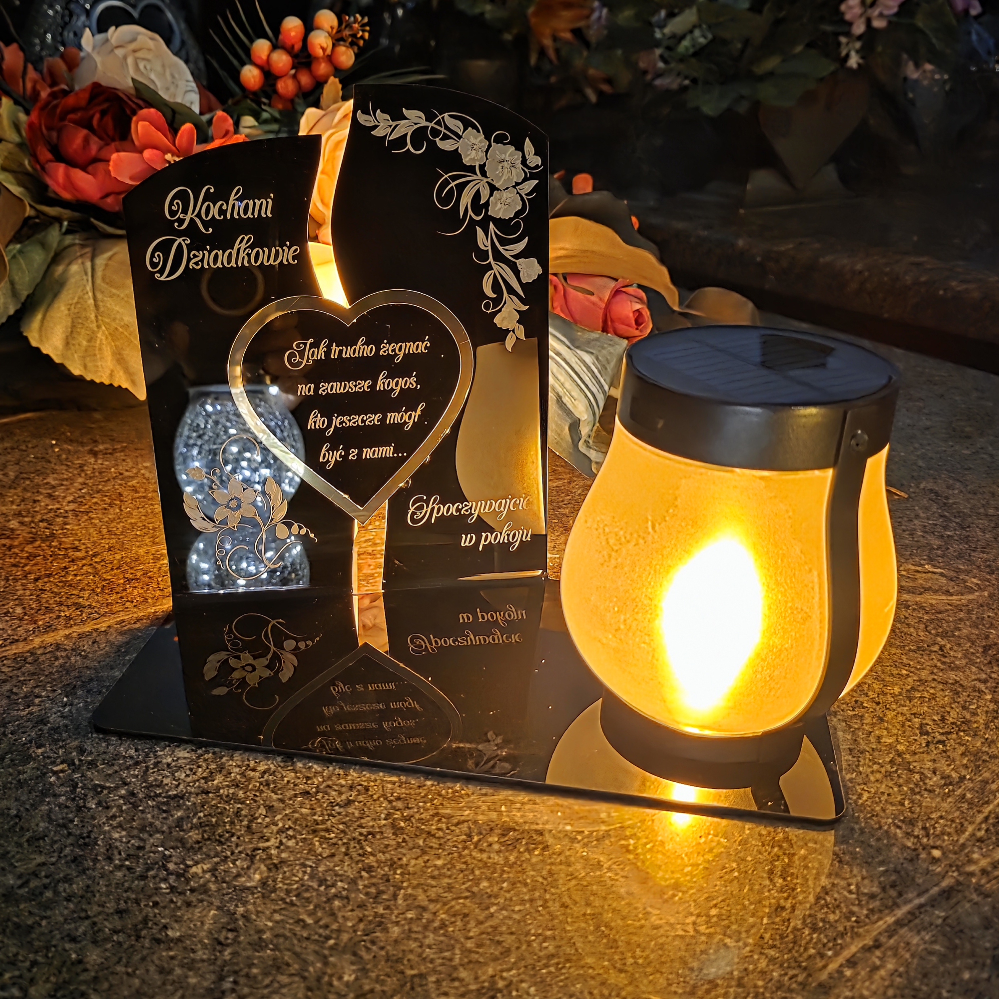Całość uzupełnia nowoczesna lampka solarna LED, która automatycznie rozświetla pomnik po zmroku ciepłym blaskiem, tworząc atmosferę zadumy i spokoju.