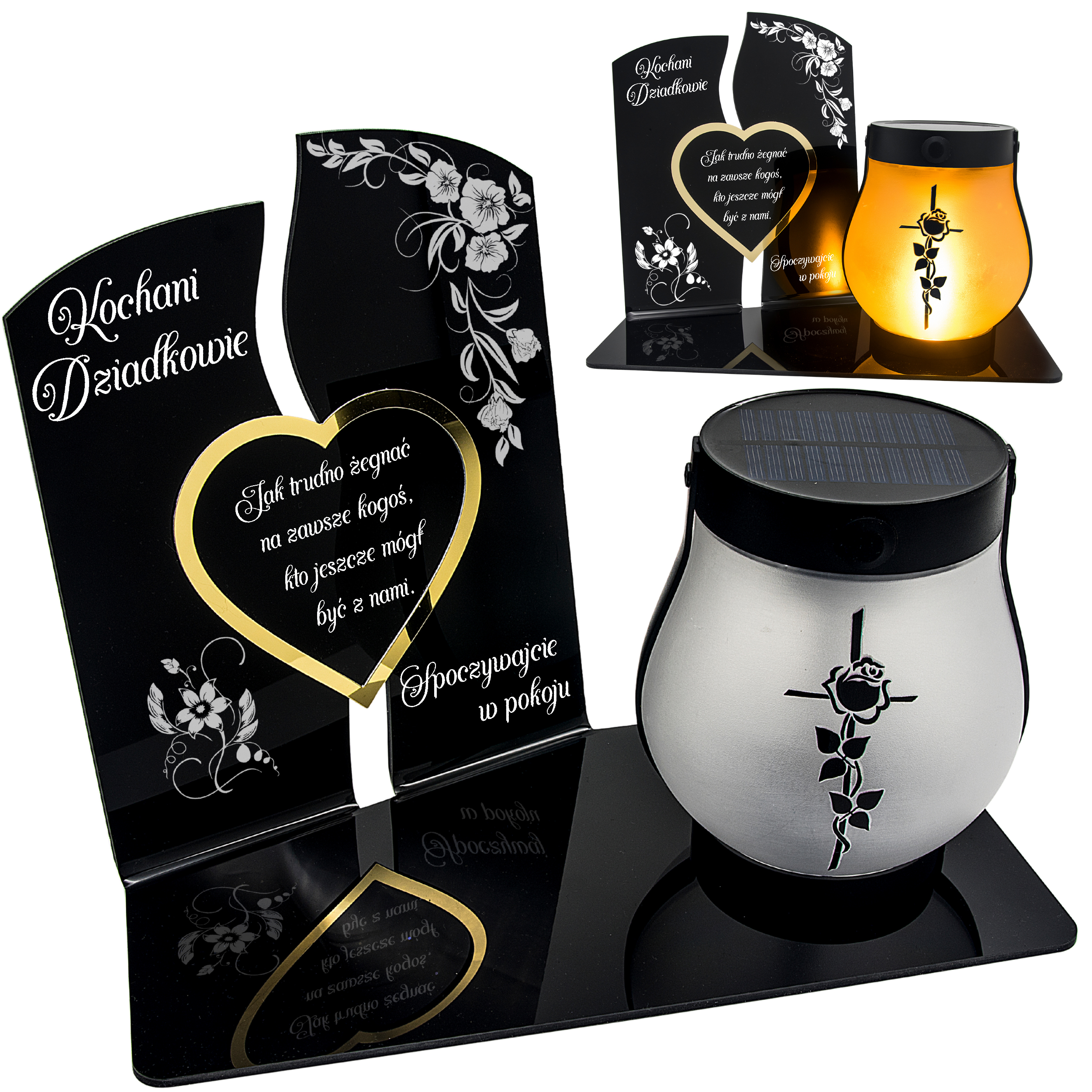 Elegancki znicz nagrobny dla Dziadków – serce ze złotymi akcentami i solarną lampką
