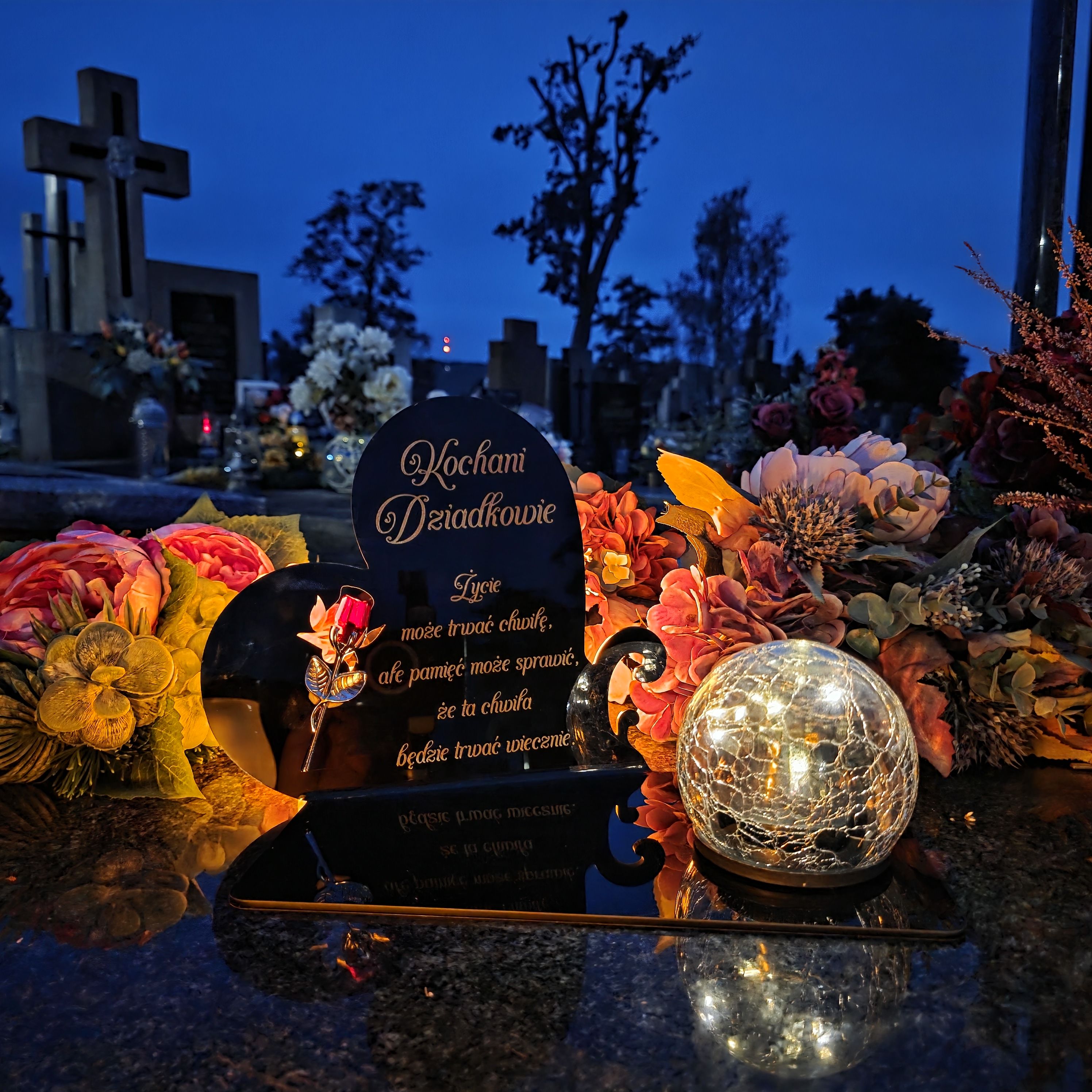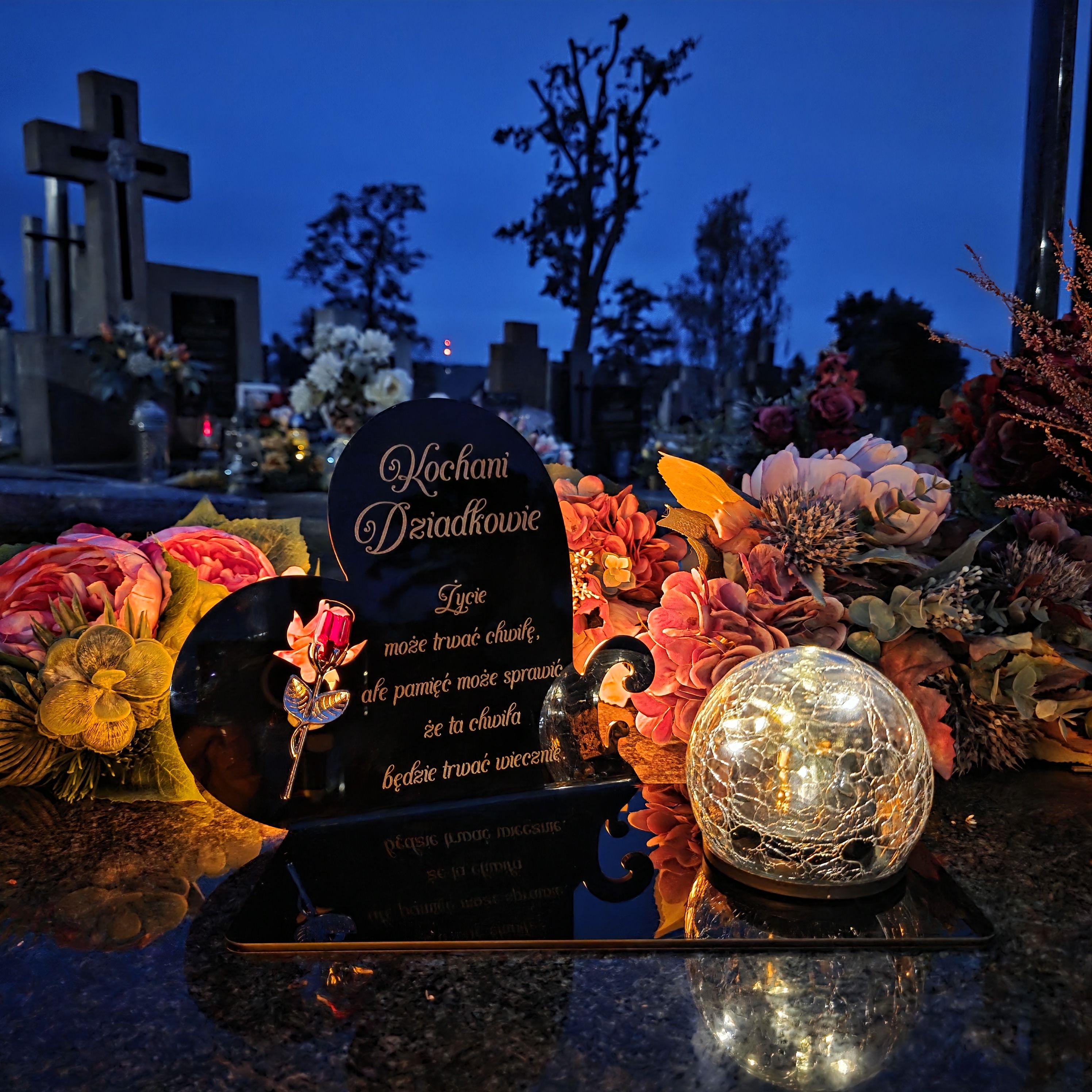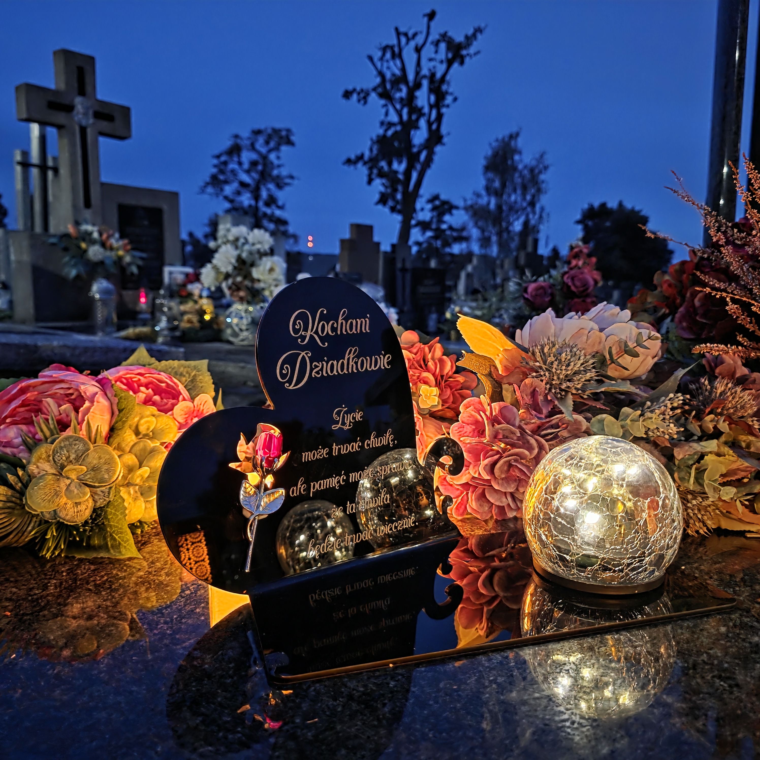Całość uzupełnia nowoczesna lampka solarna LED, która automatycznie rozświetla pomnik po zmroku ciepłym blaskiem, tworząc atmosferę zadumy i spokoju.