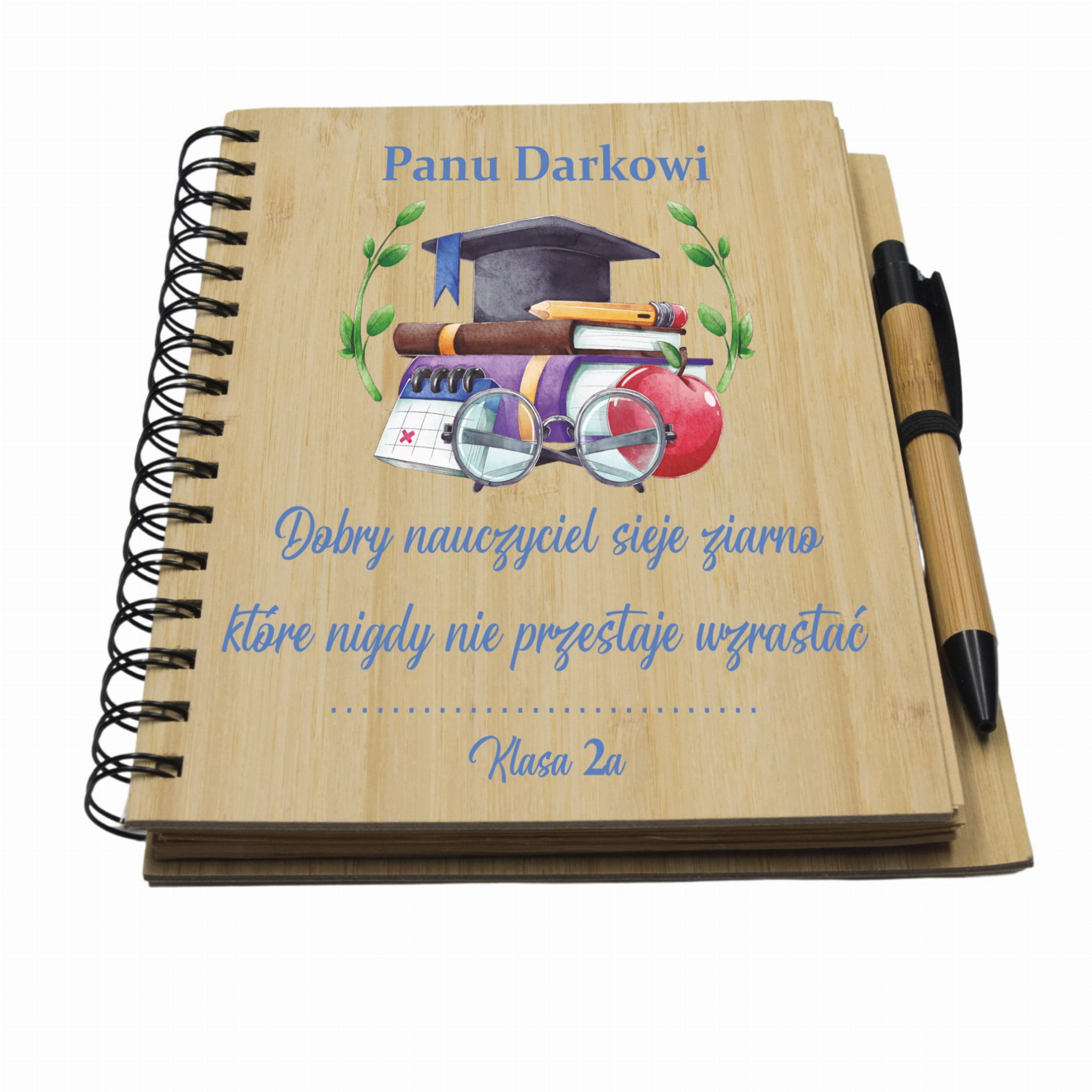 Oferujemy Państwu eleganckie bambusowe notatniki z grawerem laserowym lub profesjonalnym nadrukiem UV. Taki notatnik idealnie sprawdzi się jako prezent na dzień nauczyciela.