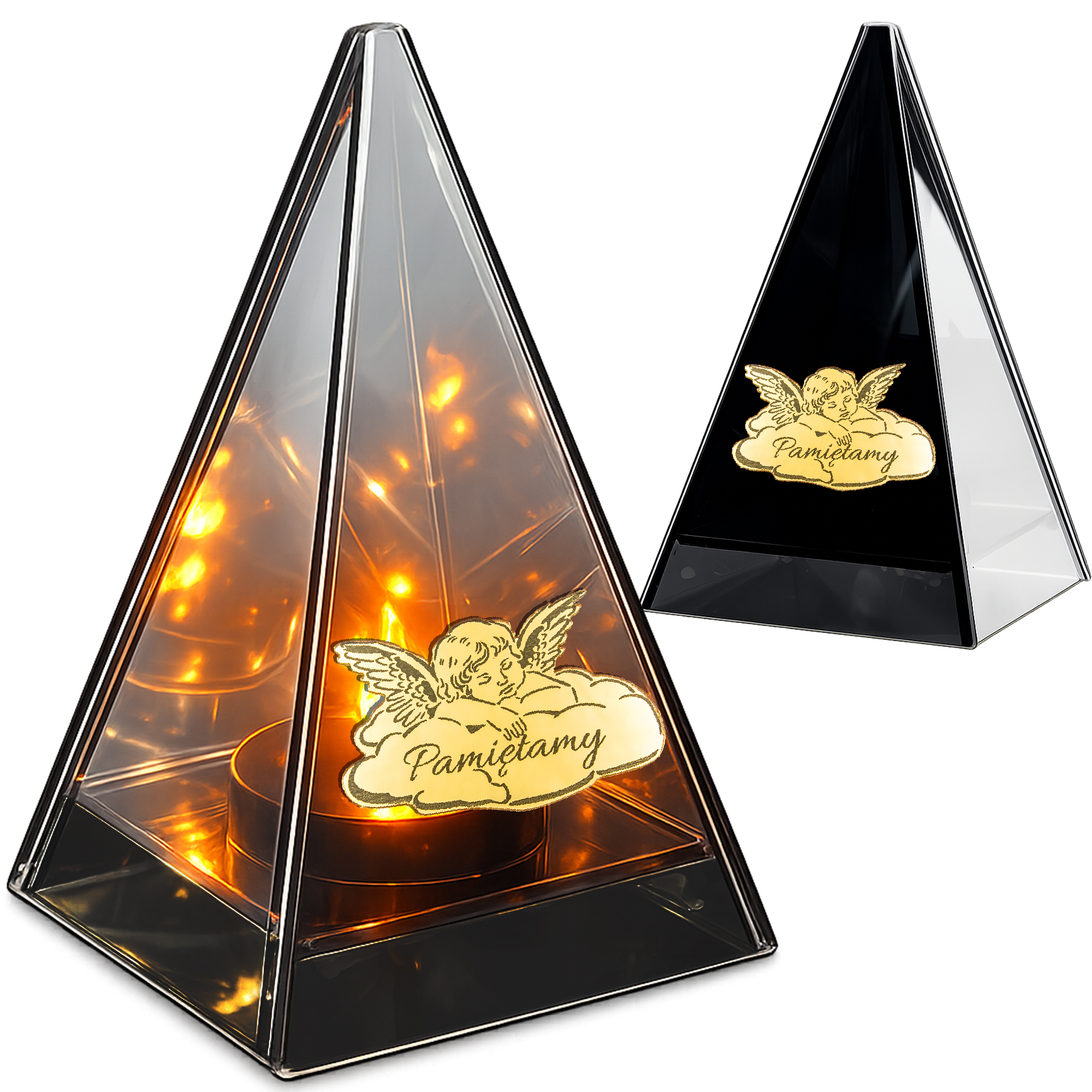 Ekskluzywny znicz LED w formie piramidy to wyjątkowa dekoracja nagrobna, która łączy minimalistyczny styl z luksusowym wykończeniem. Przyciemniane szkło typu lustro weneckie oraz złoty panel nadają mu elegancki, nowoczesny charakter.