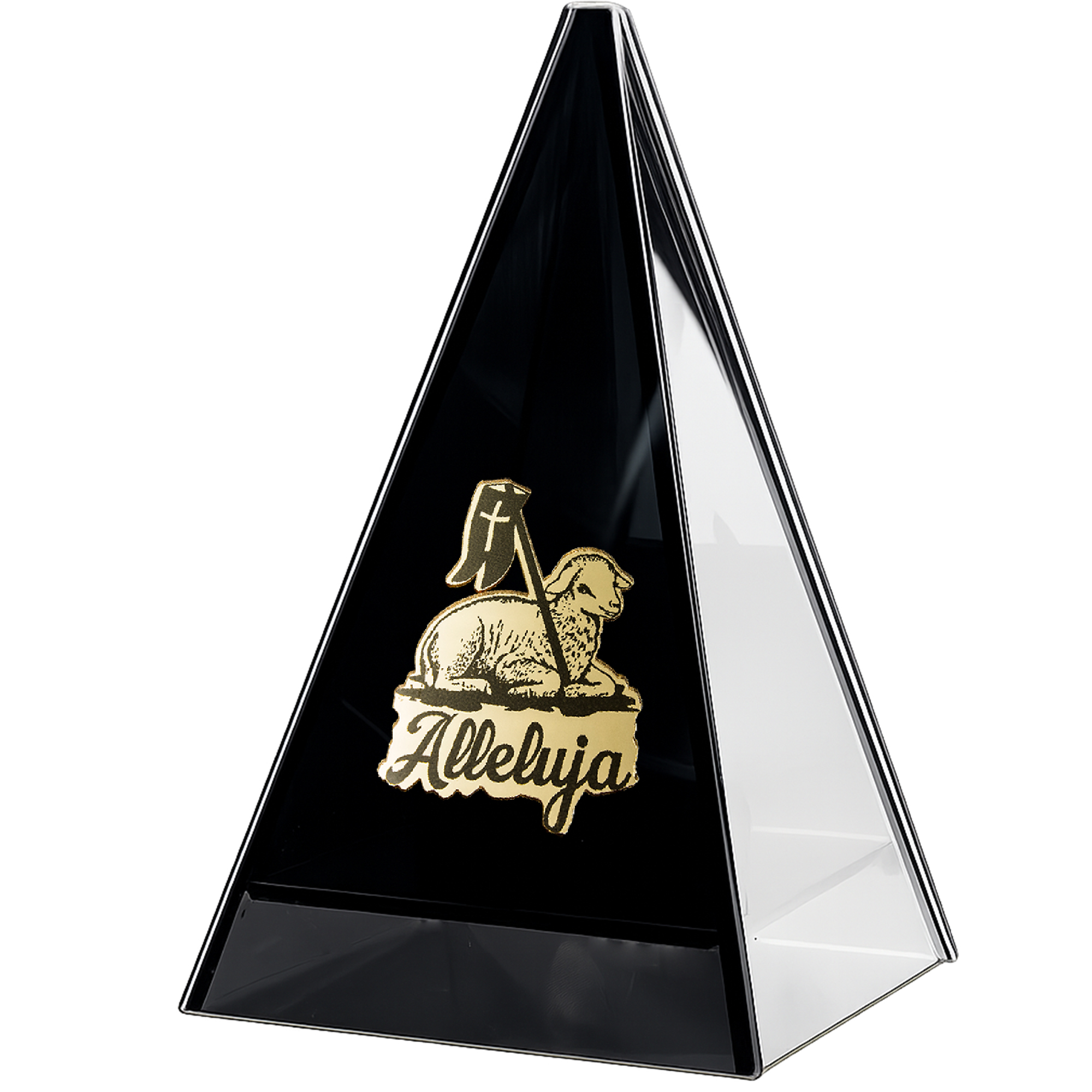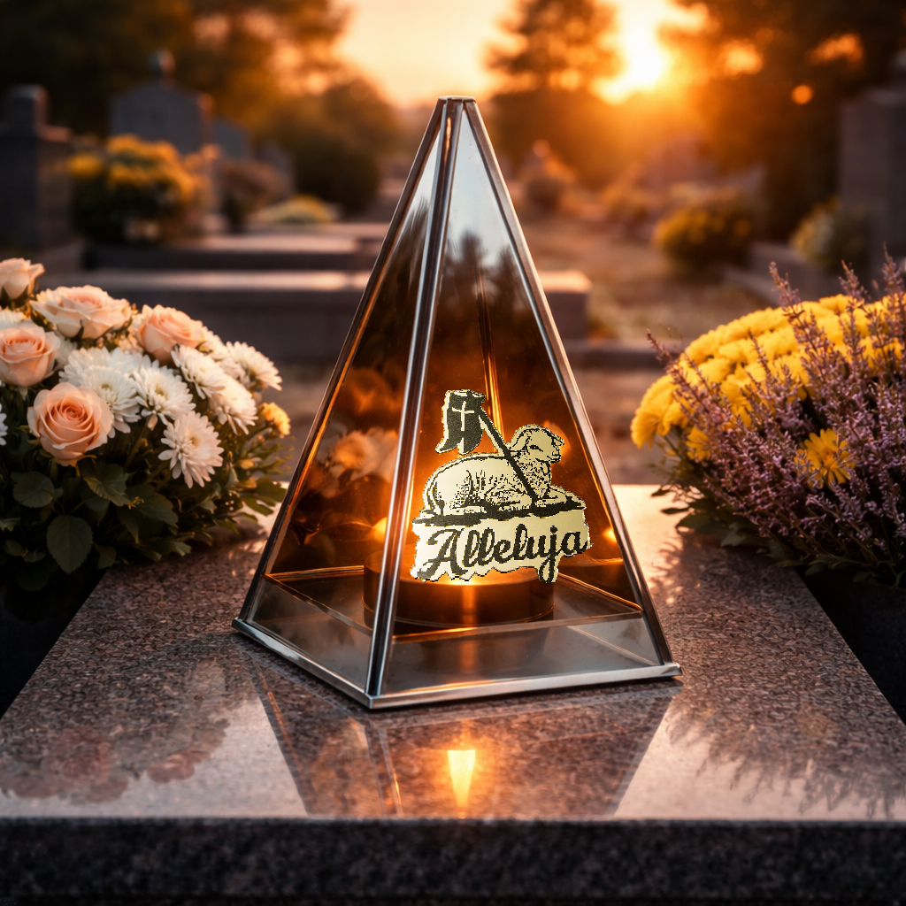 Subtelna grafika z BARANKIEM i napisem „Alleluja” w złotym kolorze sprawia, że znicz jest szczególnie pięknym akcentem na okres wielkanocny, a jednocześnie pozostaje elegancką ozdobą nagrobka przez cały rok.