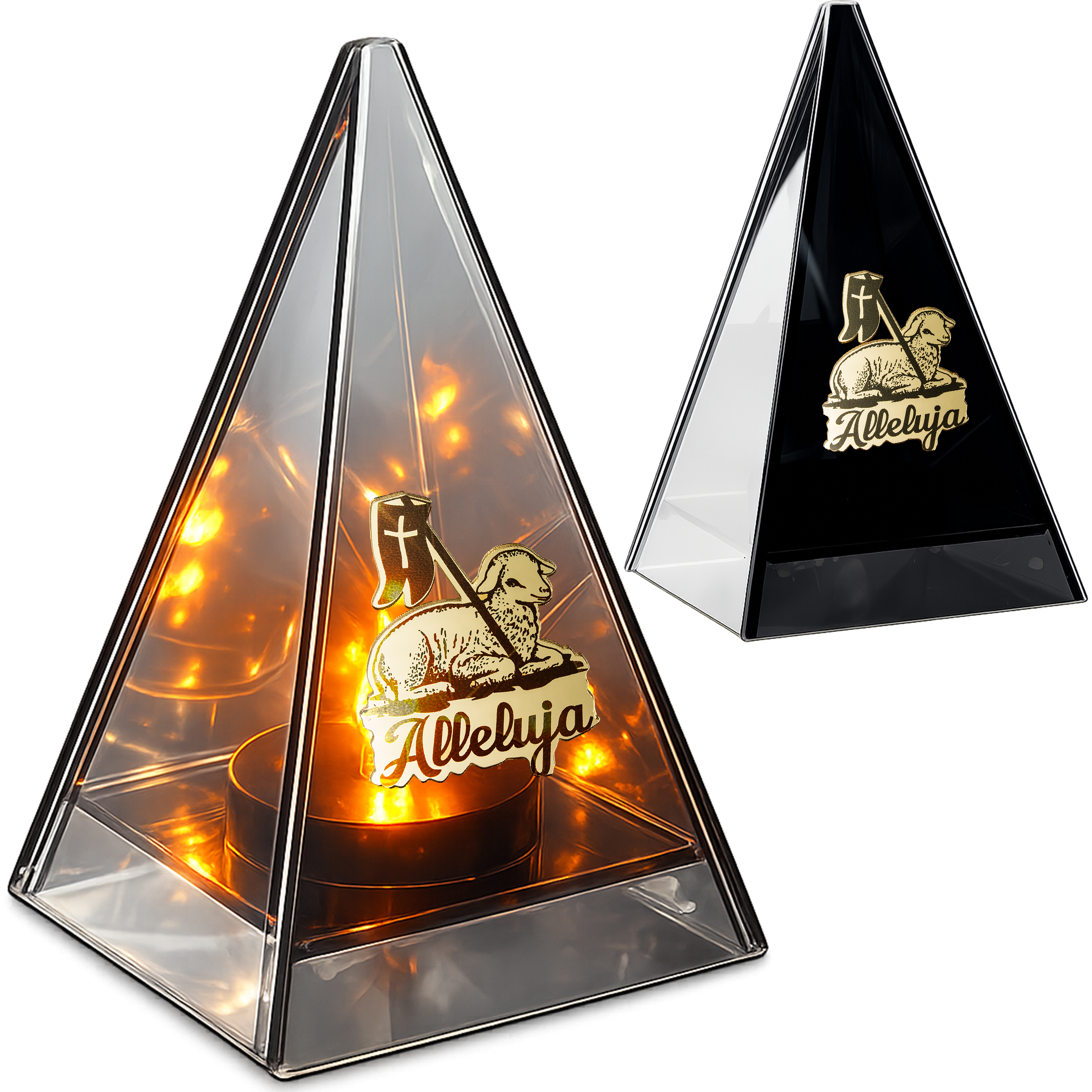 Nowoczesny znicz LED w eleganckiej formie piramidy to wyjątkowa dekoracja nagrobna, która łączy minimalistyczny design, ciepłe światło i symboliczny złoty detal. Dzięki zastosowaniu przyciemnianego szkła typu lustro weneckie oraz efektowi odbicia światła wewnątrz konstrukcji powstaje niezwykła głębia płomienia 3D, która przyciąga wzrok zarówno w dzień, jak i po zmroku.