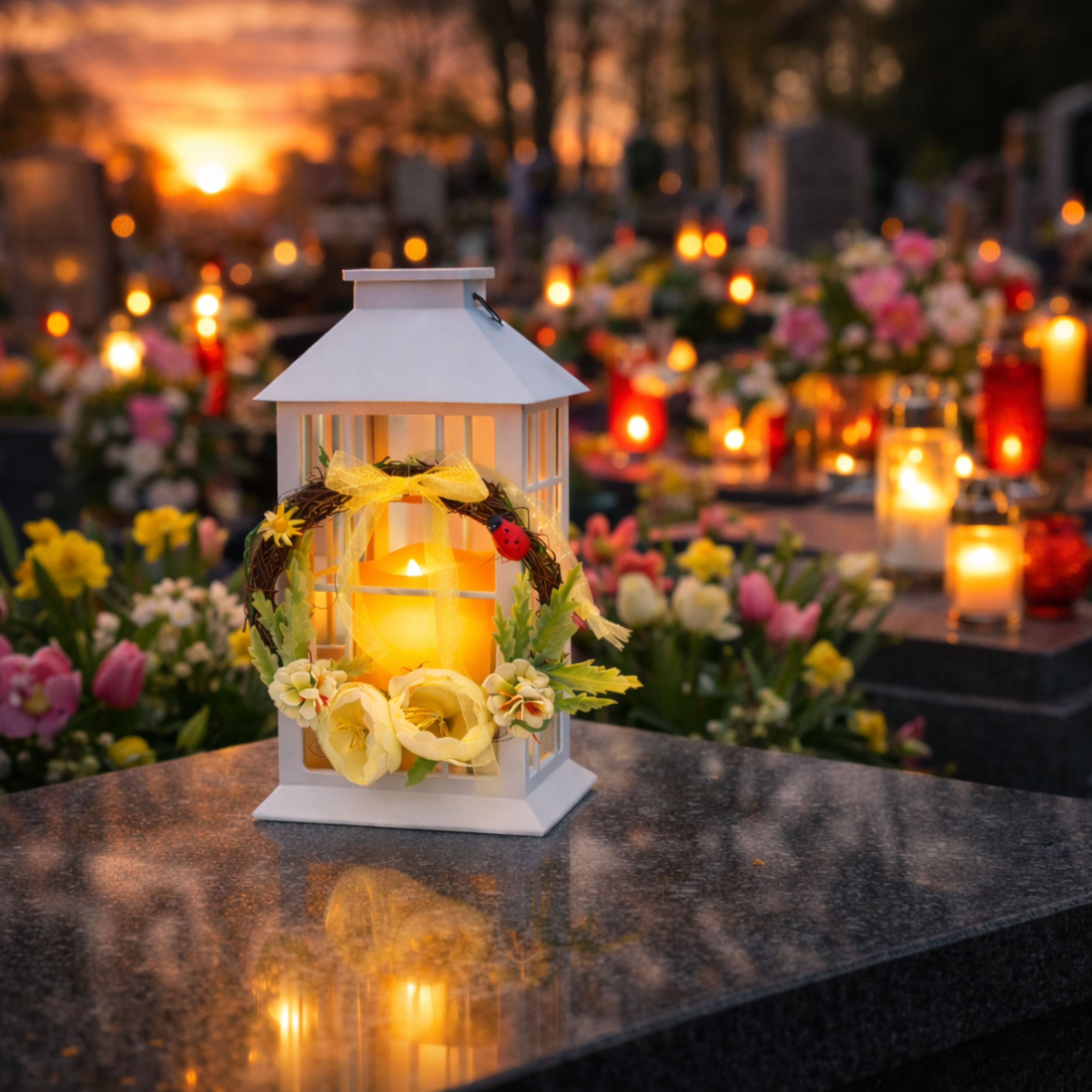 Elegancki znicz lampion na grób – ciepłe światło LED