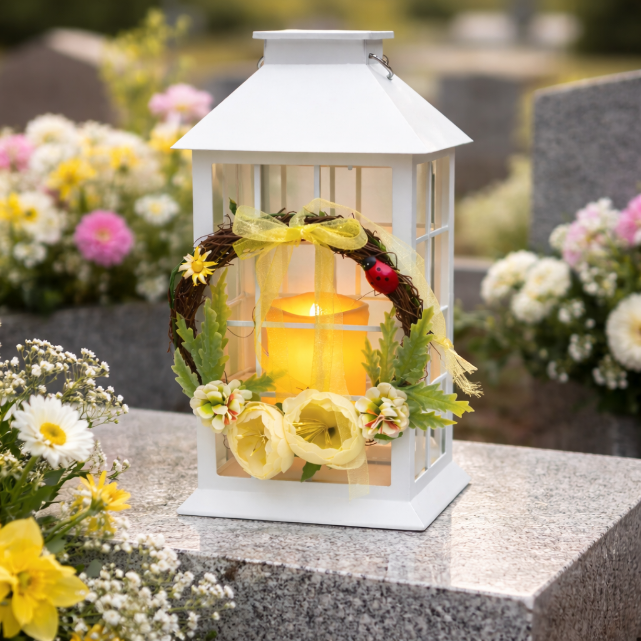 Ta stylowa latarenka solarna z wiosennym wiankiem kwiatowym to połączenie klasycznego znicza z nowoczesną technologią LED.