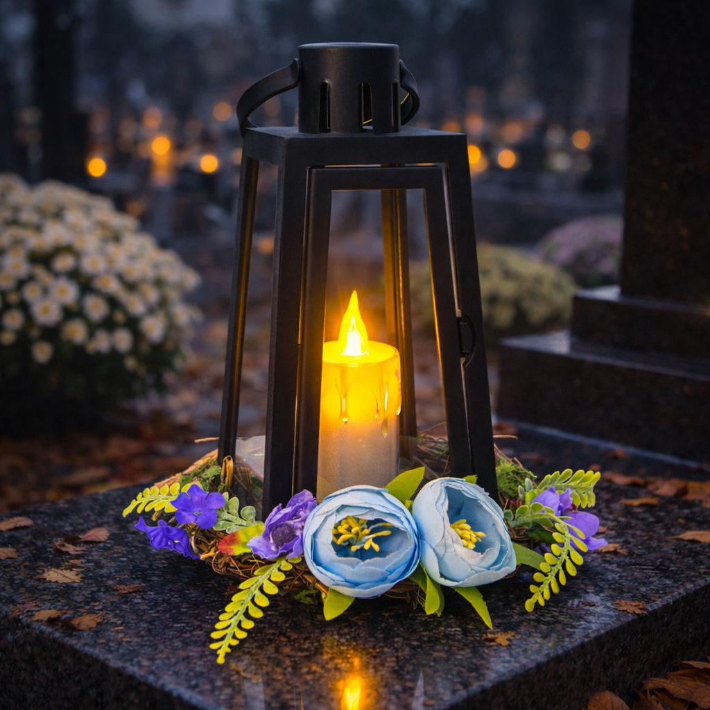 Elegancki znicz dekoracyjny w formie lampionu to piękna i subtelna ozdoba grobu, która łączy tradycję z nowoczesnym oświetleniem LED. Ciepłe światło świecy tworzy spokojną, nastrojową atmosferę pamięci i zadumy. Całość uzupełnia ozdobny wianek z kwiatów w wiosennych kolorach, który nadaje kompozycji wyjątkowego charakteru.