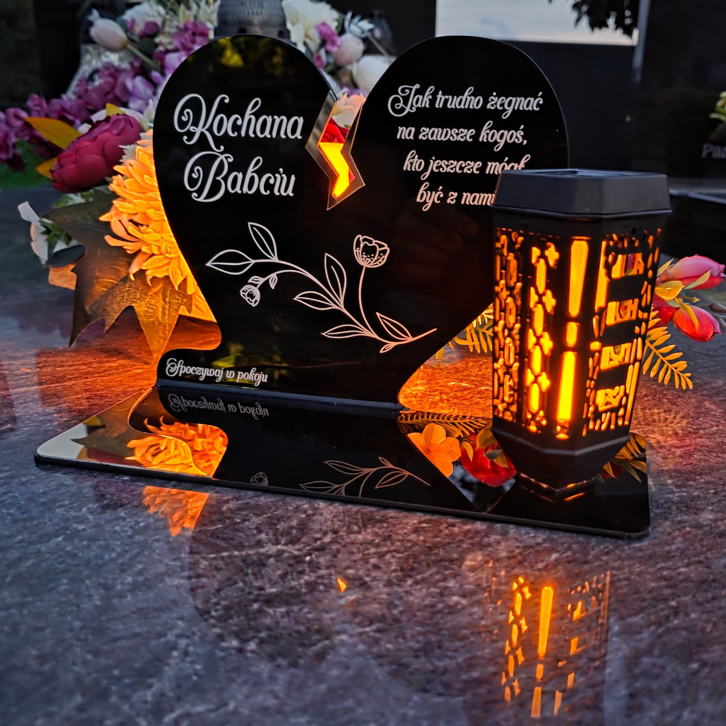 Ten wyjątkowy znicz nagrobny w formie czarnego serca z delikatnym złotym pęknięciem to piękny symbol miłości i pamięci, która nigdy nie gaśnie. Dedykacja „Kochana Babciu” oraz subtelny motyw kwiatowy nadają całości wzruszającego i eleganckiego charakteru. Zestaw dopełnia nowoczesna lampka solarna LED, która po zmroku rozświetla pomnik ciepłym blaskiem, tworząc atmosferę zadumy i spokoju.