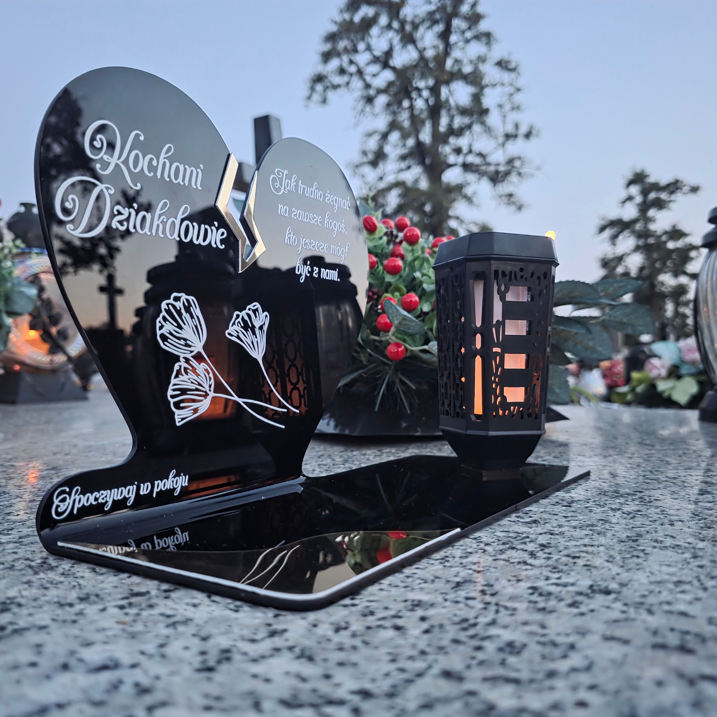 Ten wyjątkowy znicz nagrobny w formie czarnego serca z delikatnym złotym pęknięciem to piękny symbol miłości i pamięci, która nigdy nie gaśnie. Dedykacja „Kochani Dziadkowie” oraz subtelny motyw kwiatowy nadają całości wzruszającego i eleganckiego charakteru. Zestaw dopełnia nowoczesna lampka solarna LED, która po zmroku rozświetla pomnik ciepłym blaskiem, tworząc atmosferę zadumy i spokoju.