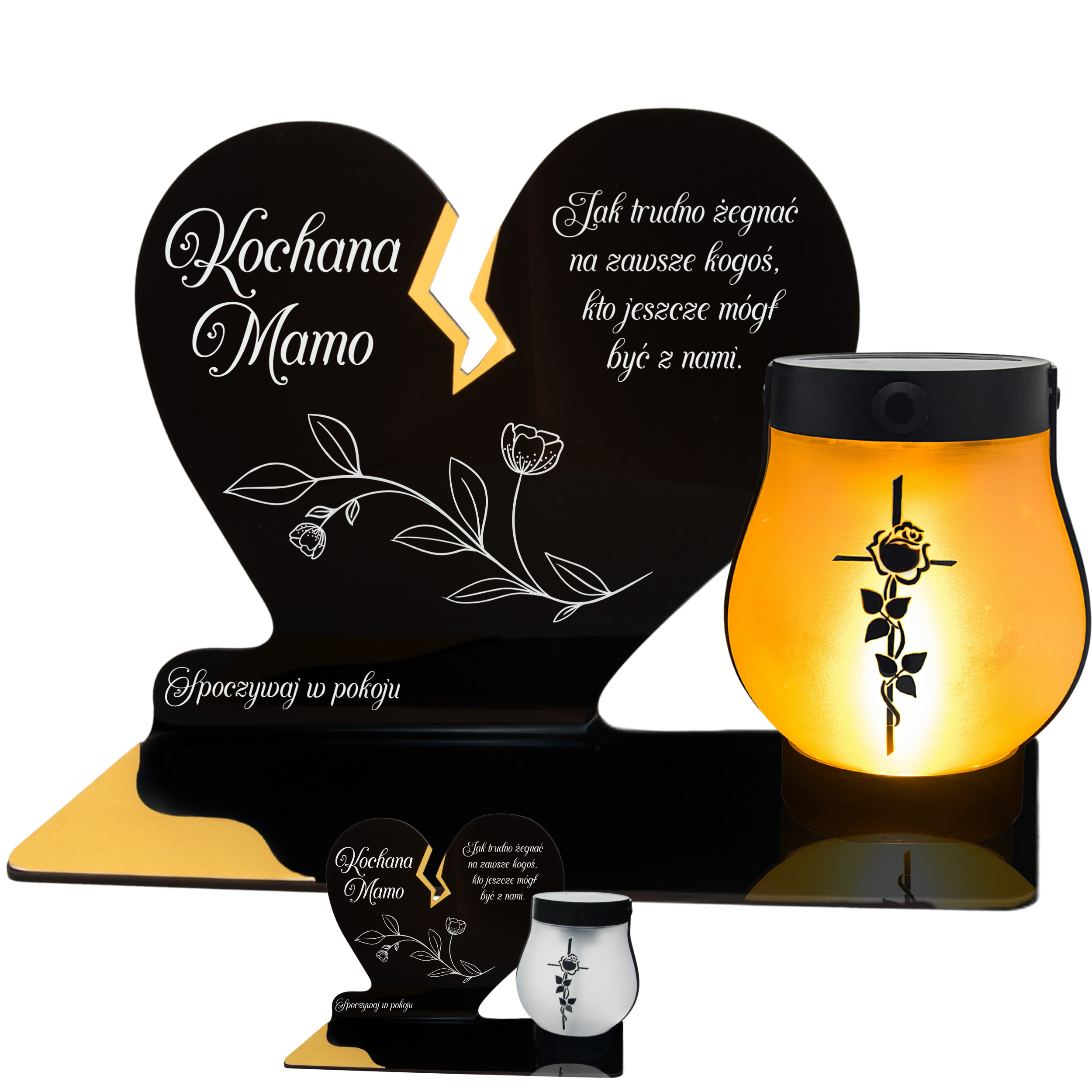 Elegancki znicz nagrobny dla Mamy– serce ze złotymi akcentami i solarną lampką LED